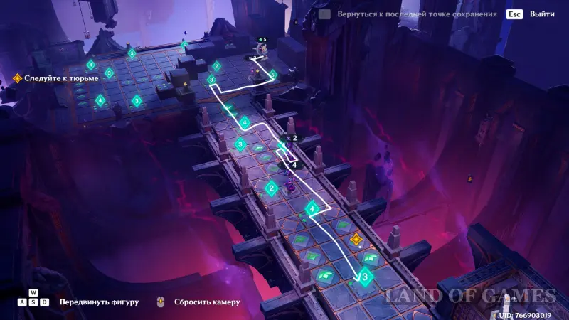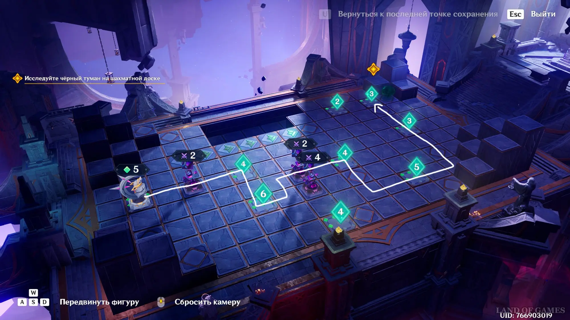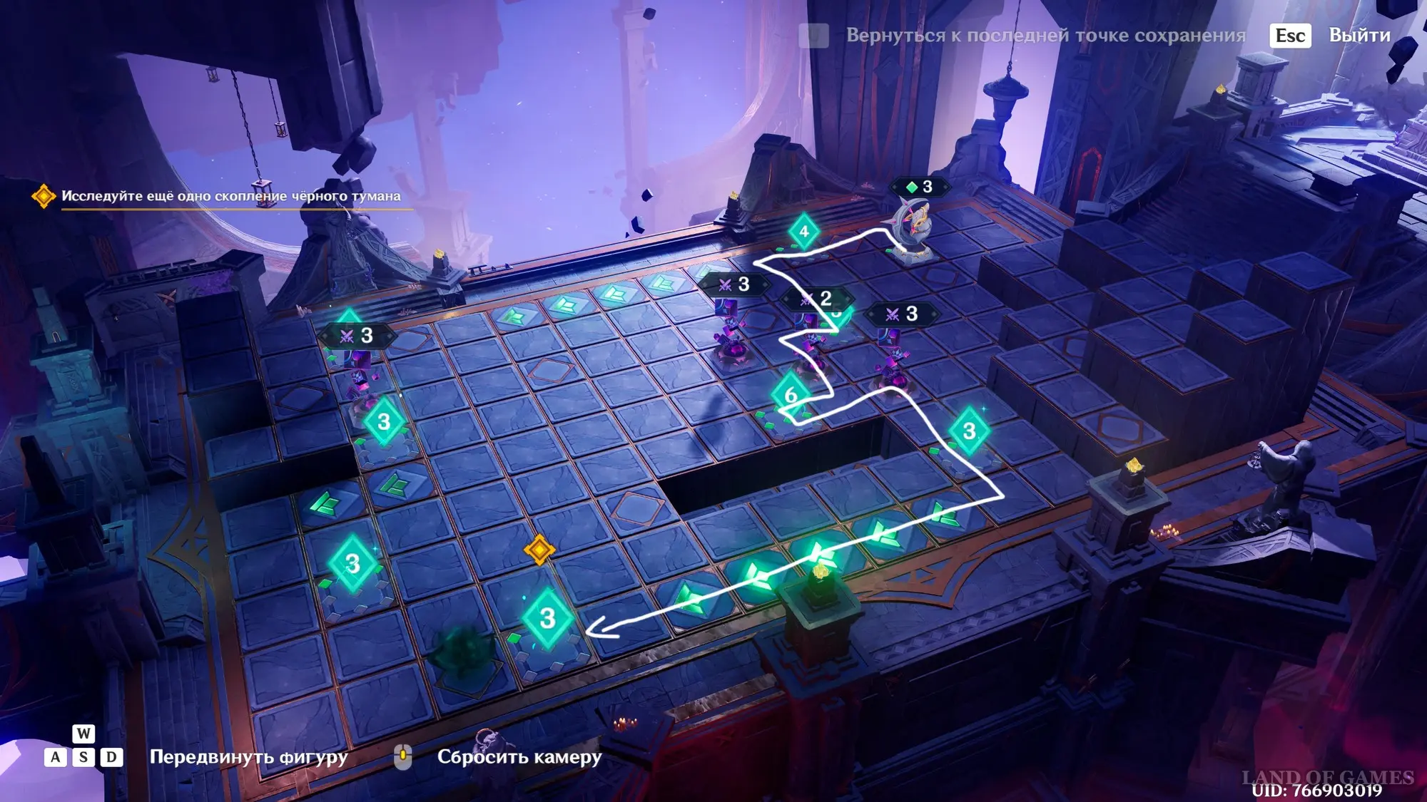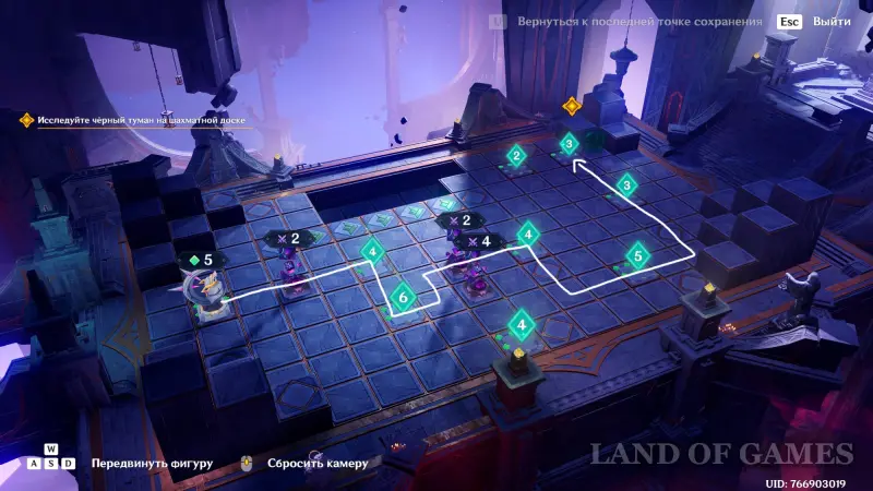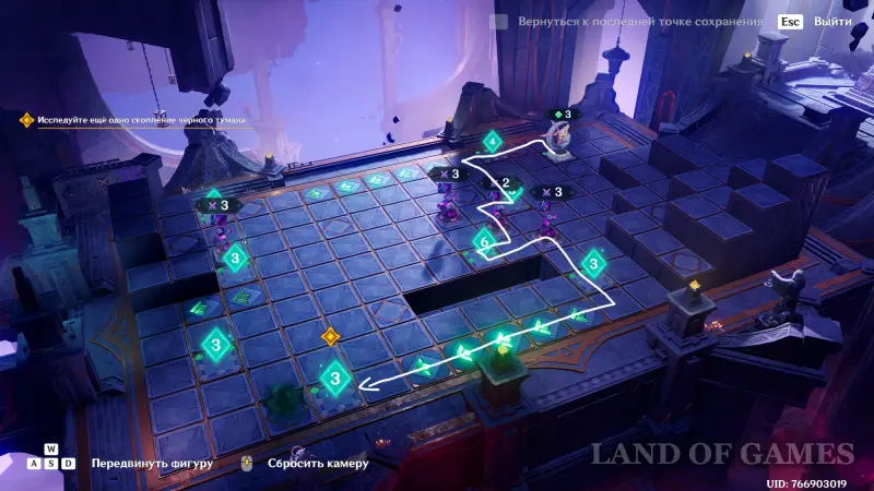 После просмотра новой кат-сцены с Толиндис вам необходимо будет достичь следующего сгустка тумана. Для этого пройдите через плитки с цифрами «4», «5» и «6», разобравшись по пути с двумя фигурками, а потом дойдите до плиты с цифрой «3» и начните спускаться вниз по платформам со стрелками. Весь маршрут показан на изображении ниже.