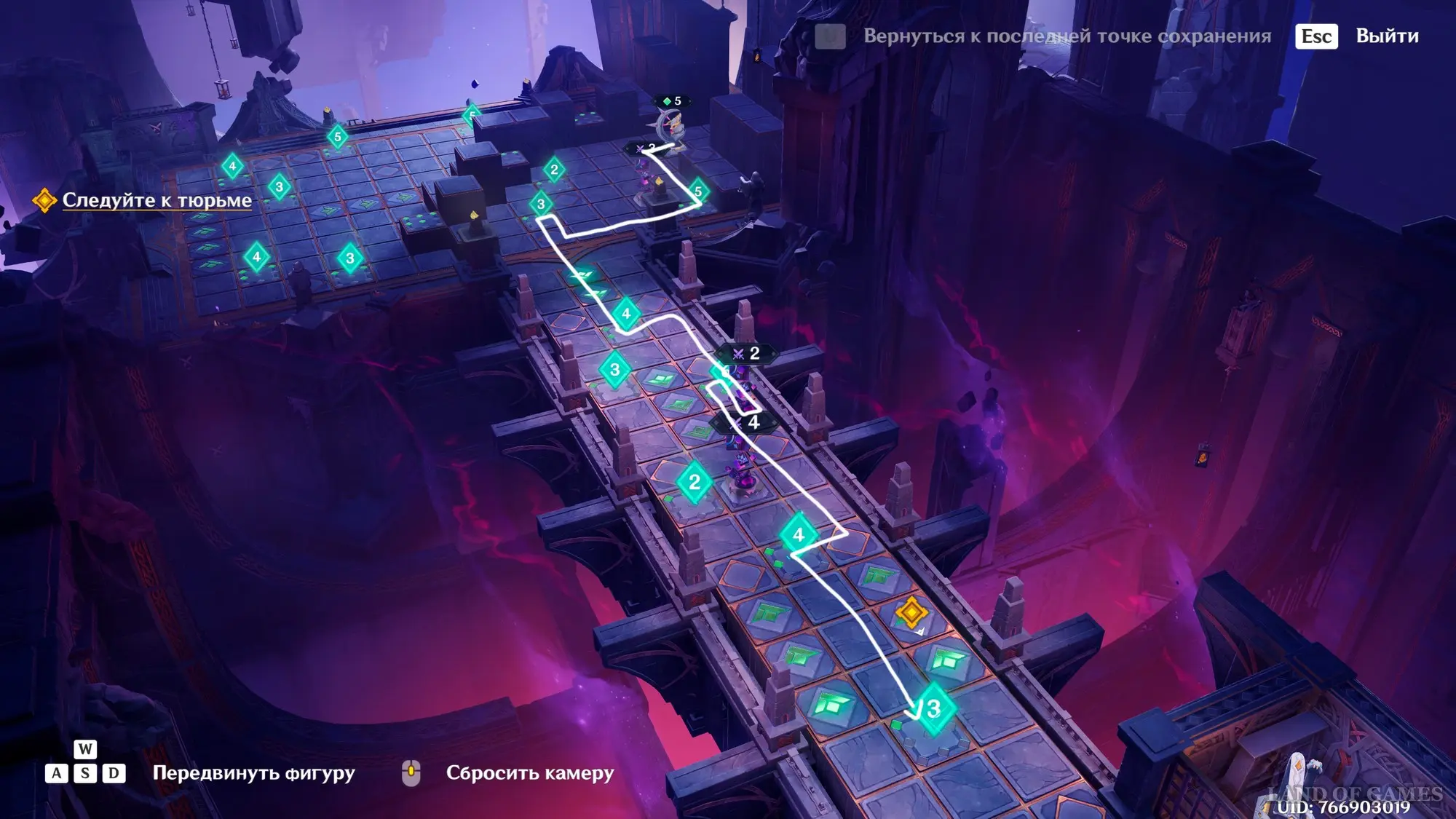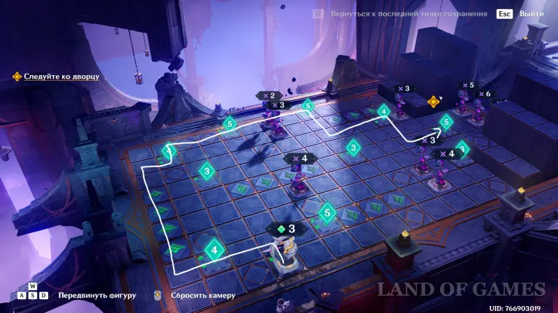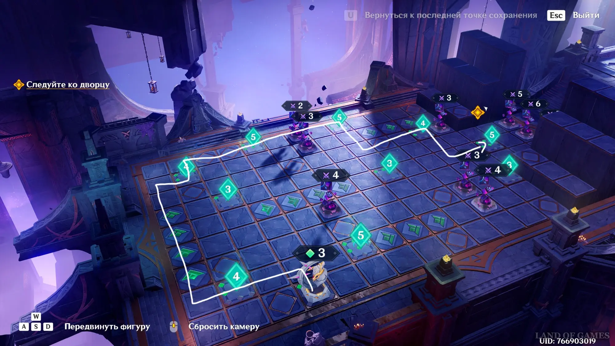 Сначала двигайтесь к плитке с цифрой «5», обойдя врага, а потом направляйтесь к цифре «3» и оттуда доберитесь до моста и плите с цифрой «4», воспользовавшись стрелками. Далее нужно будет дойти до цифры «6» и тут же шагнуть вперед, разобравшись с врагом, над которым висит двойка. Теперь не идите вперед, а снова встаньте на шестерку для восполнения очков действий.