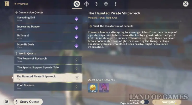 Сразу же после разговора с Ирмари вы автоматически перенесетесь в локацию Око Кратти. Теперь бегите на восток к выделенной области. Здесь вы обнаружите старый пиратский корабль, потерпевший крушение. Поднимитесь на его палубу и исследуйте белый огонек рядом с кустами.