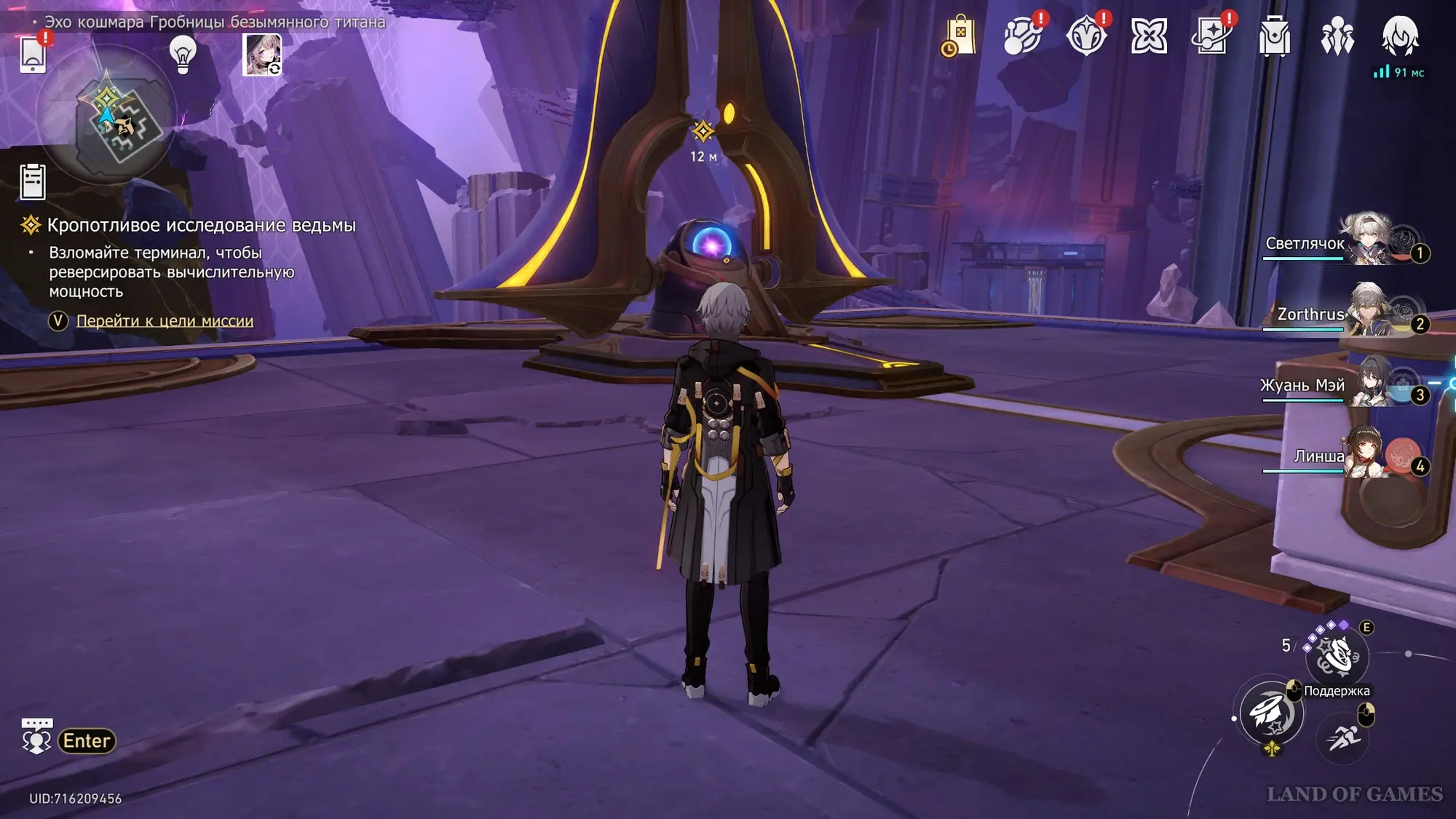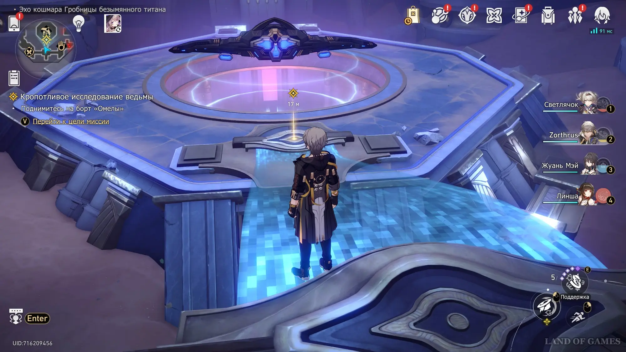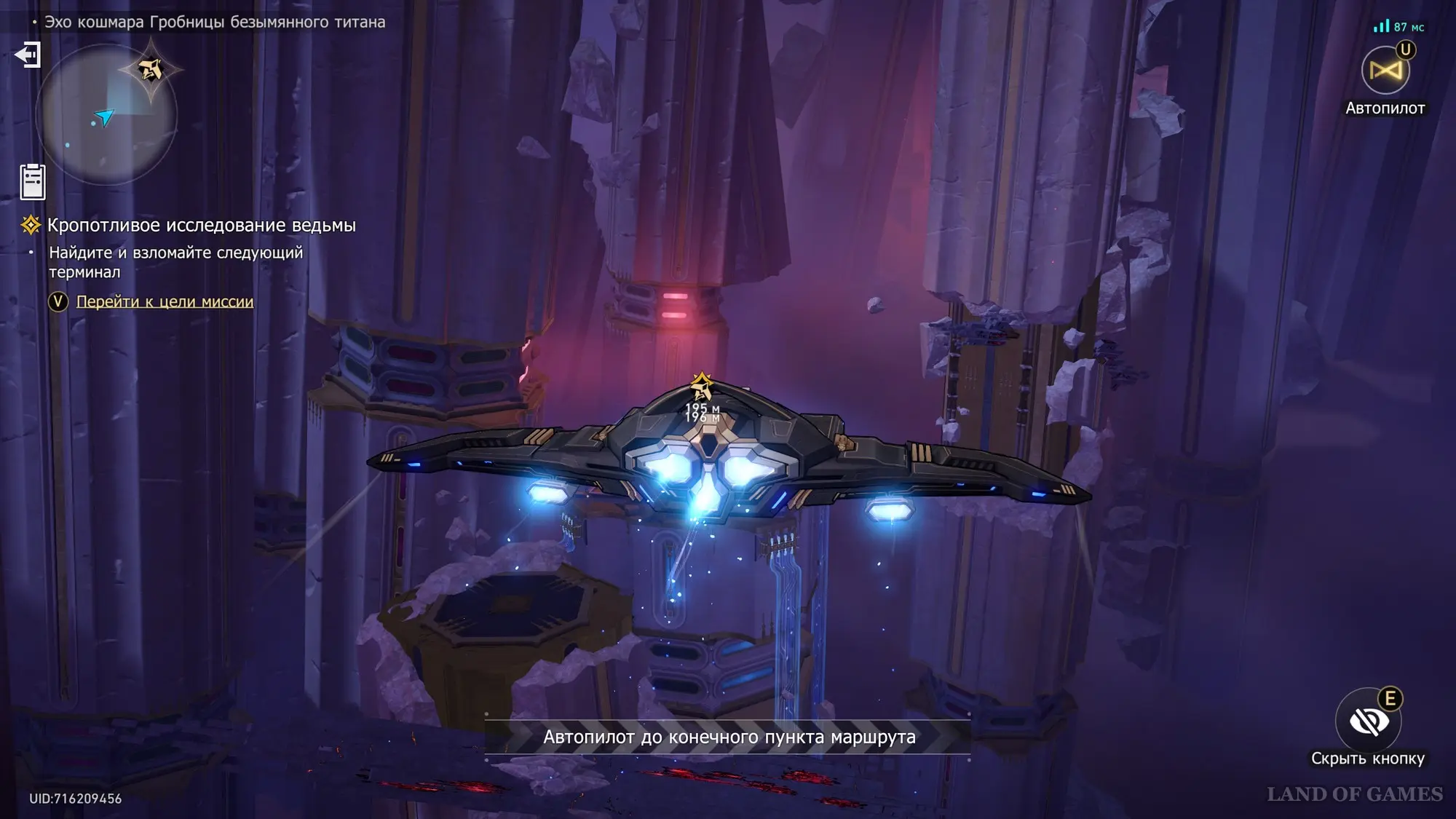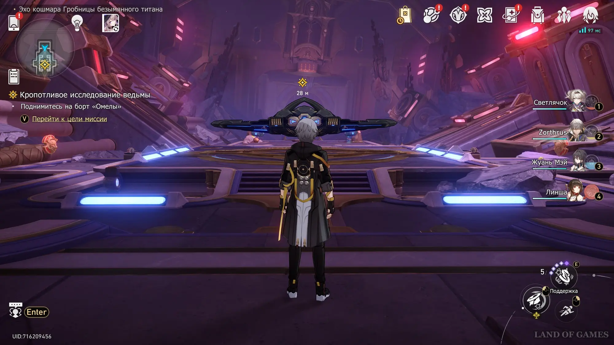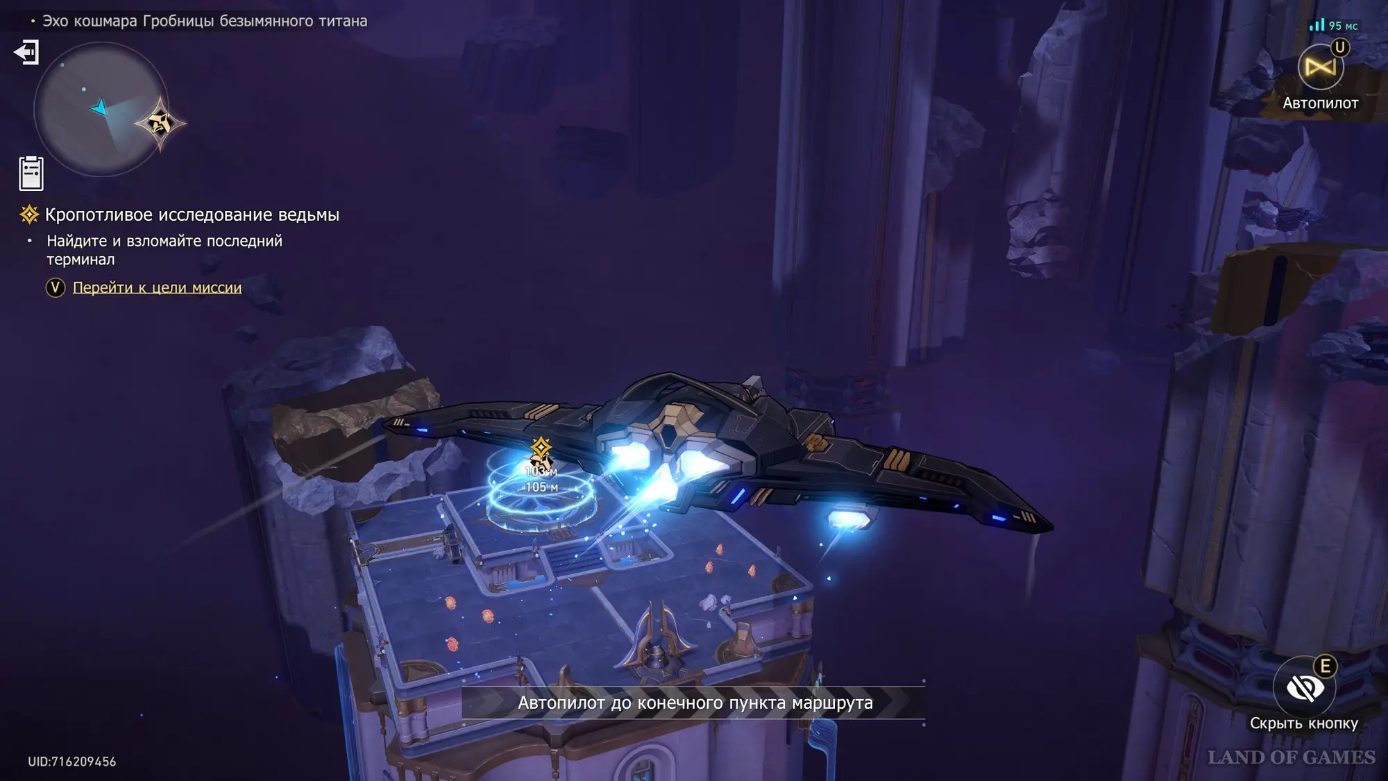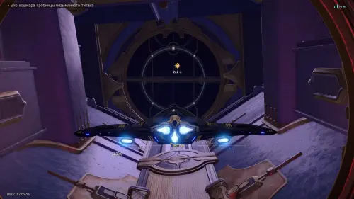 Взяв под управление ладонь титана, пролетите к платформе в центре, а затем нажмите клавишу «R», наведите руку на площадку и запустите ее прямо в нее (ЛКМ), чтобы разломать. Вам нужно будет ударить по платформе три раза. В результате вы разблокируете воздушный транспорт «Омела».