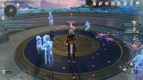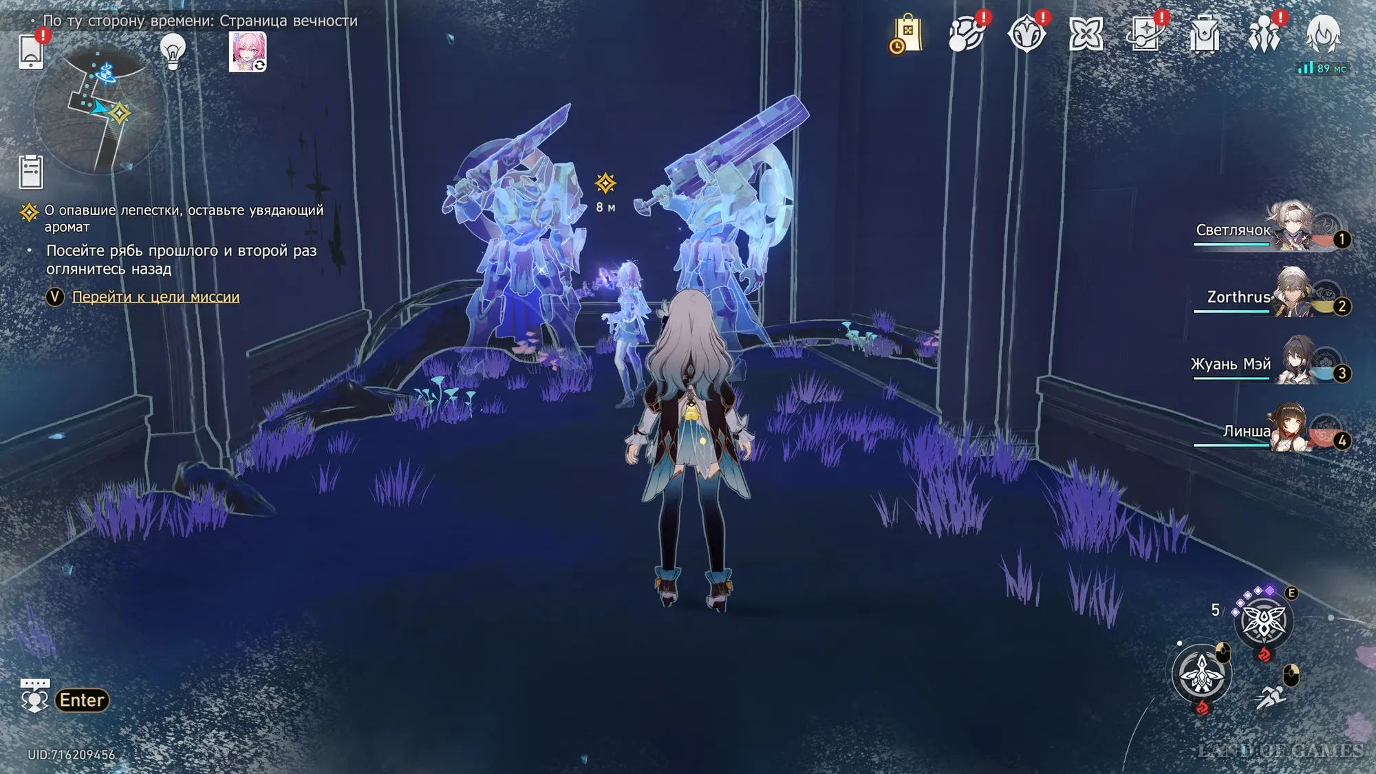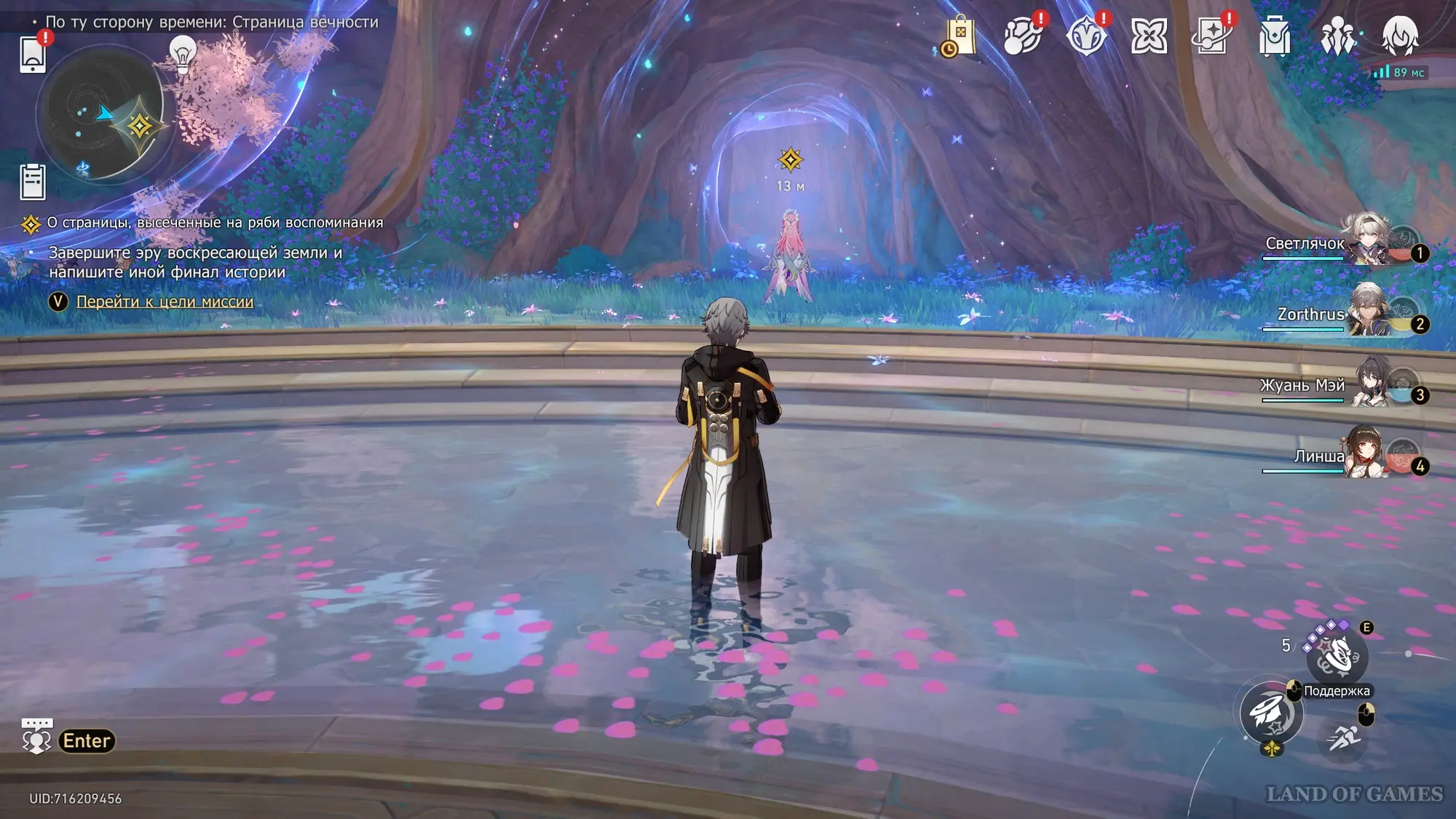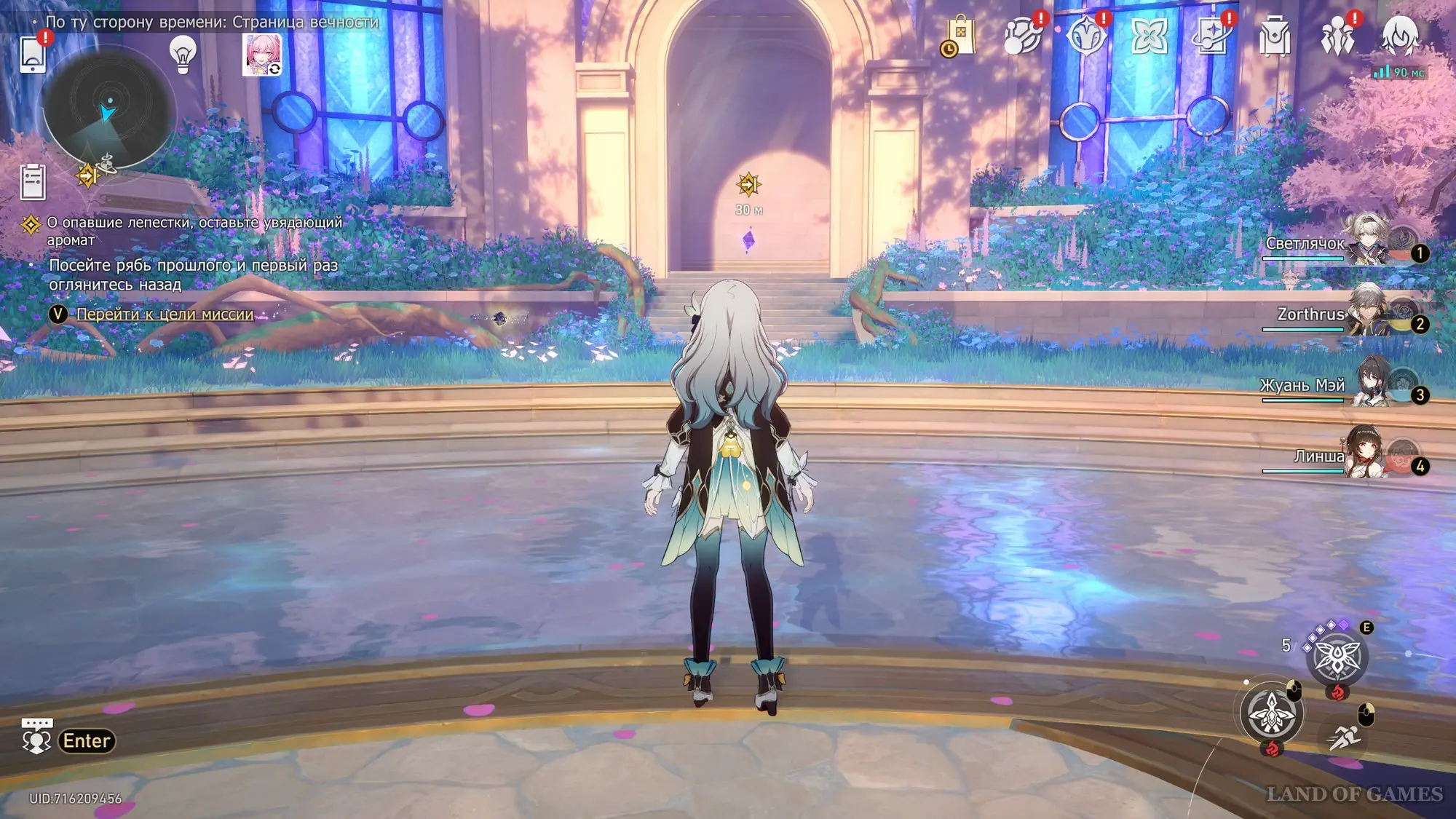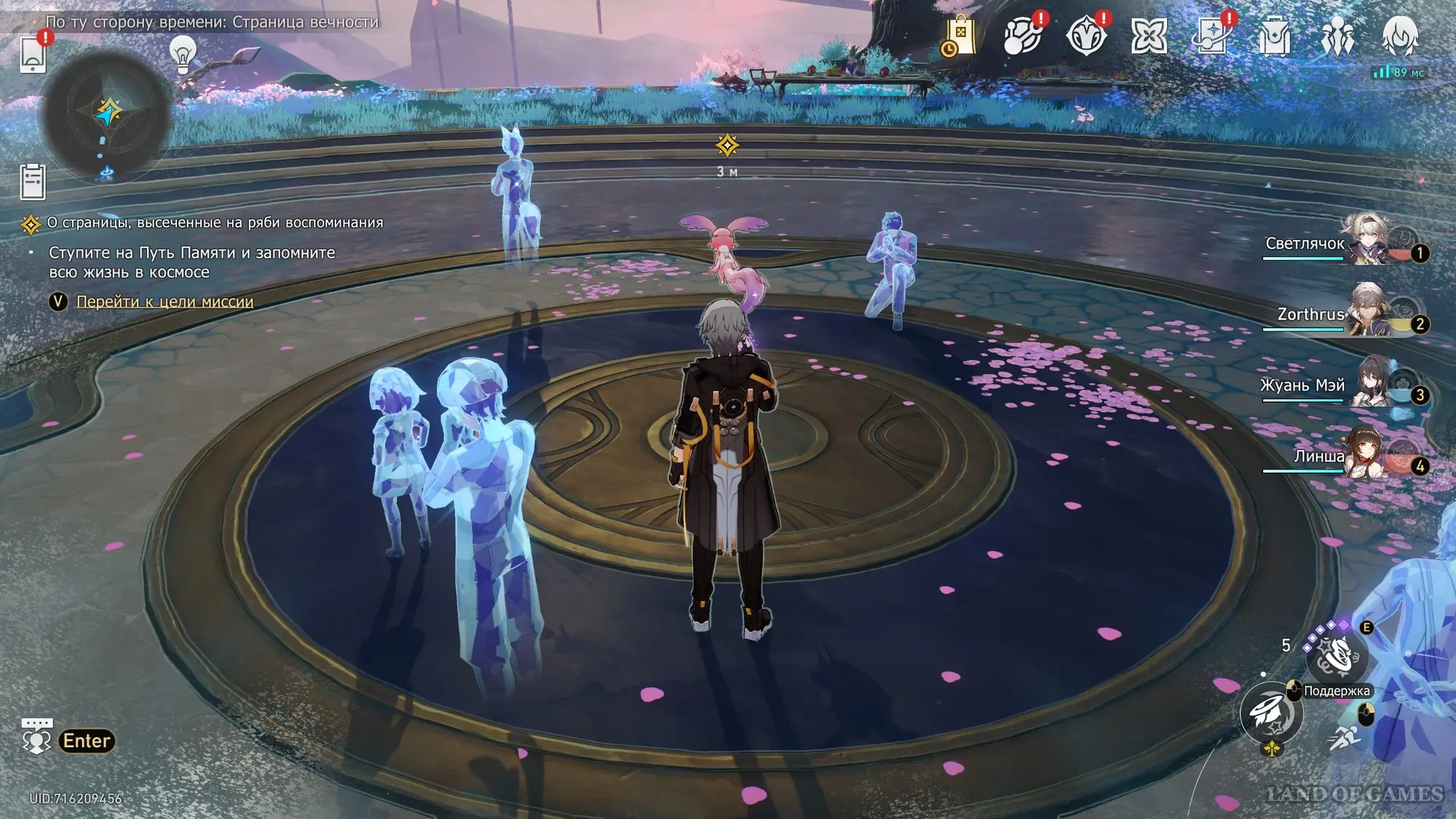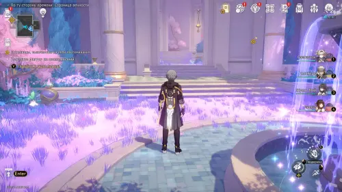 Оказавшись в новой локации – По ту стороны времени: Страница вечности – идите вперед к фонтану и продолжайте бежать наверх, стараясь догнать девушку. Вы попадете на открытую площадку. Начните взаимодействовать с Киреной, чтобы ступить на Путь Памяти. Поговорите с ней, а потом начните следовать за девушкой.