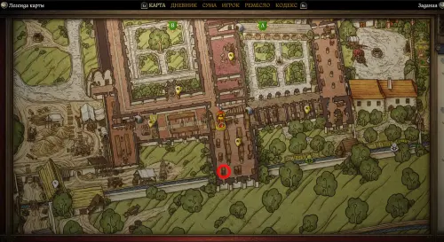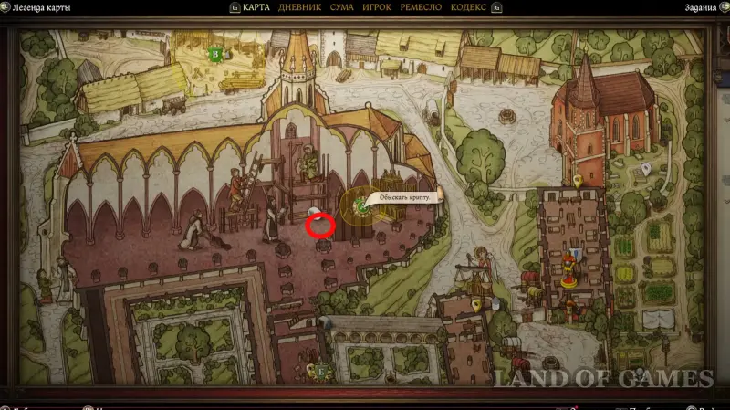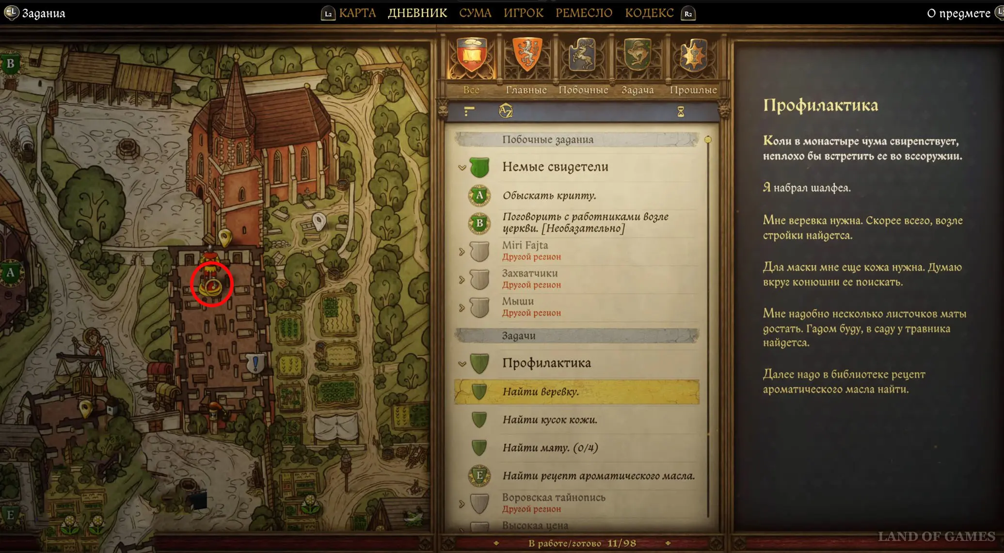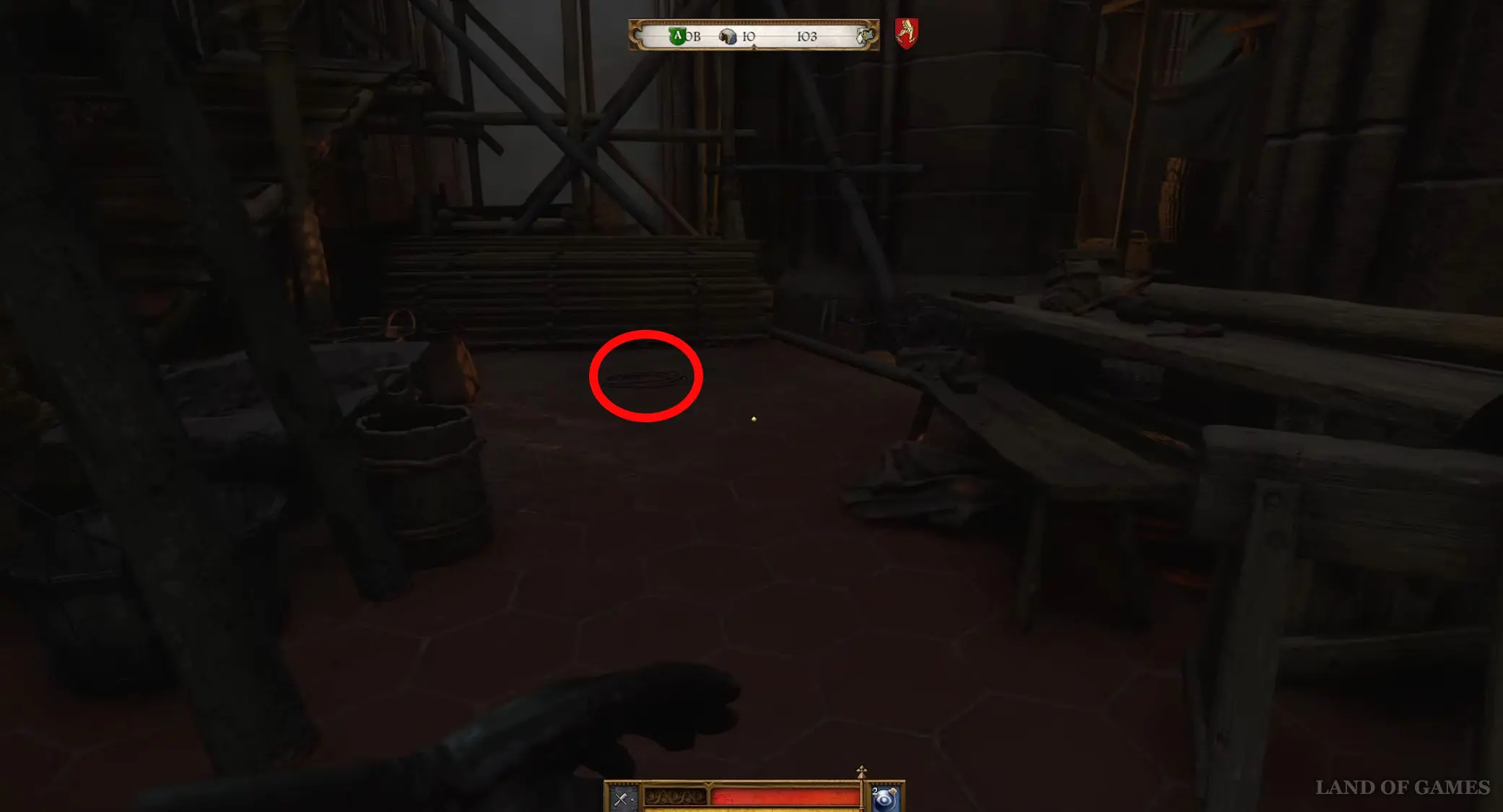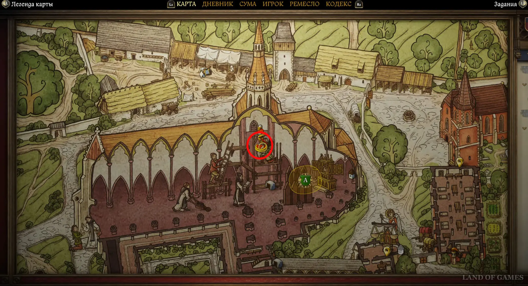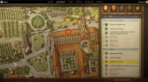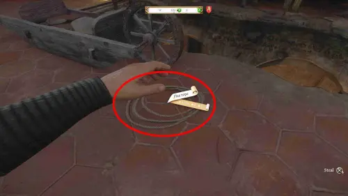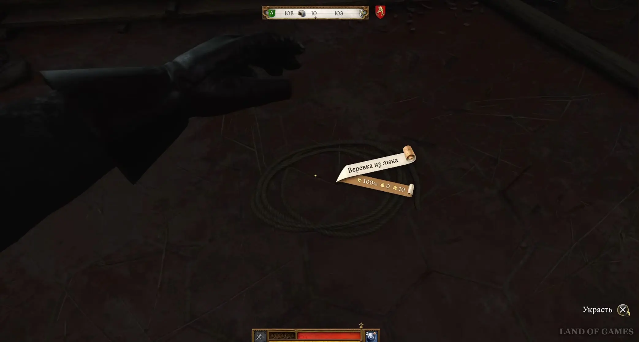 В описании будет указано, что отыскать ее можно возле стройки, поэтому отправляйтесь внутрь церкви, где в настоящее время идет строительство. Нужное место расположено чуть западнее выделенной зоны с пометкой «Обыскать крипту». Веревка из лыка будет лежать на полу, прямо неподалеку от дыры. Рядом будут шастать двое рабочих, которых вы можете отвлечь с помощью камней – затем хватайте веревку и убегайте.