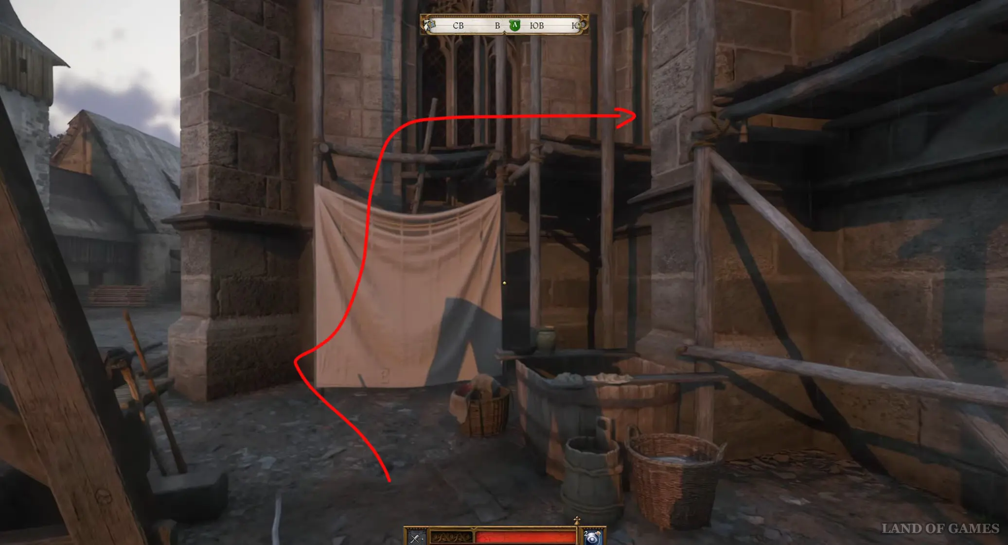 Если вы совсем не хотите попасться никому на глаза, то существует более незаметный способ достать веревку. Для этого пройдите к строительным лесам к северу от монастыря и заберитесь на них по деревянной лесенке позади белого покрывала, а затем войдите в здание черезо окошко. Поднимитесь по лестнице на внутренние леса и двигайтесь влево, а потом спуститесь и идите к яме, возле которой вы обнаружите второй канат, который вы сможете безопасно забрать, не привлекая ничье внимание.