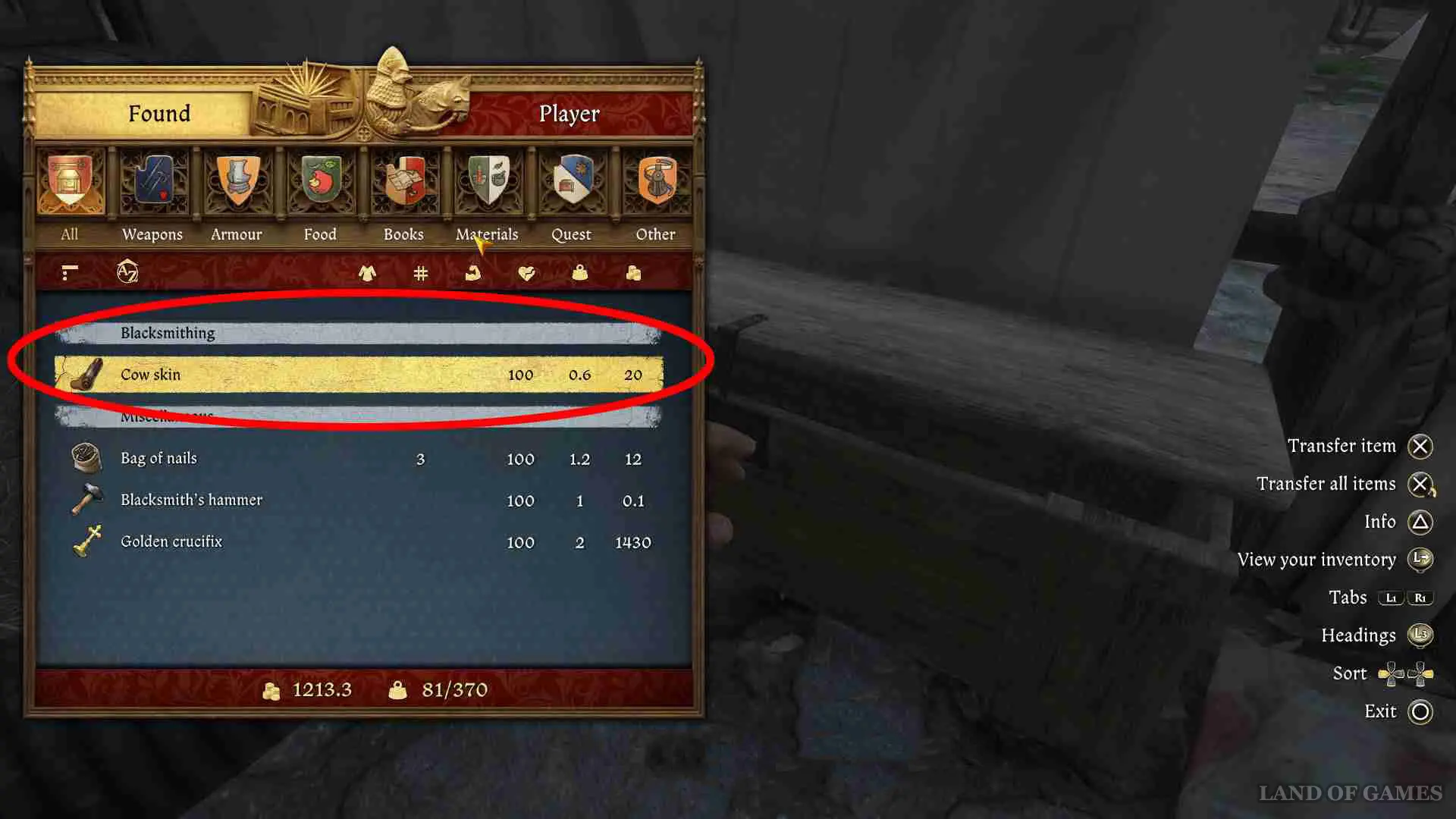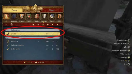 Если вы не смогли найти там кожу или уже как-то использовали ее ранее, то к северу от монастыря под белым тентом можно отыскать запертый сундук с замком легкой сложности. Он стоит прямо напротив входа в конюшню. Внутри него вы обнаружите коровью шкуру.