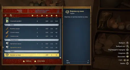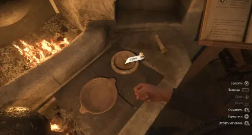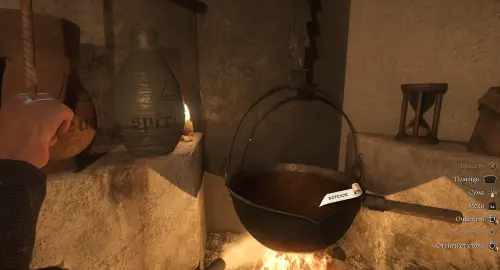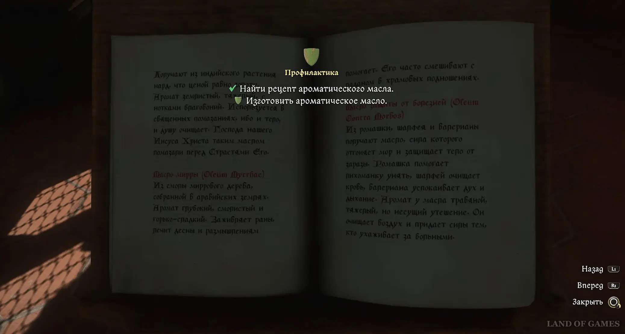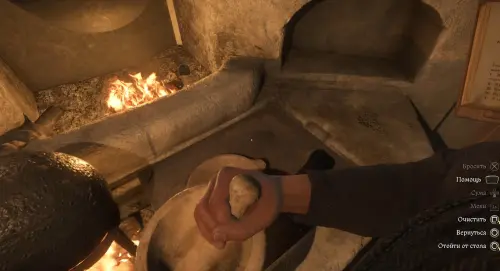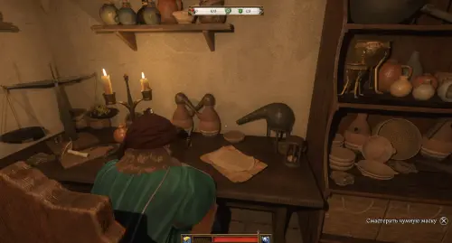 Изготовив снадобье, поверните камеру вправо и взаимодействуйте со столом справа (в правом нижнем углу должна появиться надпись «Смастерить чумную маску» при наличии всех необходимых ингредиентов). Выберите в своем инвентаре мяту, шалфей, коровью шкуру (или свиную кожу), ароматное масло и веревку из лыка, а затем создайте Чумной капюшон.