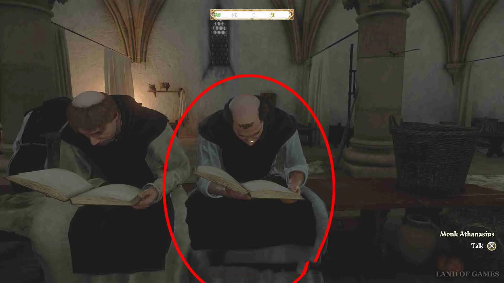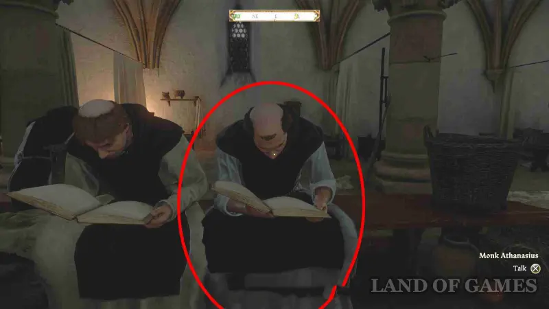 Итак, вы можете сначала побеседовать с монахом Афанасием, который сидит на скамейке в помещении, расположенном на верхнем этаже. Чтобы пройти туда, сначала идите к входу в библиотеку, находящуюся в южной части монастыря, а затем поднимитесь по лестнице слева от прохода. Подойдите к священнослужителю и выберите следующие ответы: «Ты выглядишь обеспокоенным. Что тебя тревожит?» > «Я помогу тебе его найти». Затем выберите оставшиеся вопросы, и у вас начнется соответствующее задание.