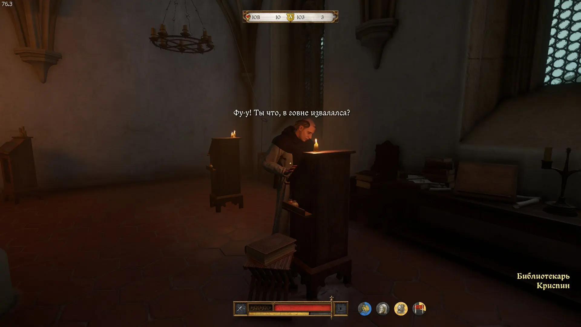 Получив инструкцию, спускаемся в скрипторий. В ту самую секретную комнату, в которой узнали про писания Ярослава (книгу Декамерон). Напоминаем, что вход находится в погребе возле разлитого вина.