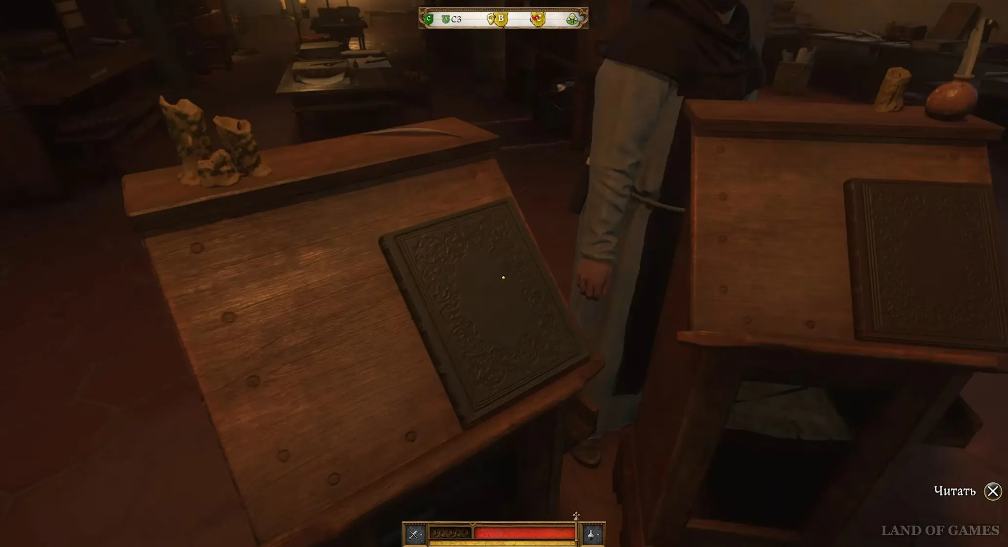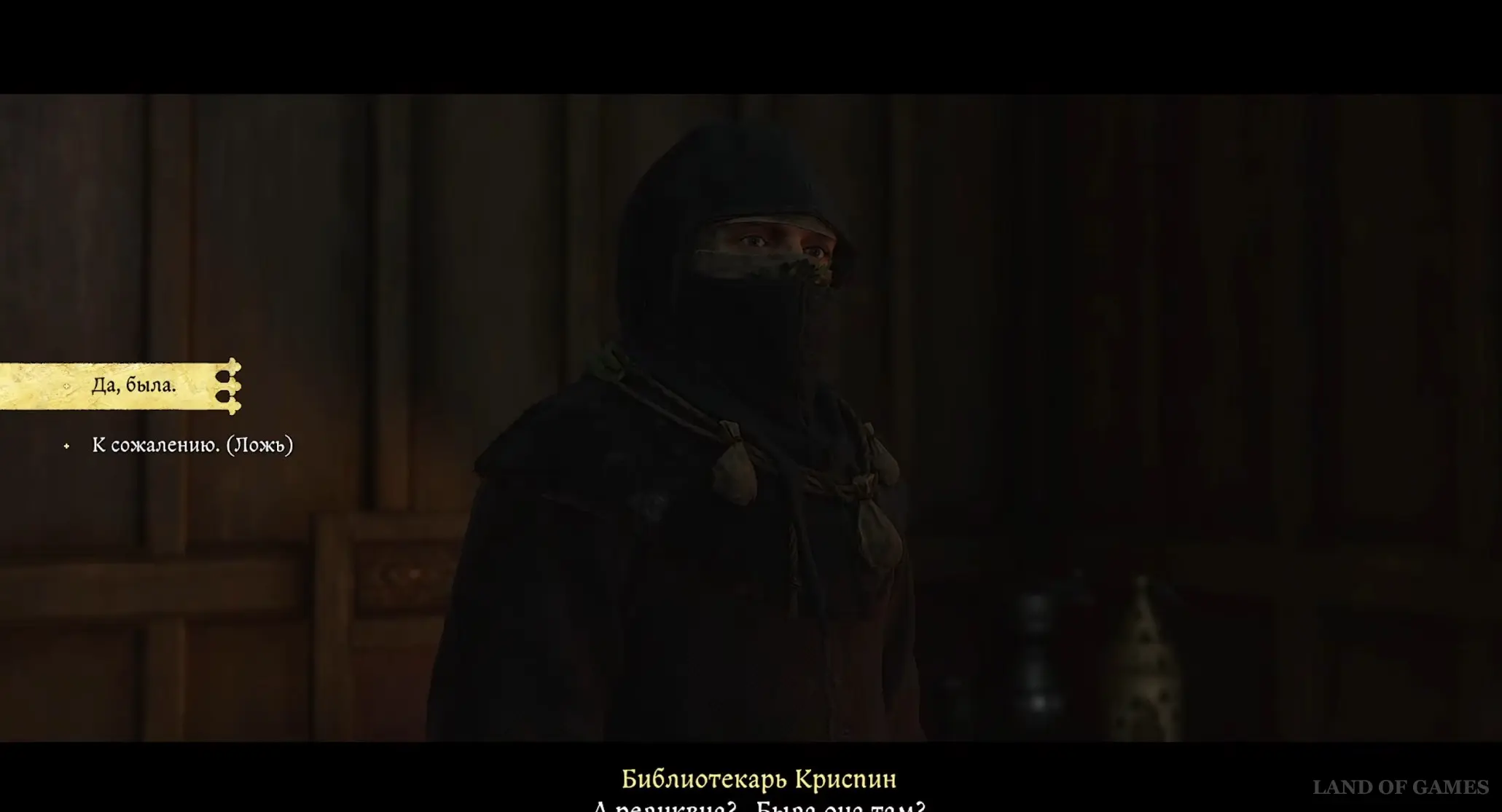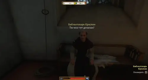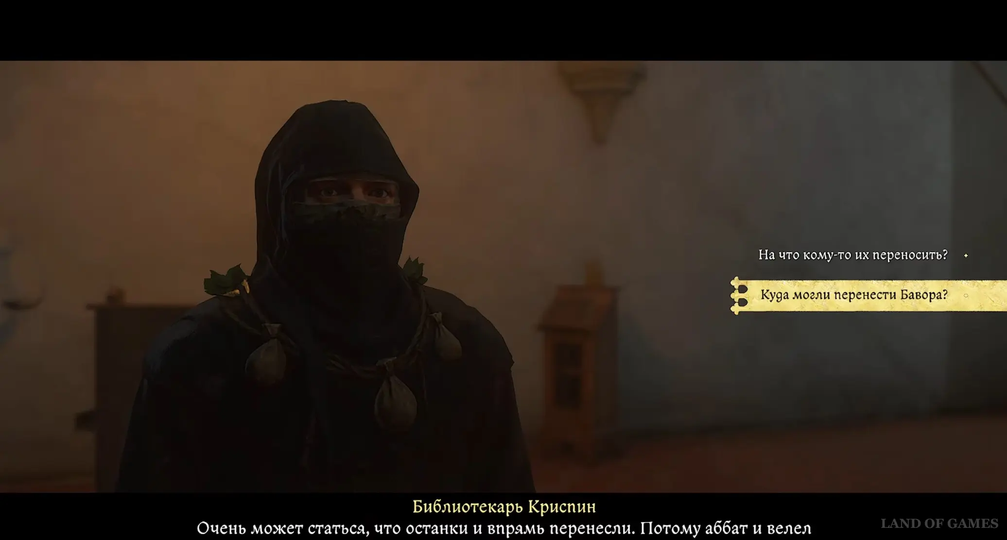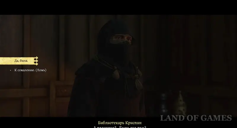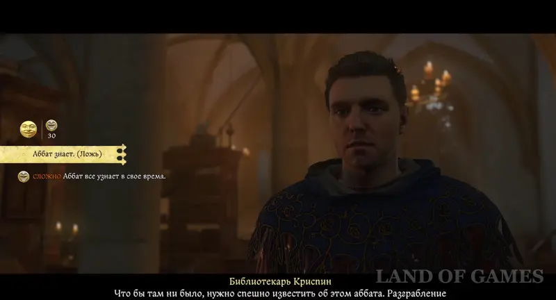 Первым делом отправляйтесь в библиотеку, расположенную в южной части монастыря, и вступите там в диалог с библиотекарем Криспином. Выберите следующие варианты ответов: