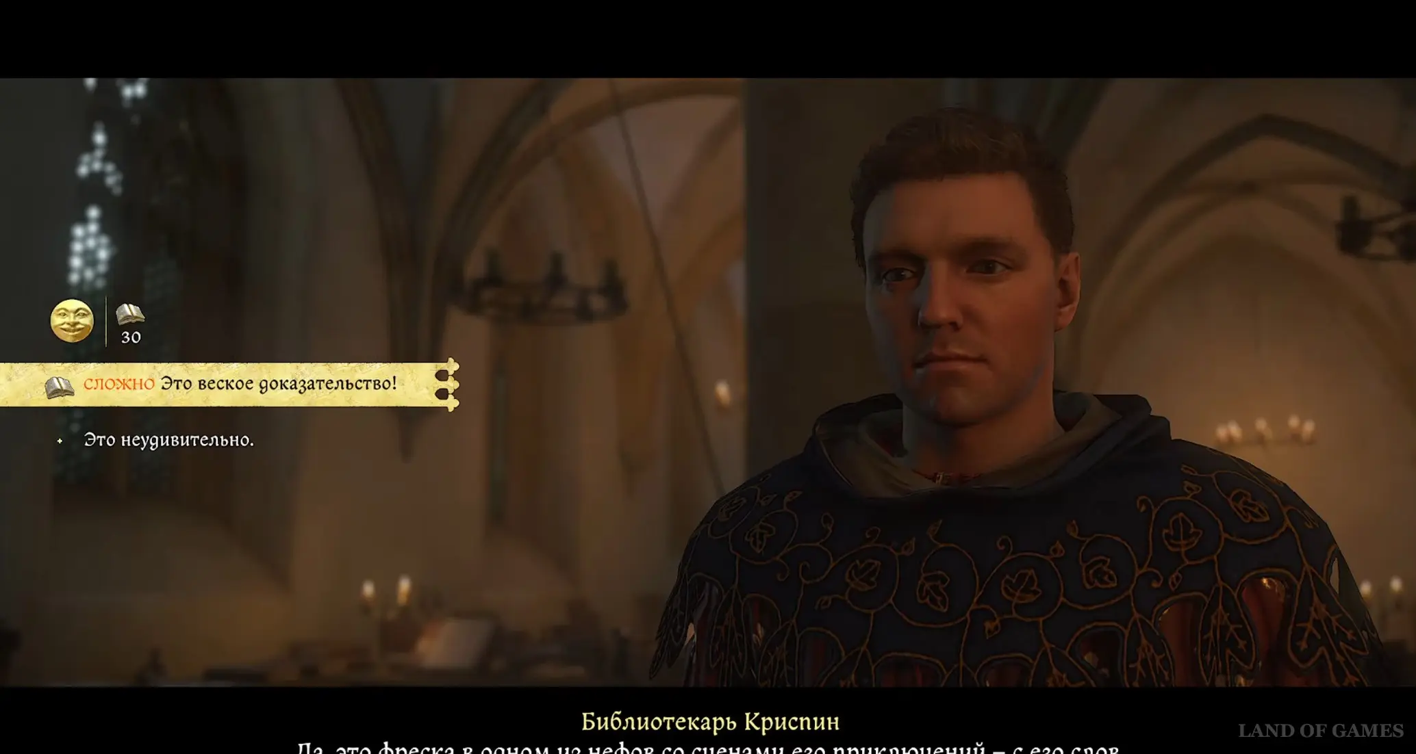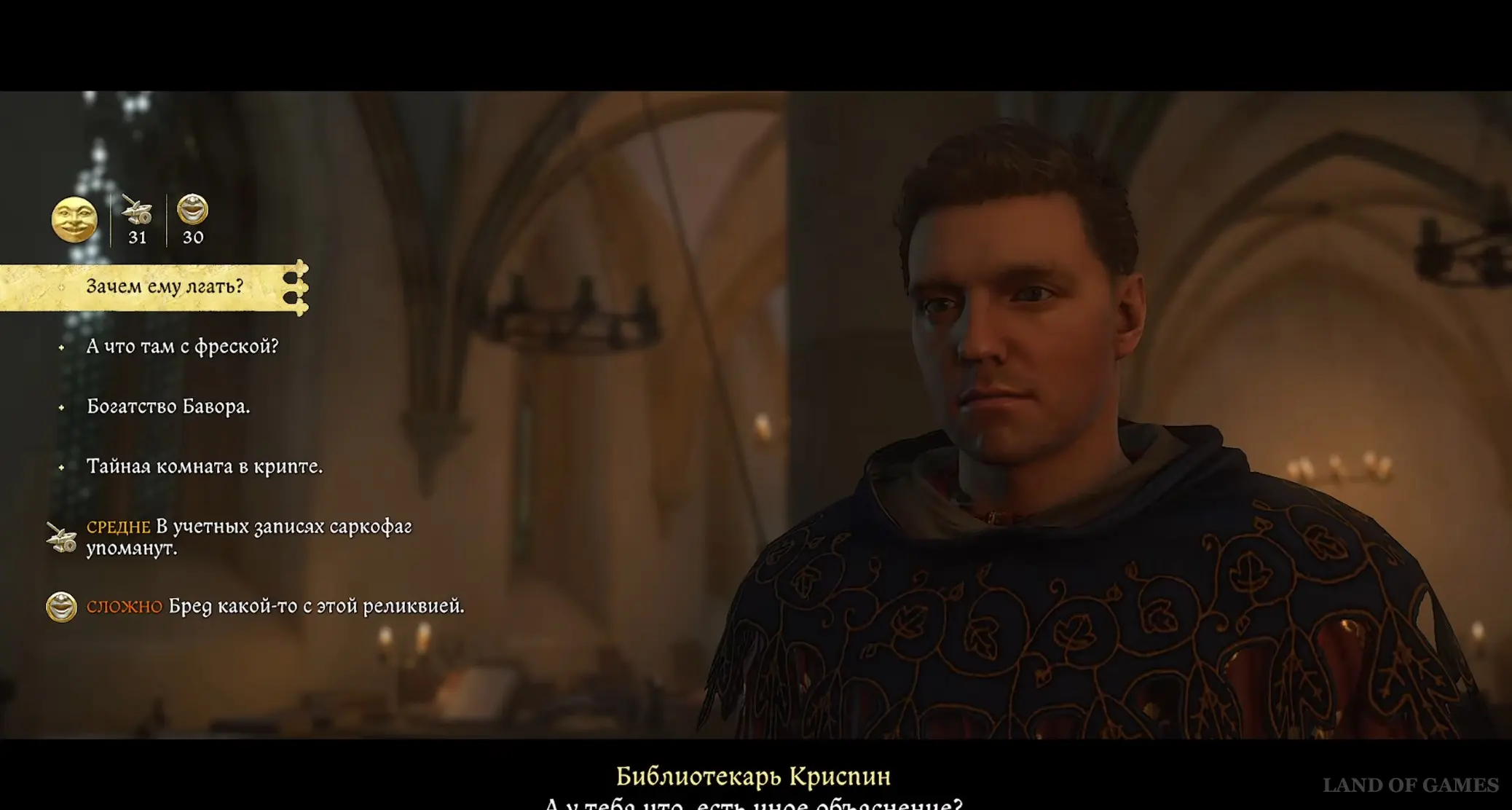 Далее пройдите в левый коридор, который ведет прямиком в библиотеку. Добравшись до нужного помещения, снова поговорите с Криспином и выберите следующие варианты ответов для повышения репутации: