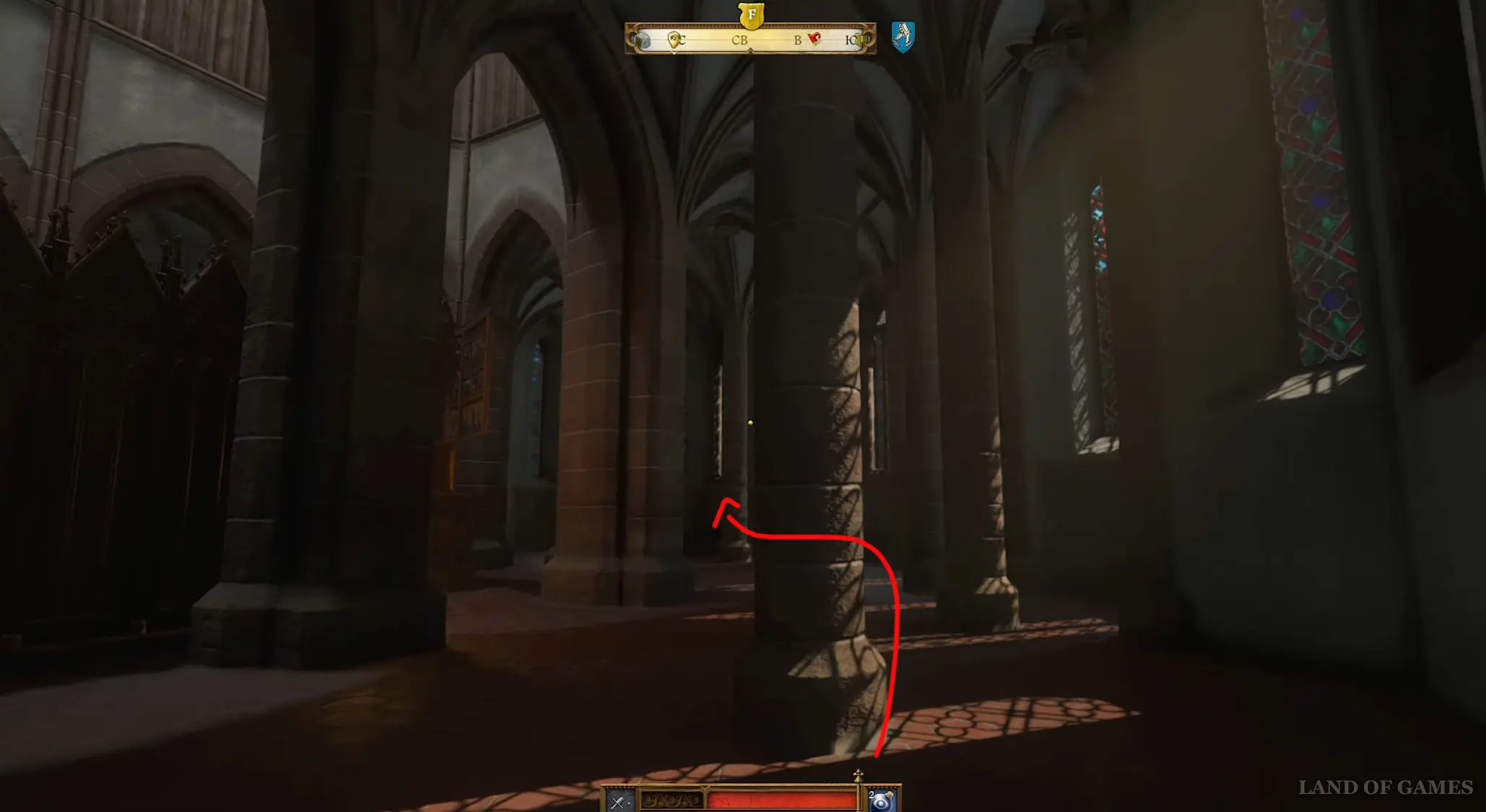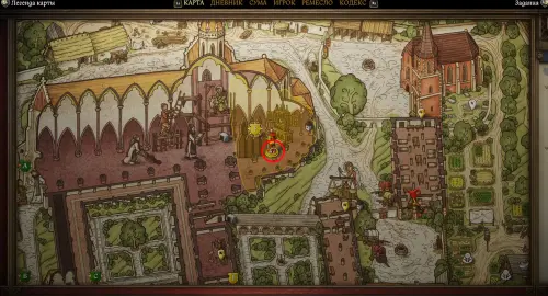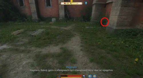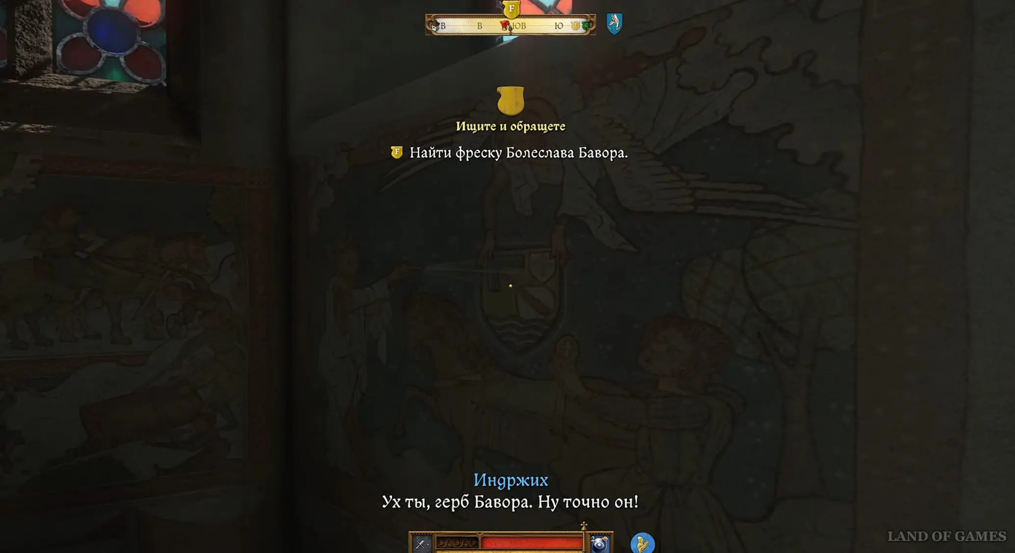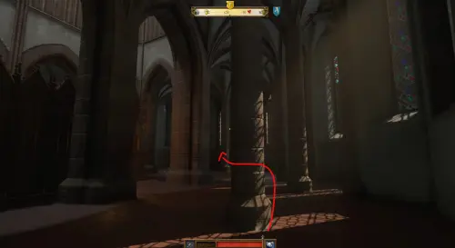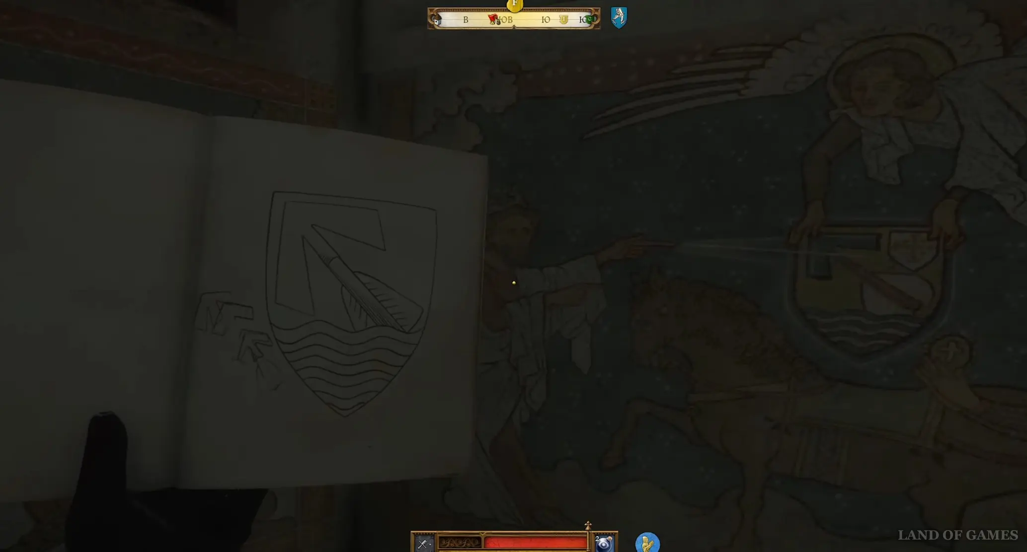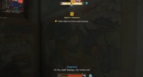 Отыскать рисунок можно внутри церкви на первом этаже (лезть в крипту пока что не нужно!). Идите к самой крайней восточной стене здания, и под окнами, где находится молельня, вы обнаружите различные фрески. Нужное вам изображение – третье с правой стороны – на котором изображен ангел, держащий фамильный герб Бавора. Подойдите к ней поближе и взаимодействуйте.