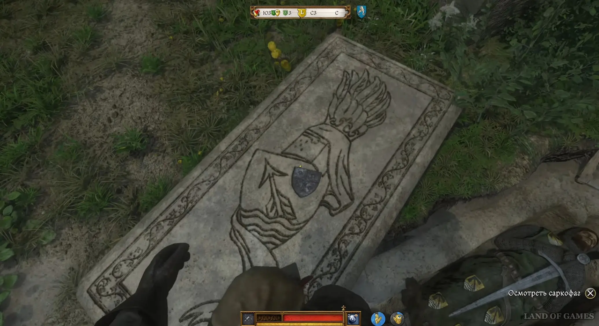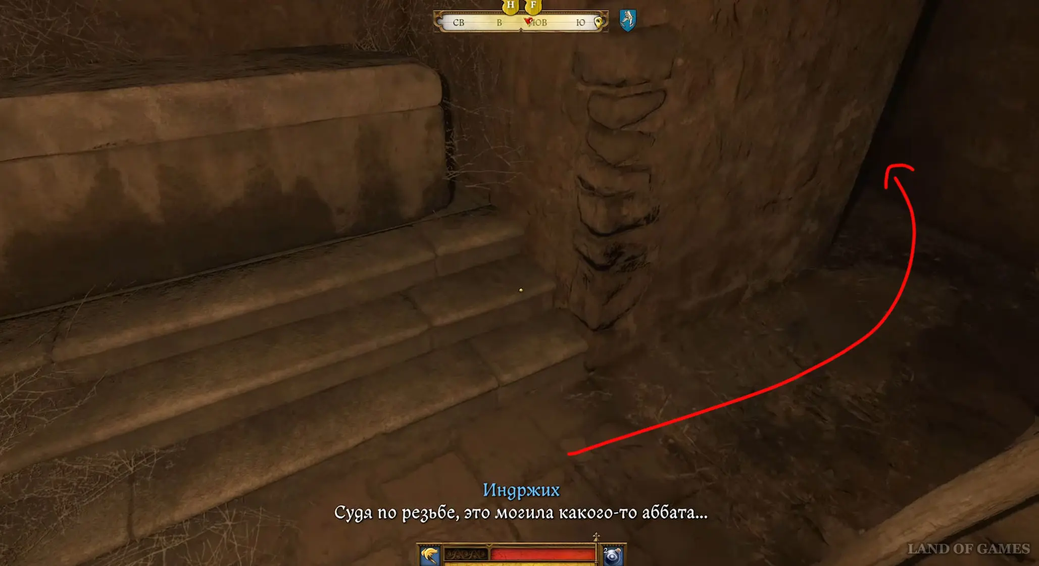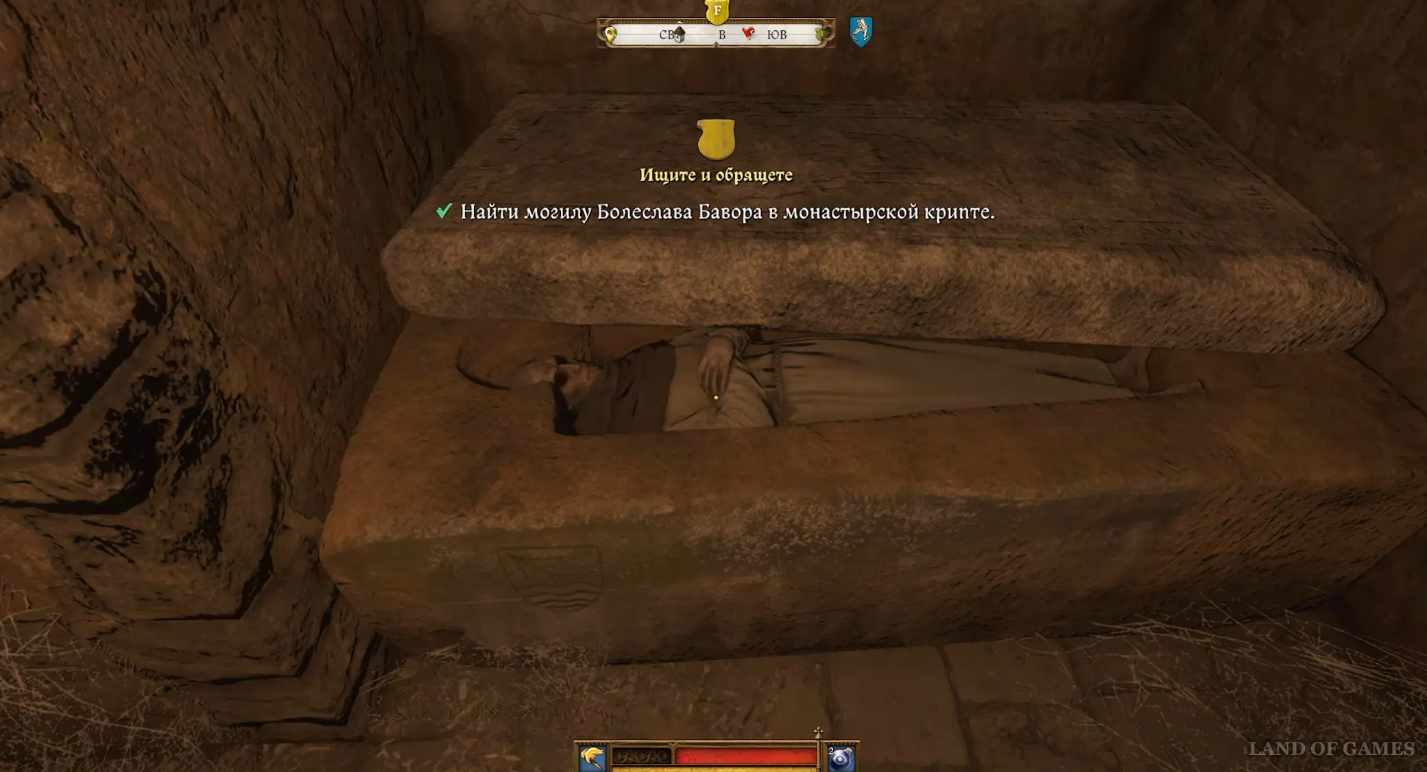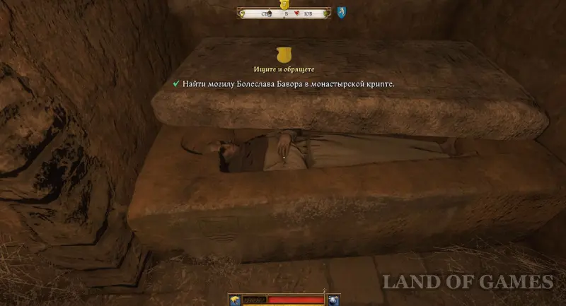 Попав на другую сторону, дважды поверните направо и войдите в узкий туннель. Двигайтесь по нему до самого конца и взаимодействуйте с первым саркофагом с левой стороны. На его нижней части вы увидите нужный вам герб. Однако внутри каменного гроба будет лежать совсем другой человек.
