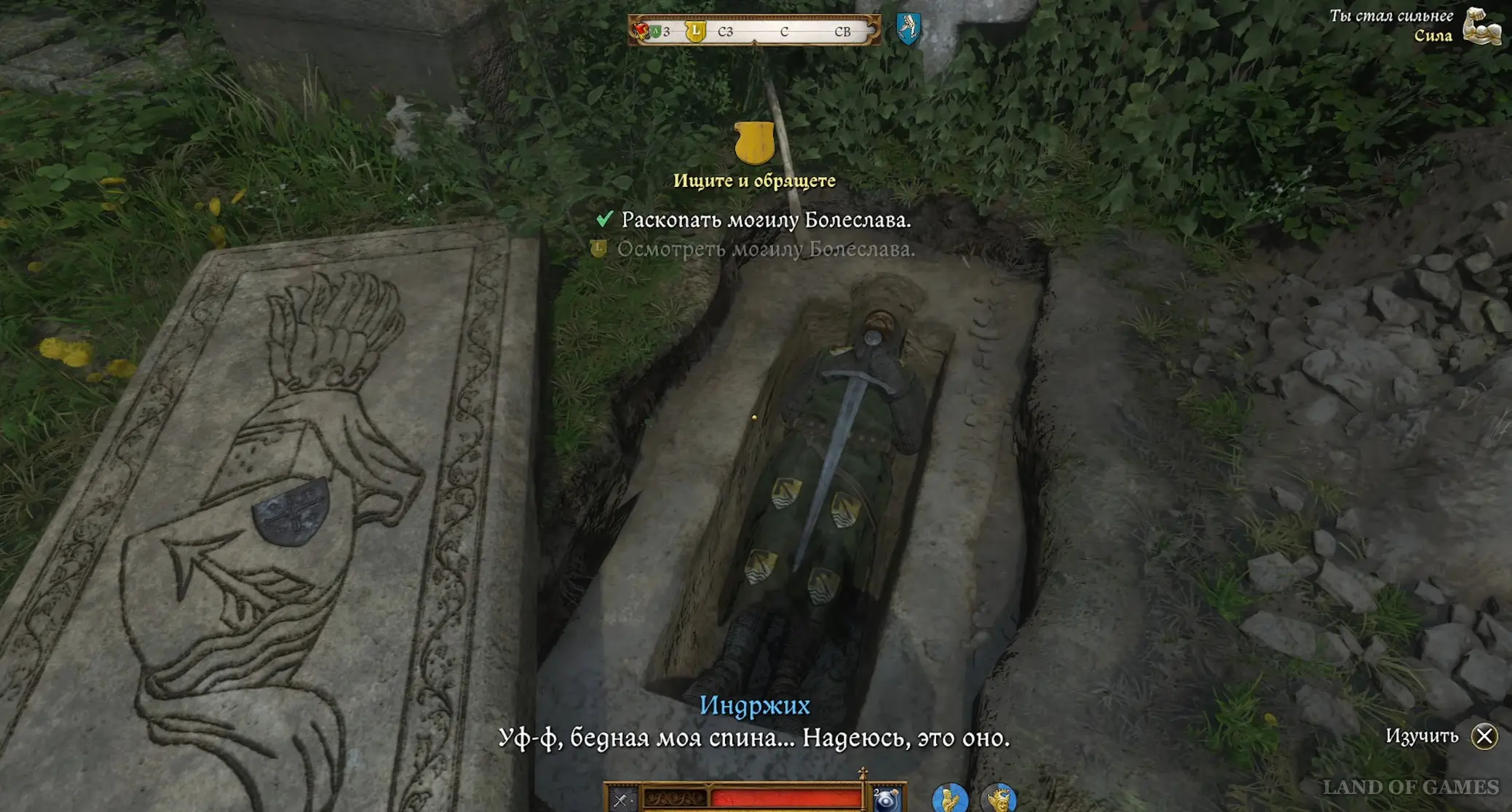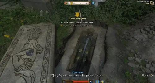 При отсутствии лопаты справа от могилы вы сможете отыскать необходимый инструмент. Потом вернитесь к могиле и раскопайте ее. Далее осмотрите тело и возьмите меч Болеслава Бавора. Рекомендуем вам также надеть доспехи, которые вы ранее забрали у мертвого стражника, так как вскоре вас ждет сражение.