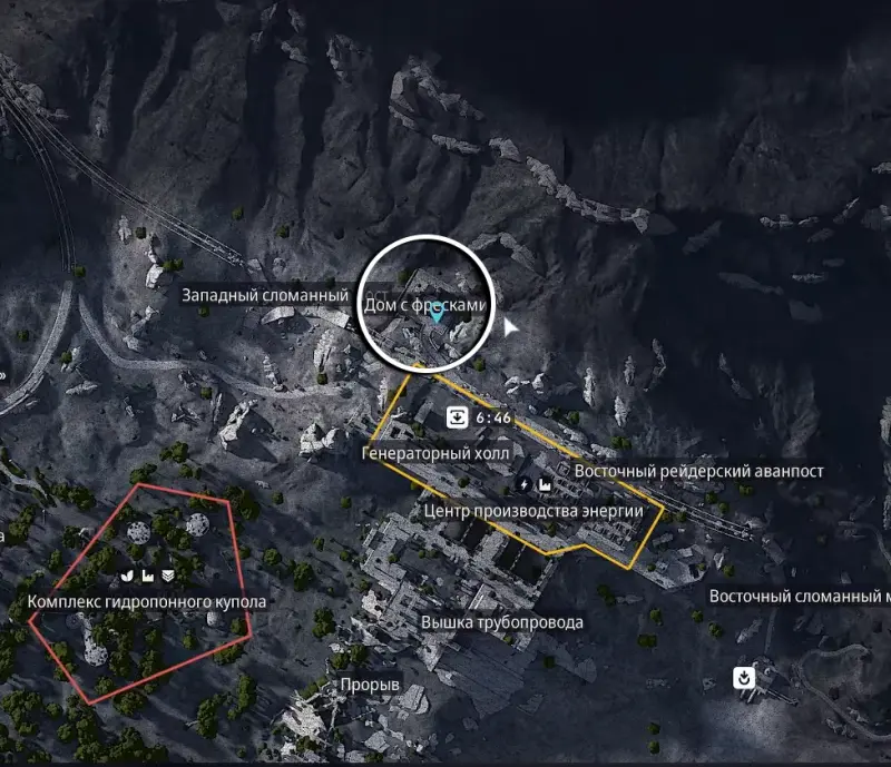 Начните выполнение задания на карте Поле битвы у дамбы. В северной части локации расположено необычное геометрическое здание, известное как Дом с фресками. Поднимайтесь по холму за электрическим полем и лифтами – строение видно издалека.