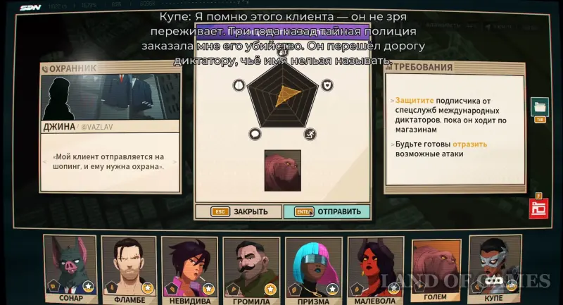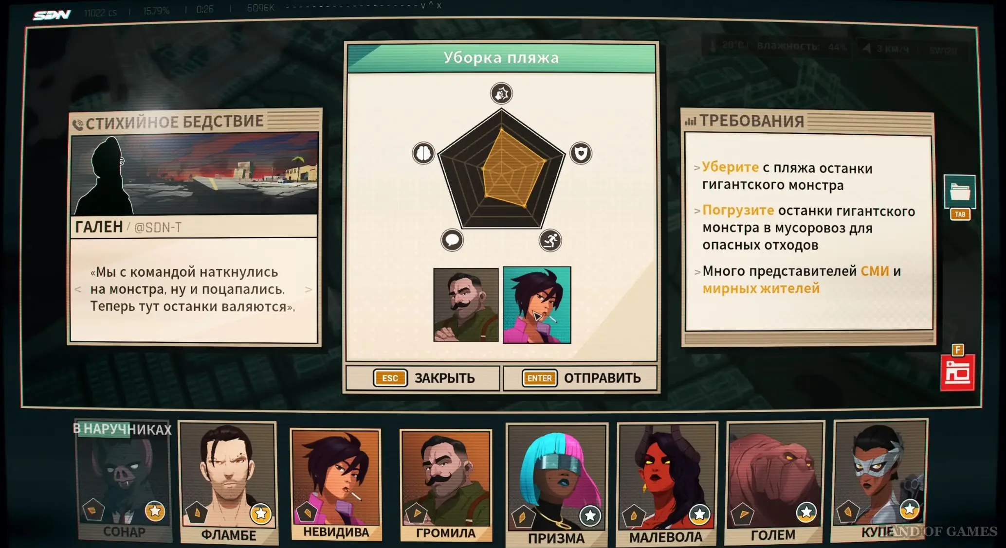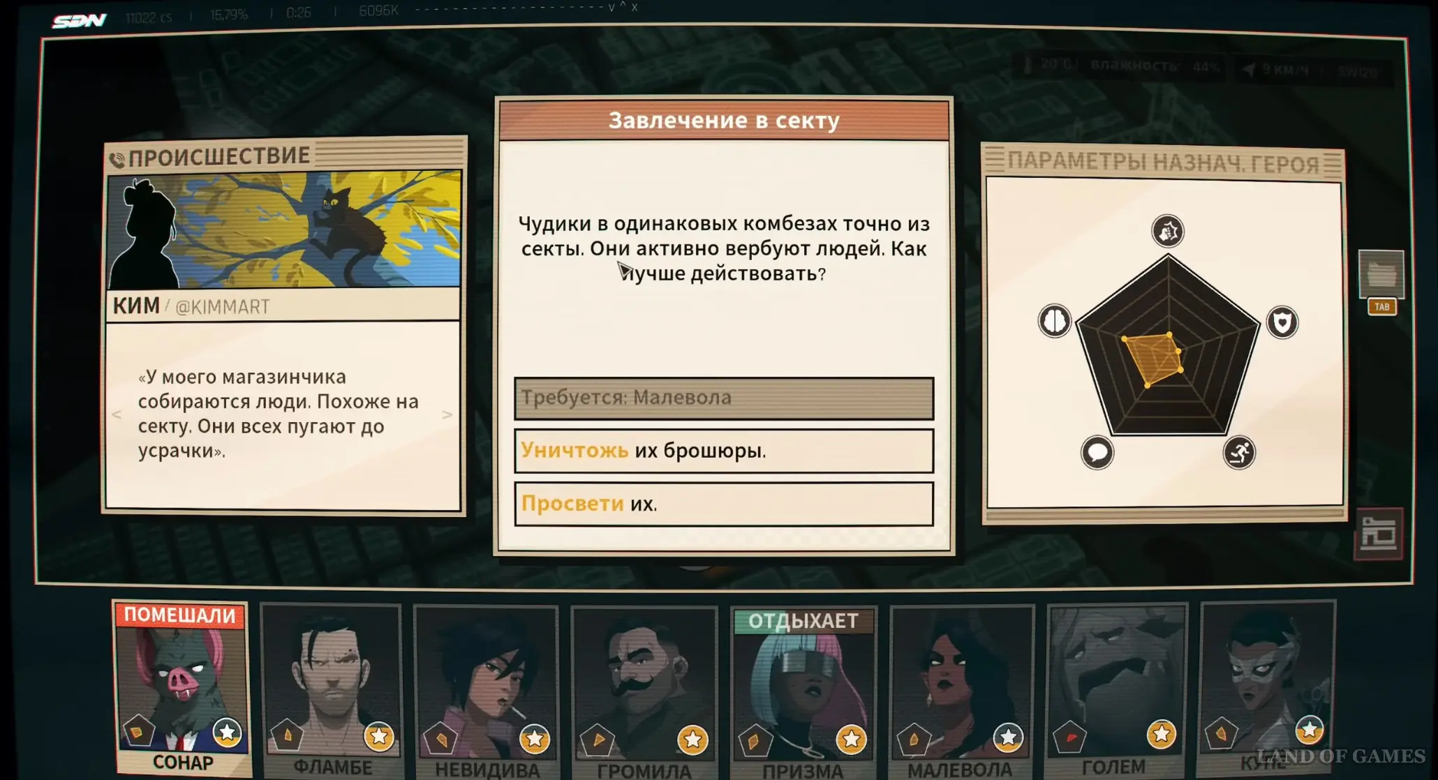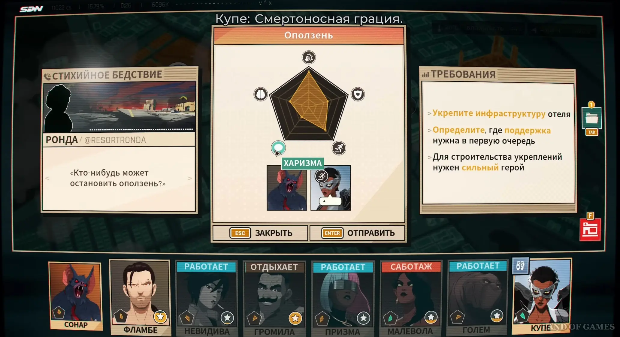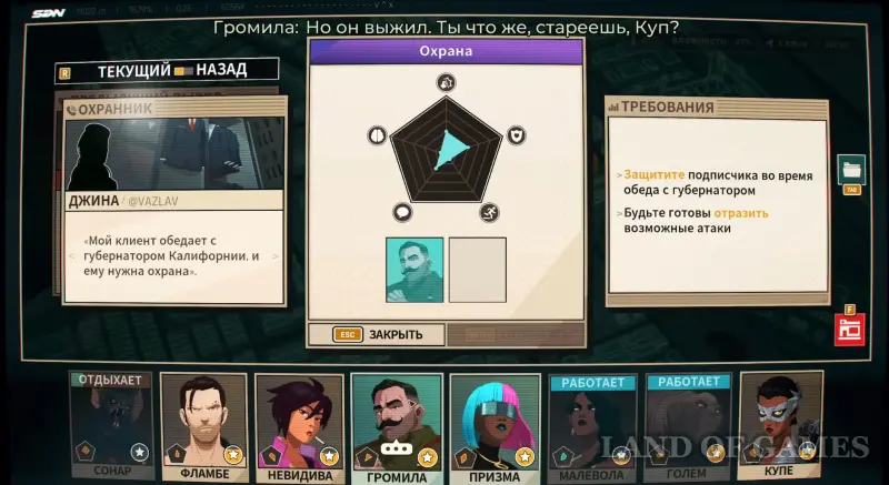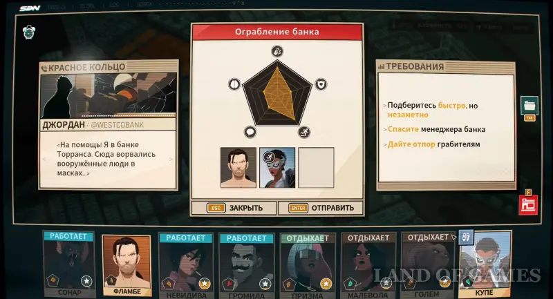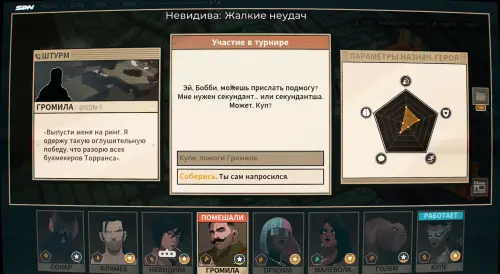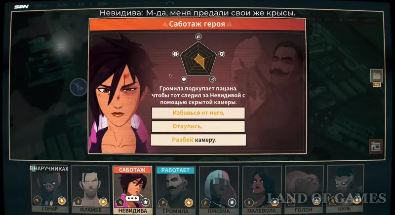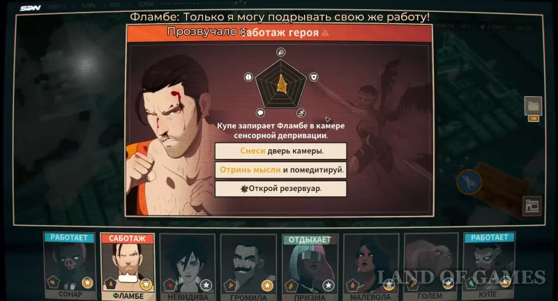 Если вы окажетесь настолько невезучим, то вашему герою может помешать даже его собственный товарищ, если на один вызов вы назначали сразу несколько персонажей. В случае провала проверки навыка во время саботажа член вашего отряда будет ранен, из-за чего все значения его параметров снизятся на единичку в ходе текущей смены. Если же он успешно пройдет испытание, то вернется обратно в штаб без происшествий для отдыха.