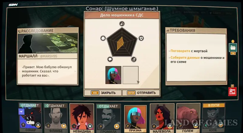 Вы не сможете вручную выбирать, кто из членов группы будет саботирован по дороге на вызов. Единственное, что вам удастся сделать – это провести «сброс» задания, чтобы выбрать героя с наиболее высокими шансами на успешное выполнение задания в одиночку. Выбрав первого персонажа, игра автоматически назначит ему случайного напарника, однако вы можете сменить его, выйдя из интерфейса миссии (ESC) и вновь войдя в него и опять подобрав первого супергероя.