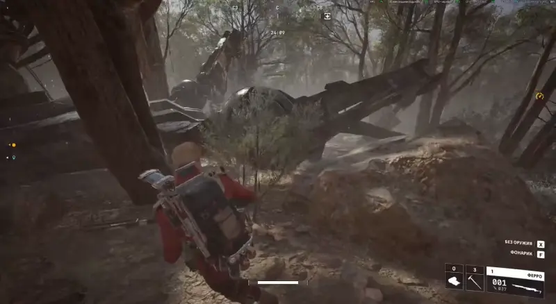 В нужной зоне стоит огромный разрушенный ARC Барон. Его массивный механический корпус отлично заметен между деревьями. Он похож на тот, что изображен в меню задания, а одна из его лап будет выделяться.