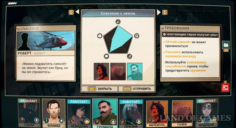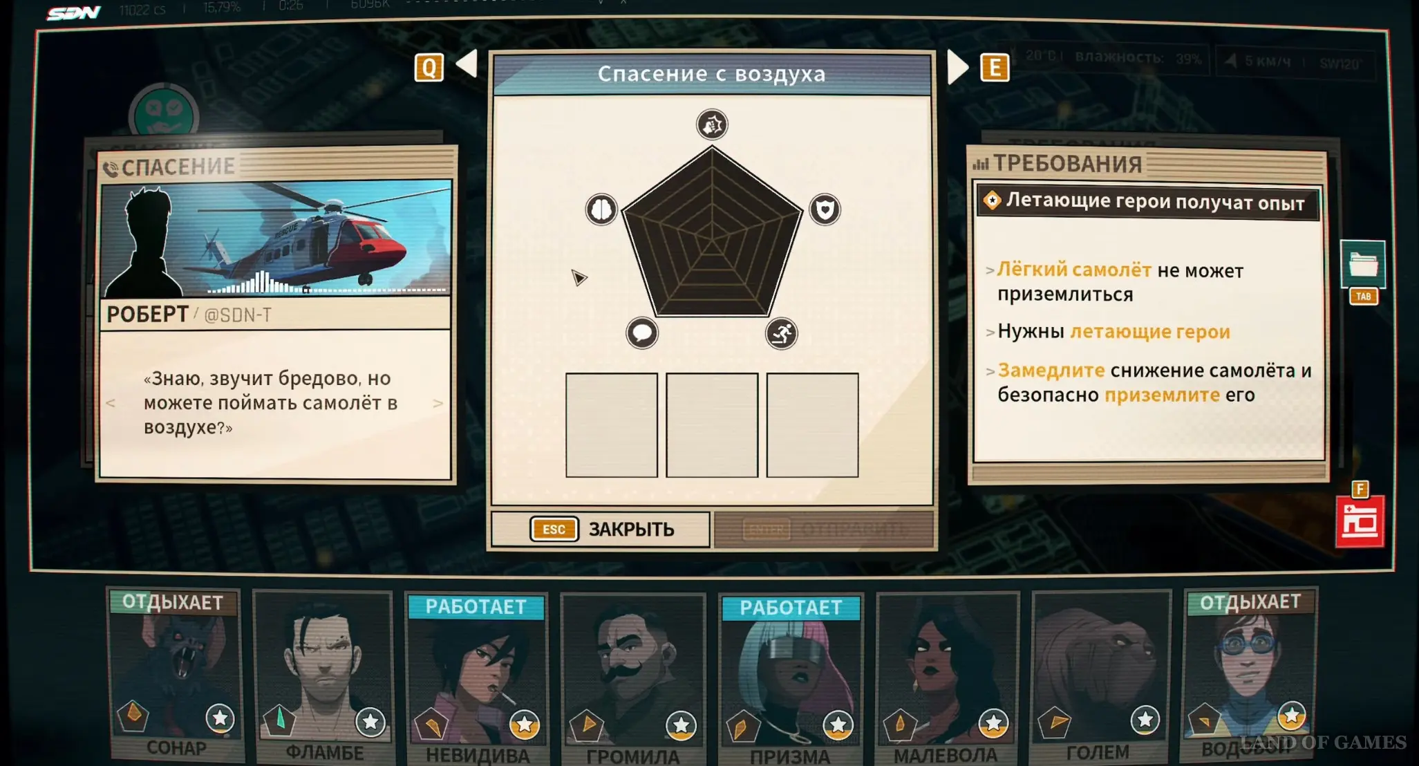 Если выберите «Спасение с воздуха», то все летающие герои получат очки опыта, но вам нужно будет отправить персонажей, имеющих летную подготовку: Фламбе, Сонара, Купе или Феномачо. Для проверки навыков потребуется высокая стойкость и ловкость.
