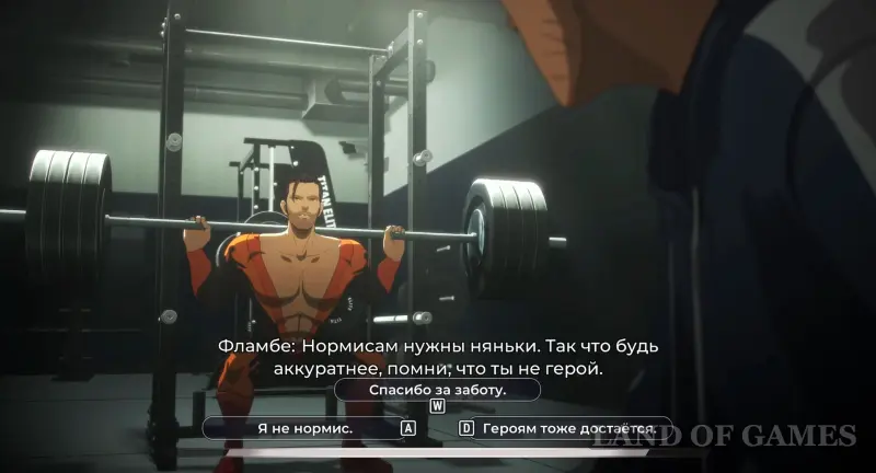 Просматриваем начальный ролик и говорим с Фламбе в тренажерном зале. Он посоветует нам быть аккуратнее, так как мы якобы не герой. Отвечаем ему (не влияет на сюжет):