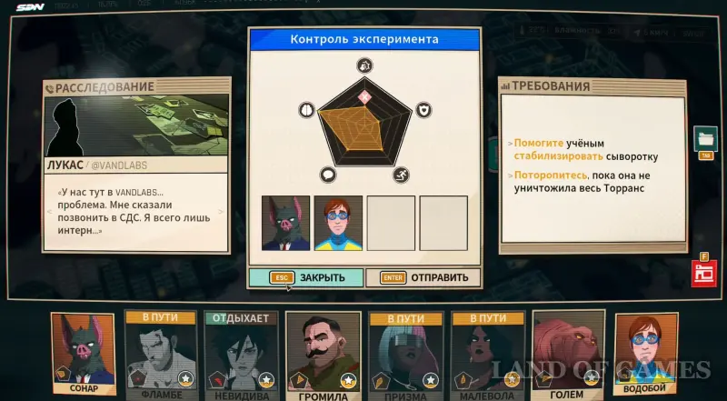 Рекомендуем направить на это задание Фламбе и Призму или Громилу и Сонара/Купе/Феномачо (у летающего персонажа должна иметься летная подготовка). Затем выбираем следующие варианты: