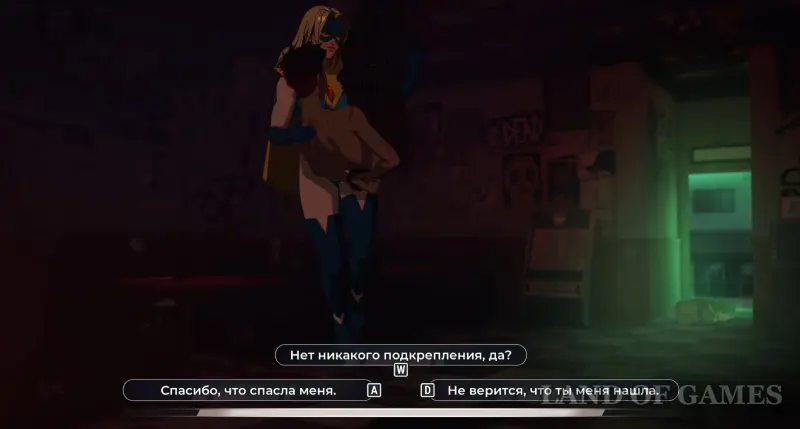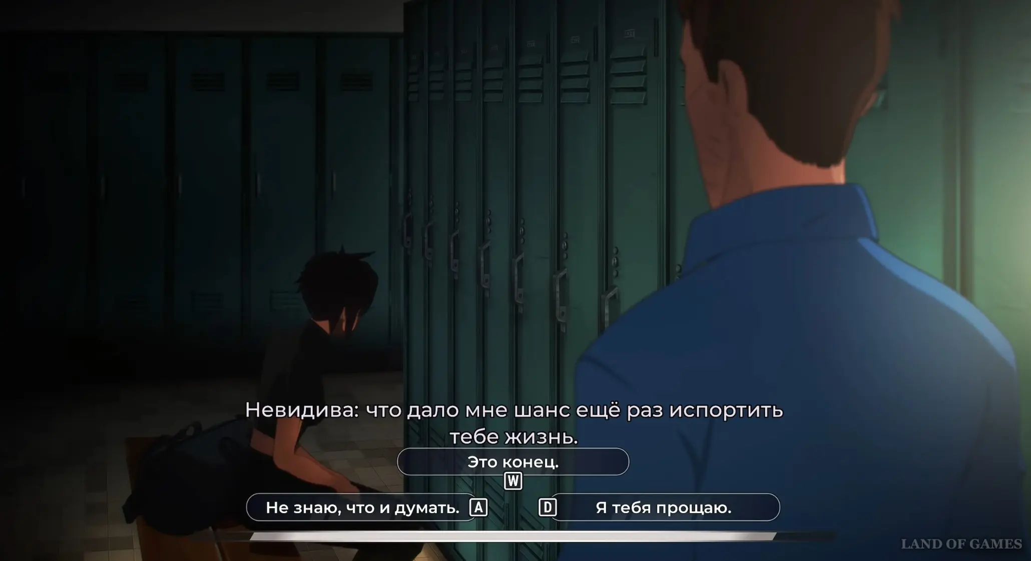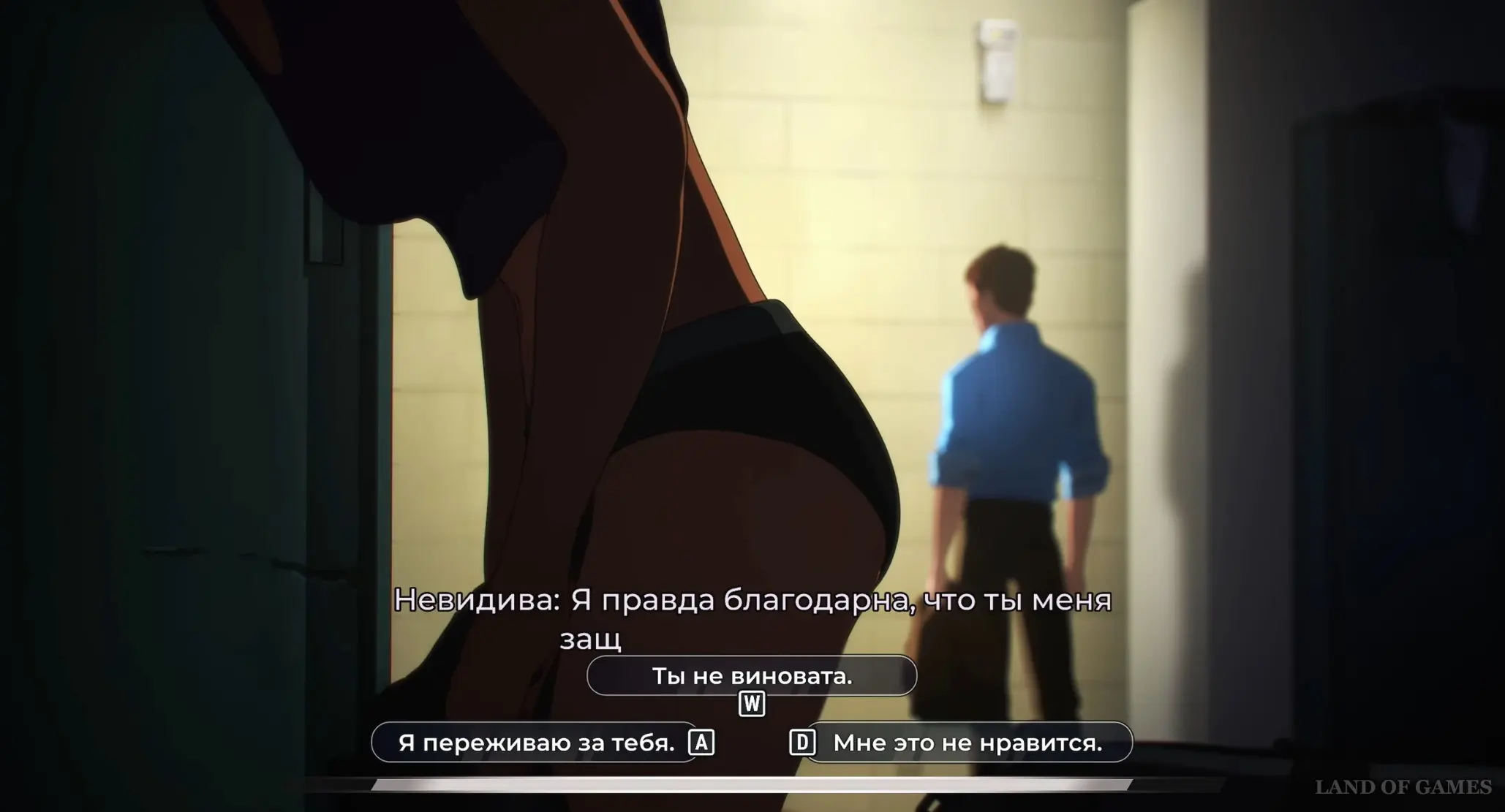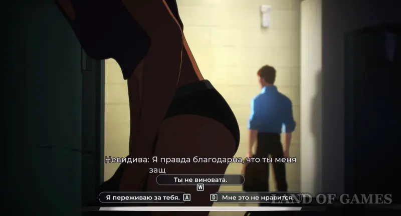 Сделав свой выбор, идем за Невидивой и встречаем ее в раздевалке. Затем говорим ей (данная сценка и ответы могут отличаться в зависимости от того, строим мы с ней роман или нет):