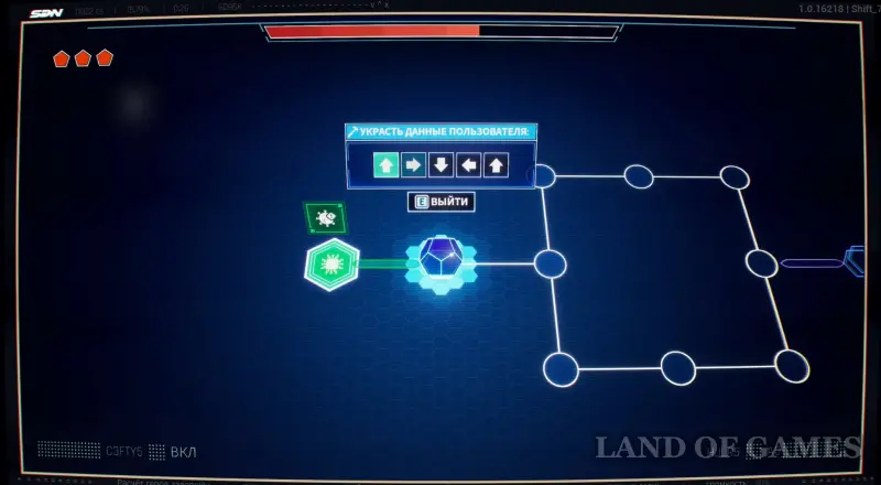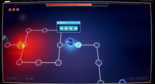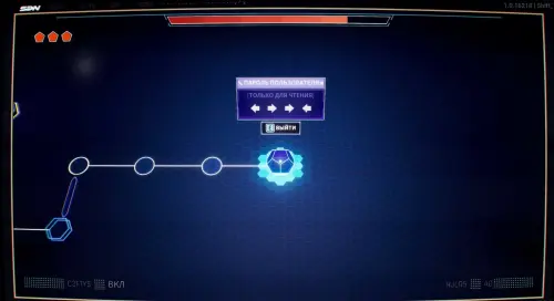 Вам нужно будет пройти испытание с взломом. Для этого необходимо сначала уничтожить антивирус наверху, заманив его к опоре электроэнергии, а затем пройти направо, стереть второй красный шар, подведя его к опоре. Далее добудьте ключ доступа: Влево, Вправо, Вправо и Влево.