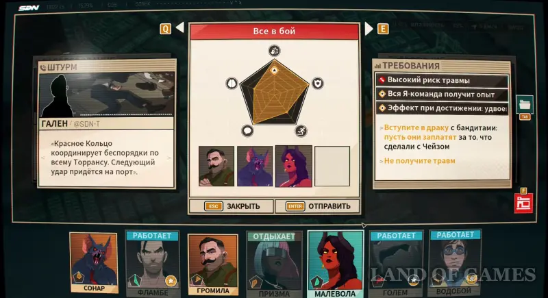 Если выберите «Все в бой», то вероятность получить травмы будет высокой, зато вся команда получит опыт. Рекомендуем в этом случае отправить Фламбе/Феномачо и Громилу/Малеволу и Голема или кого-нибудь с повышенным бесстрашием и стойкостью. Если общее бесстрашие команды превысит 5 единиц, то вы получите дополнительные очки опыта.
