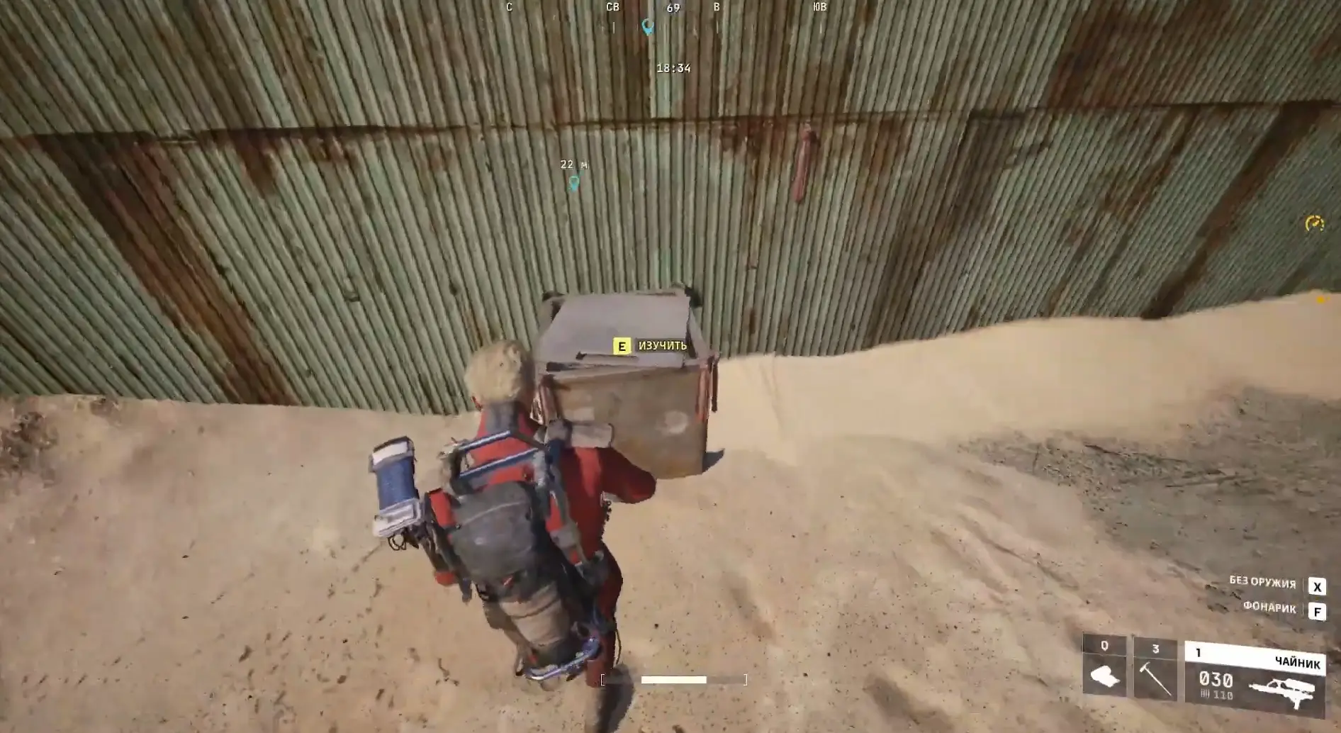 Теперь вам нужно найти небольшой ящик, спрятанный снаружи складского комплекса. Двигайтесь вдоль левой стены большого зеленого здания. У стены стоит неприметный контейнер прямоугольной формы – это и есть тот самый тайник.