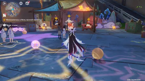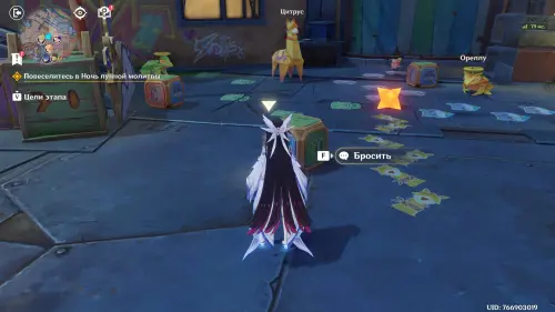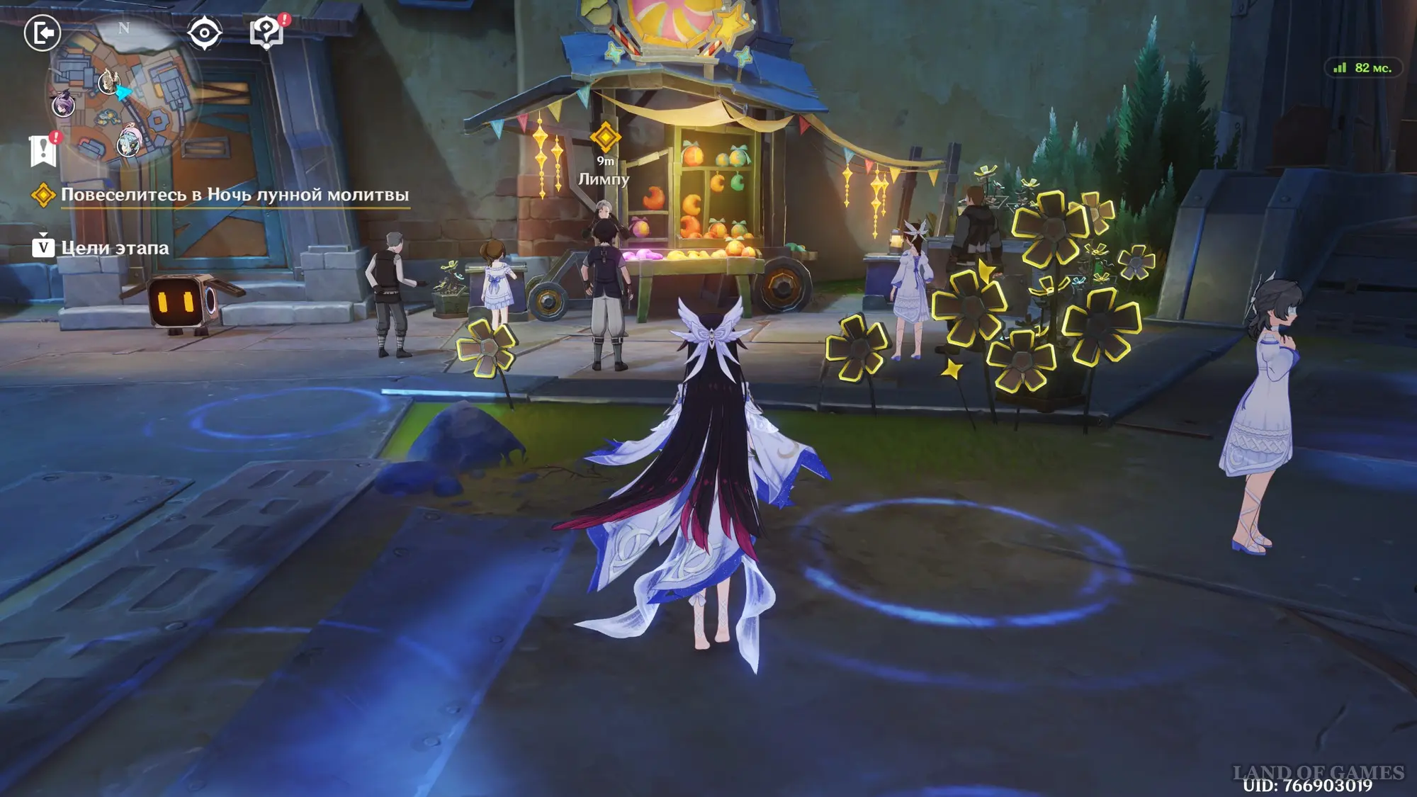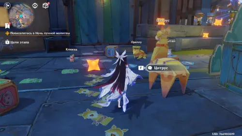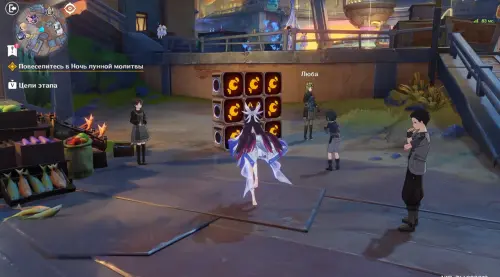 Примечание: Пройдите немного направо от предыдущего киоска и подойдите к бумажным зверькам. Поговорите с Цитрусом и посмотрите ролик, чтобы поучаствовать в настольной игре. Просто бросайте кубик и продвигайтесь вперед, пока не дойдете до финиша. Затем взаимодействуйте со сферой справа для получения 10 тысяч моры. Данная игра не связана ни с каким из киосков.