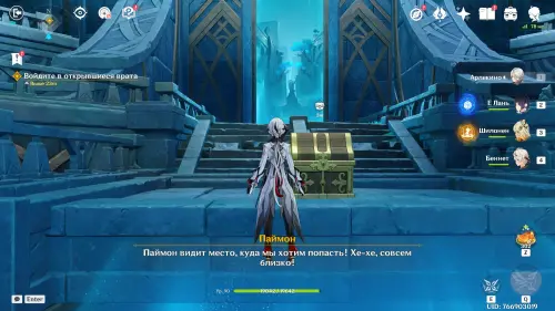 Продолжайте идти вперед и разберитесь с группой Гидро и Анемо слаймов, а также фантазмов. Потом подойдите к стене с рисунками и изучите их. Послушав рассказ Николь, заберите содержимое богатого сундучка.