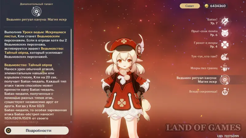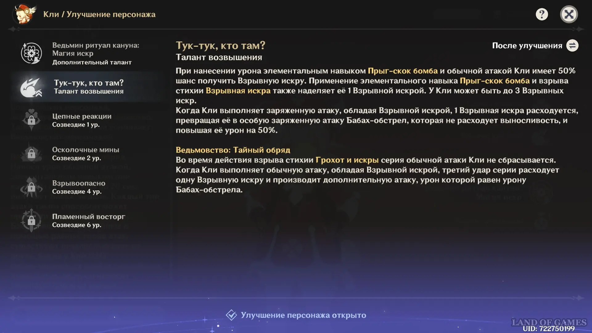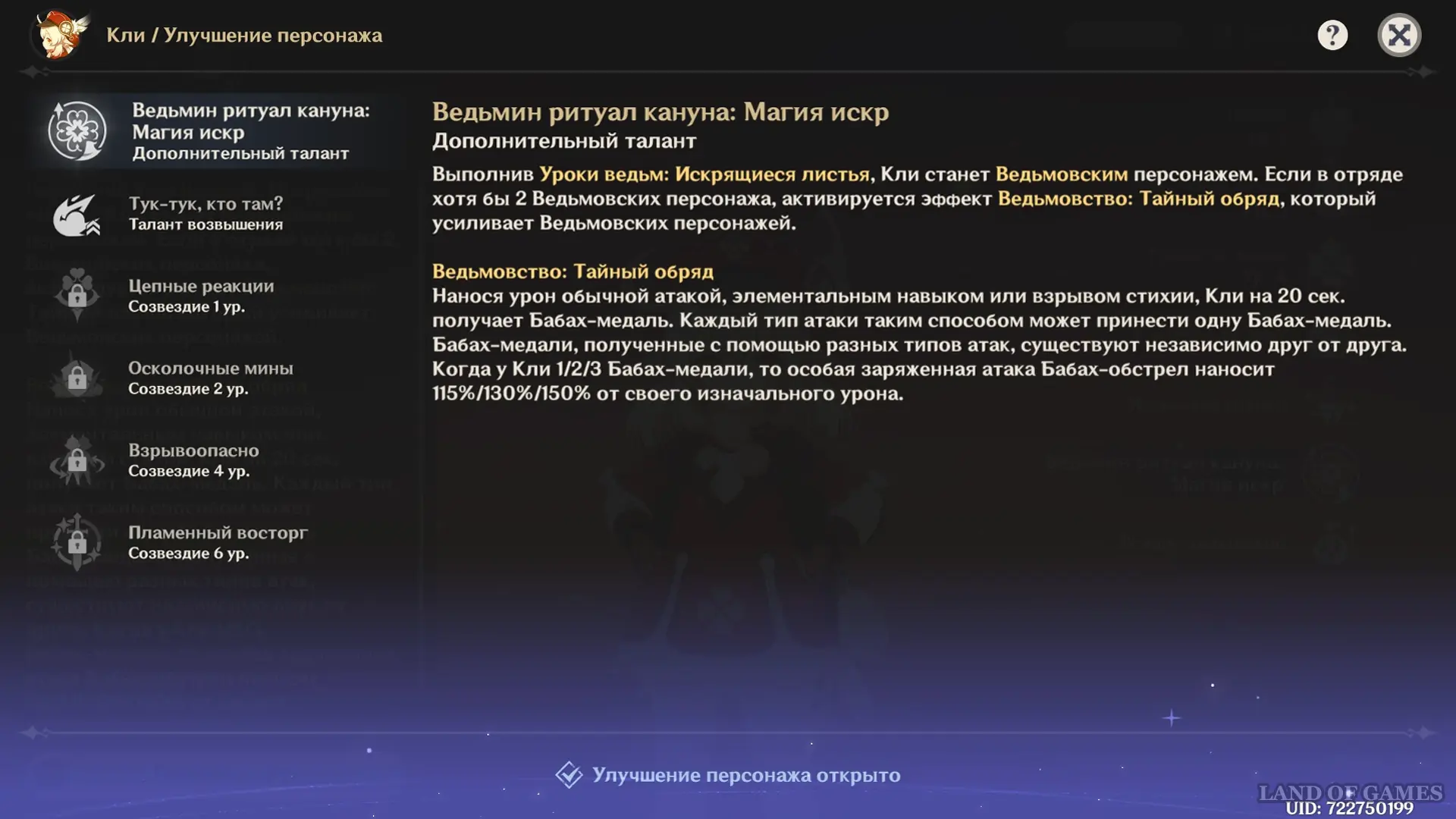 Эффект «Ведьмин ритуал кануна: Магия искр» активируется исключительно в составе отряда Шабаша и лишь при срабатывании резонанса Тайного Обряда – то есть когда в группе присутствуют минимум 2 персонажа этой фракции. Чтобы ознакомиться с полным перечнем особенностей умения, загляните в раздел талантов Кли и откройте расширенное описание предпоследнего пассивного навыка (воспользуйтесь подсказками на скриншотах выше или читайте подробнее в конце нашего общего гайда).