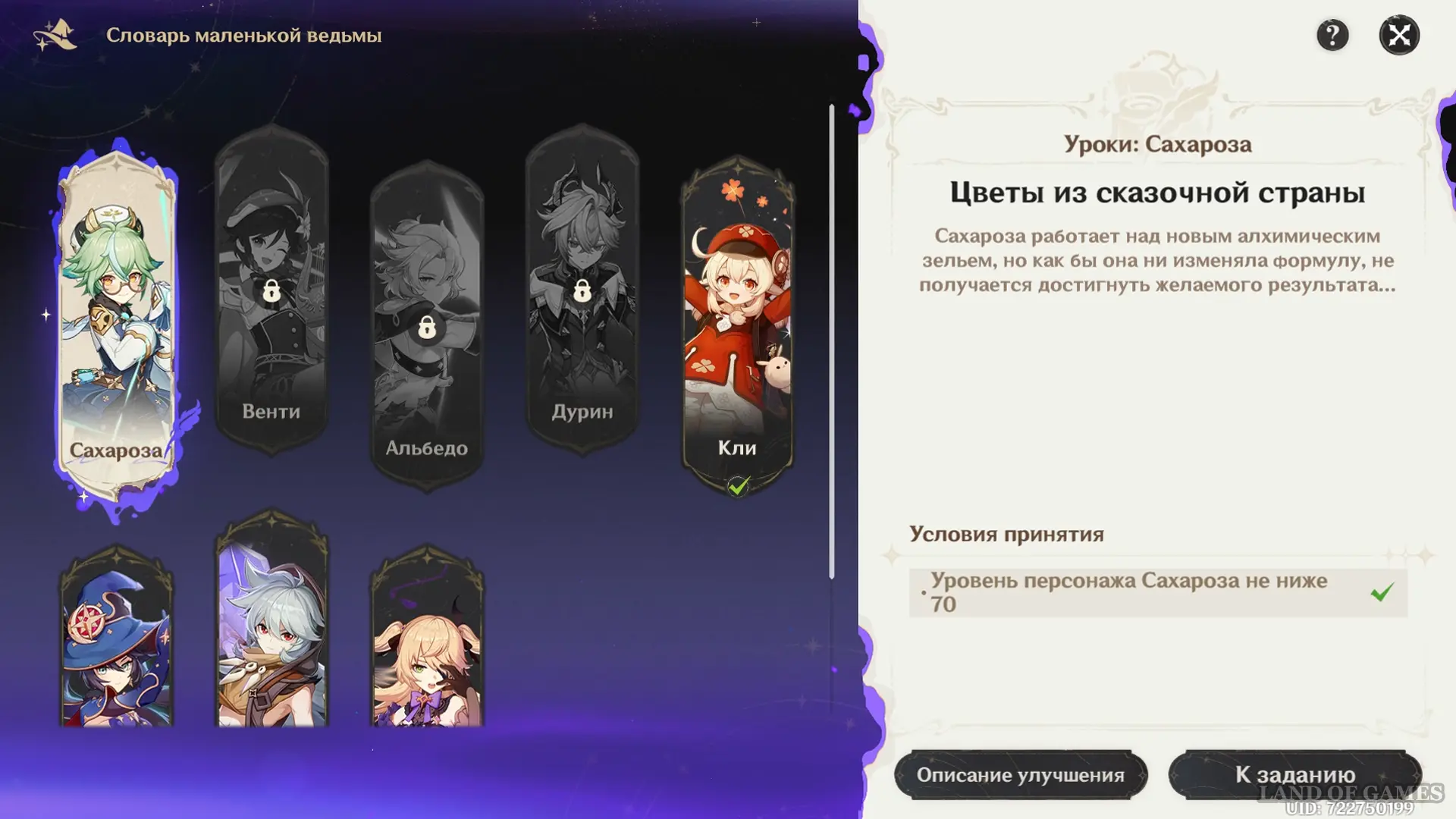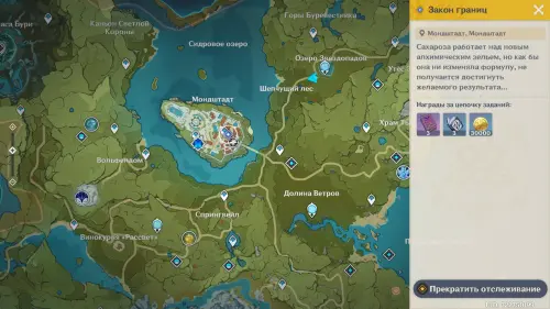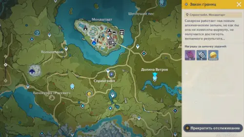 Попадите на торговую площадь в главном городе Анемо региона и поговорите с Сахарозой, стоящей у котла около алхимического верстака. Исследовательница уже работает над заданием Шабаша – изготовлением зелья роста. Но все получившиеся образцы, несмотря на идеальную формулу, оказываются нерабочими, поэтому герои решаются помочь подруге с уже 7-й версией эликсира.