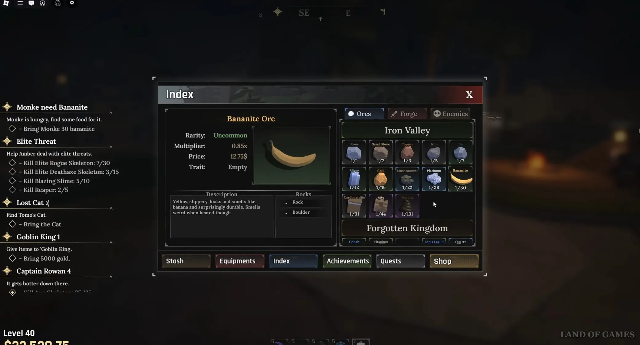 Ставьте портал и возвратитесь в первый мир «Крест Стоунвейка» (Stonewake’s Cross), а потом отправляйтесь в Пещеру (Cave). Перед этим вы можете просмотреть в разделе «Индекс» (Index) в своем инвентаре, откуда именно выпадает бананитовая руда. Итак, добыть ее можно из камней (Rock) и булыжников (Boulder), причем шансы на выпадение составляют 1 к 30, что весьма неплохо, но вы можете повысить их, выпив перед этим зелье удачи (Luck Potion).