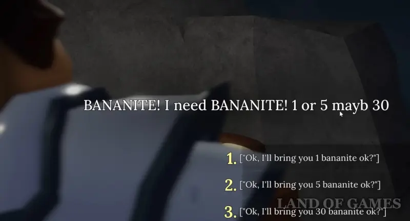 Обезьяна скажет вам, что она голодная. Выберите ответы: «Can I help ya» и, она попросит вас принести ей 1, 5 или 30 бананитов. Если вы хотите получить максимальную награду, то скажите, что принесете ей 30 кусков: «Ok, I’ll bring you 30 bananite ok?».