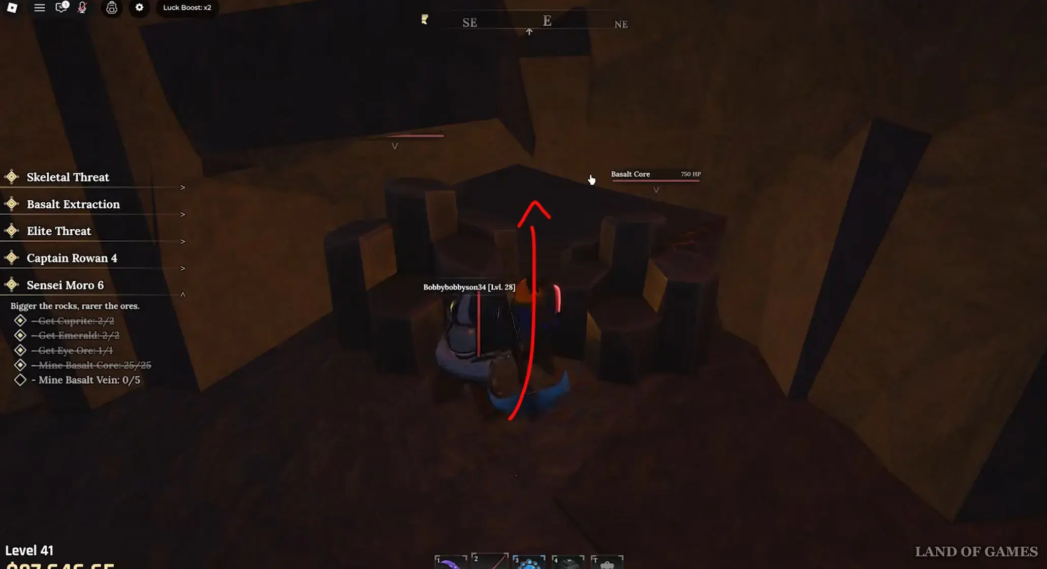 После перемещения в новую локацию, снова поговорите с Сенсеем Моро рядом с другой кузницей (выше мы указали его расположение), чтобы получить от него следующее задание – вам предстоит добыть 3 кобольта (Cobalt) и сломать 10 штук Базальтовых камней (Basalt Rock), из которых собственно и выпадает кобольт.
