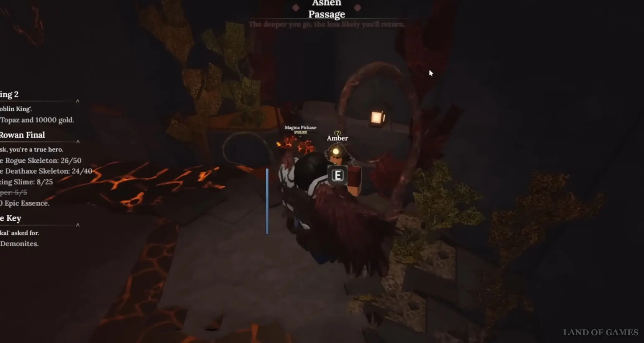 Пройди в Разрушенную пещеру в Забытом Королевстве, а затем пройдите направо, чтобы попасть в Пепельный проход (Ashen Passage) и, когда на стенах начнут появляться магмовые жилы, сверните еще раз вправо. Идите мимо лавовых отростков и дойдите до противоположной стены. Здесь вы обнаружите Эмбер, стоящую возле Магмовой кирки.