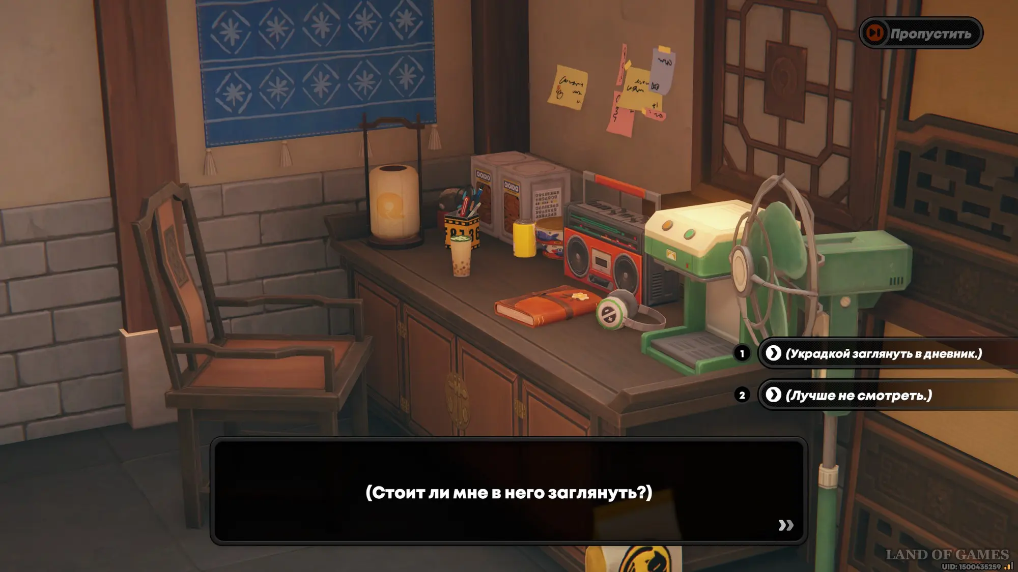 Затем войдите в комнату лисички, где вы можете заглянуть в ее дневник. Если сделаете это, то все равно ничего не узнаете, так как откажетесь читать дальше. Во время разговора с сяо-Гуан можете рассказать, что заглянули в дневник – ваш разговор все равно прервут. Потом начните задавать девушке разные вопросы о прошлом (это не повлияет на концовку или награды, а лишь слегка изменит ответы).