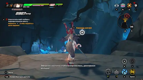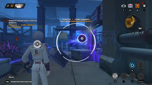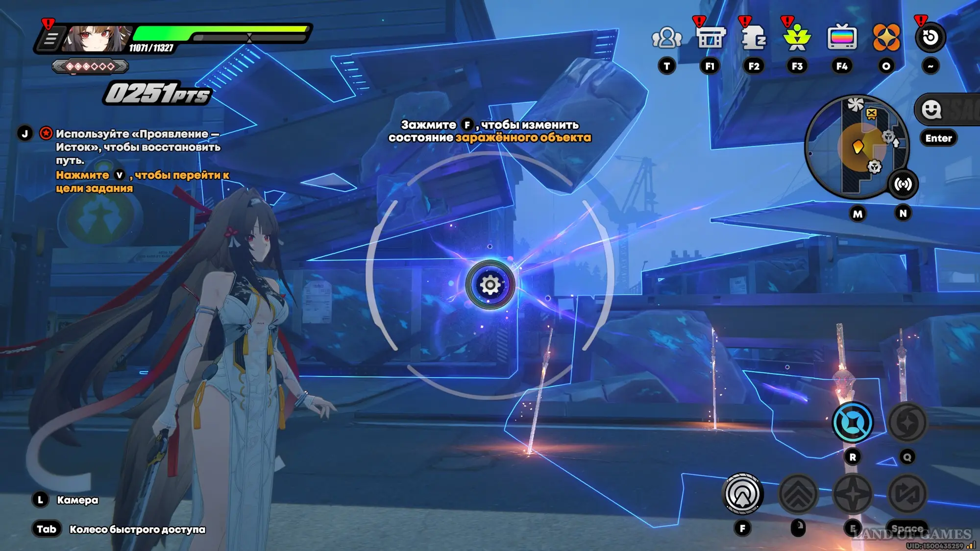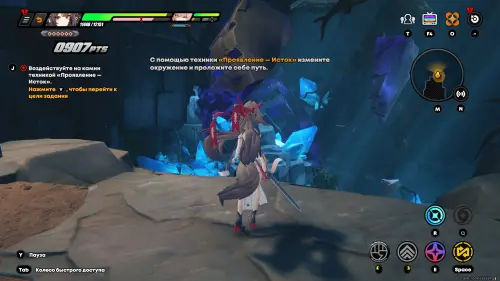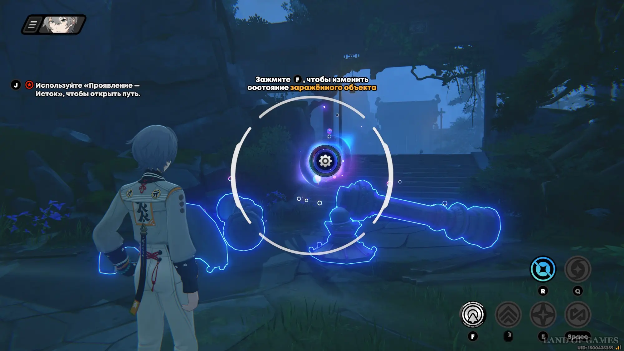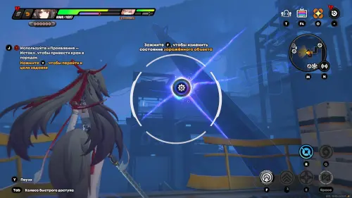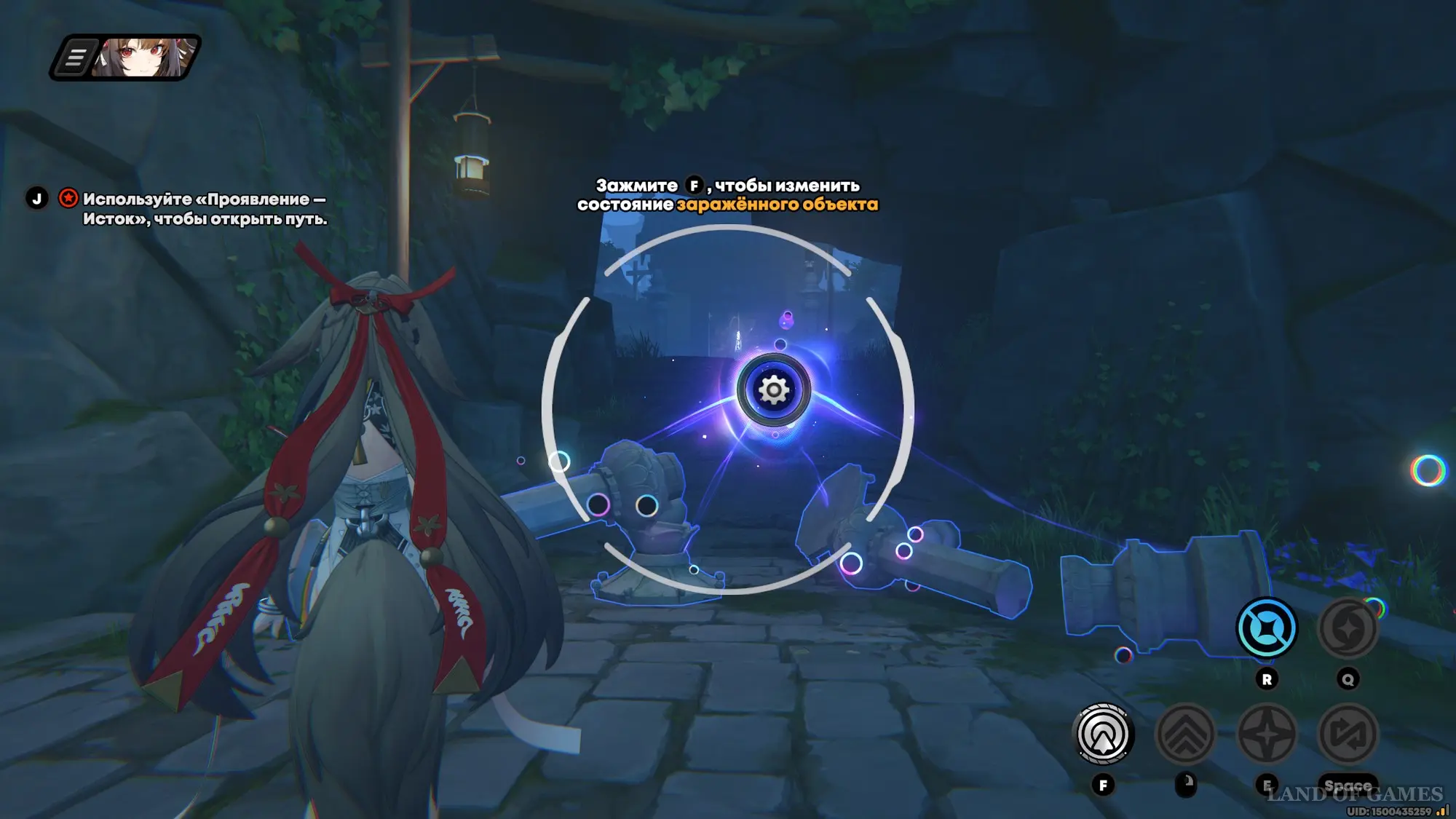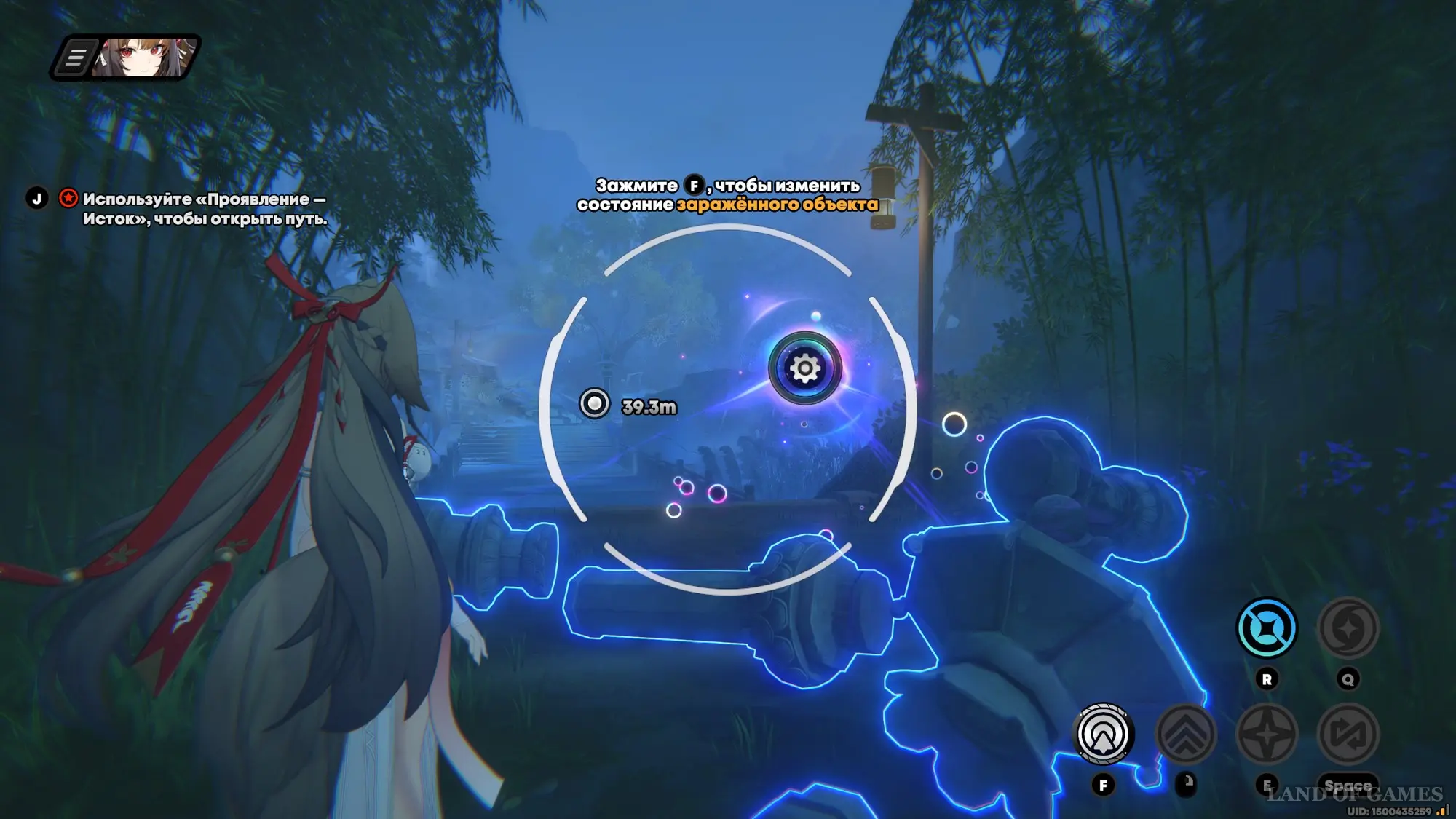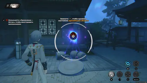 Начните двигаться к квестовому маркеру (кстати, если вы зажмете кнопку уклонения, то сможете летать на ножнах меча), сражаясь по пути с монстрами. Затем догоните загадочного банбу, войдя в здание. Гляньте ролик, а потом воспользуйтесь техникой «Проявление – Исток», нажав сначала клавишу «R», а потом, наведя на круг с шестеренкой и зажав клавишу «F», дабы изменить состояние зараженного объекта. Тем самым вы разблокируете себе путь вперед и сможете догнать банбу.