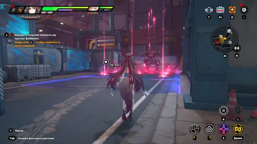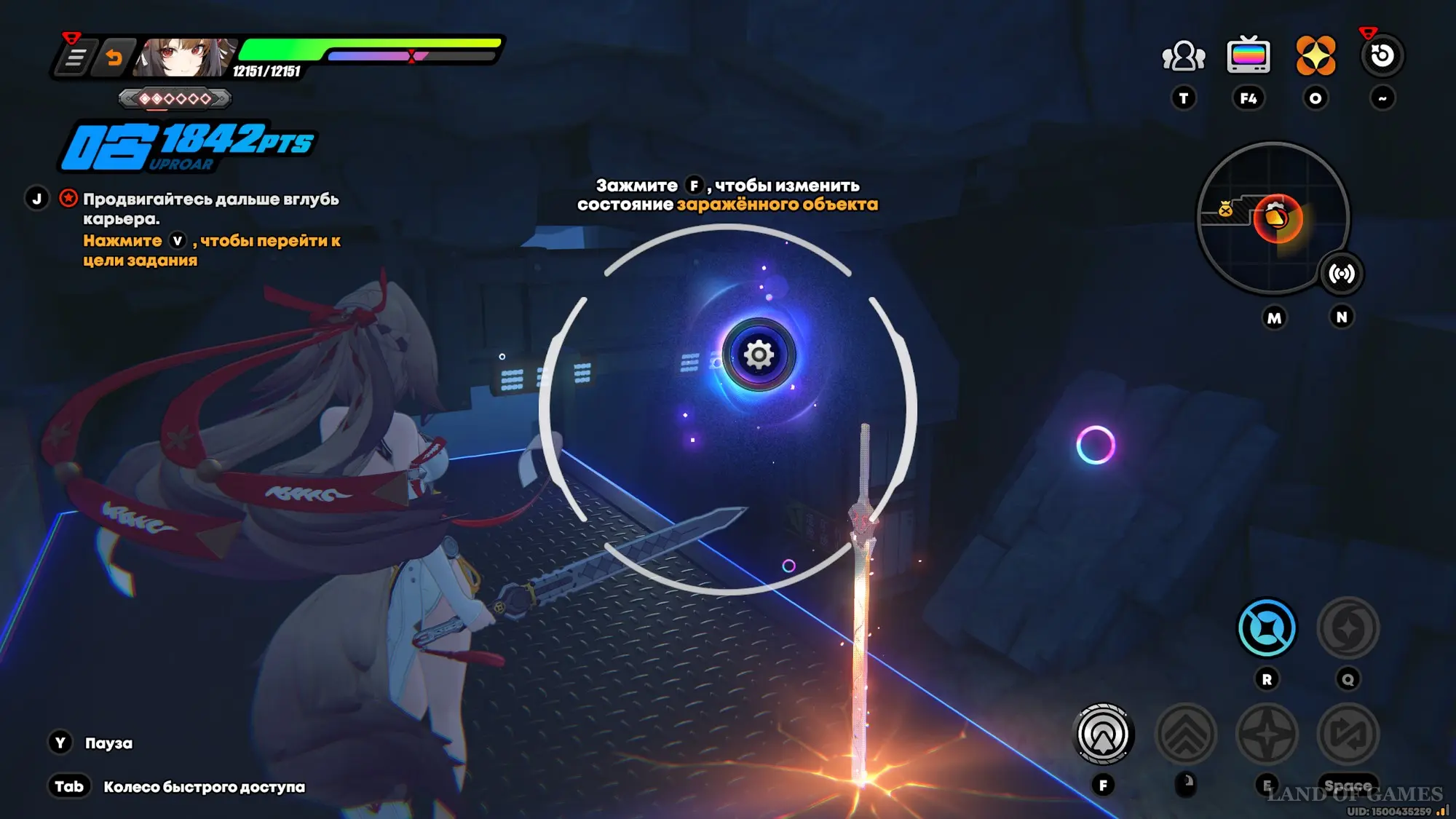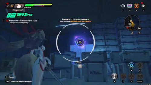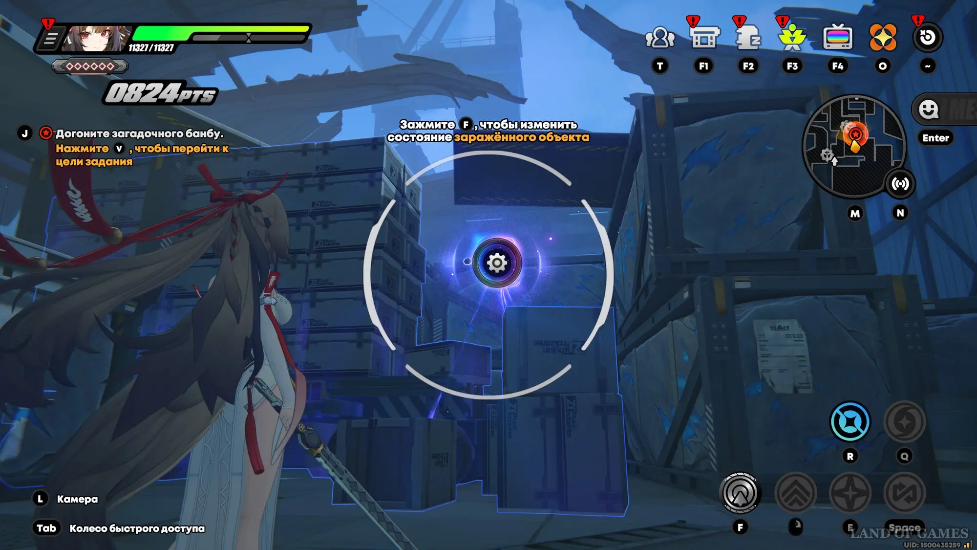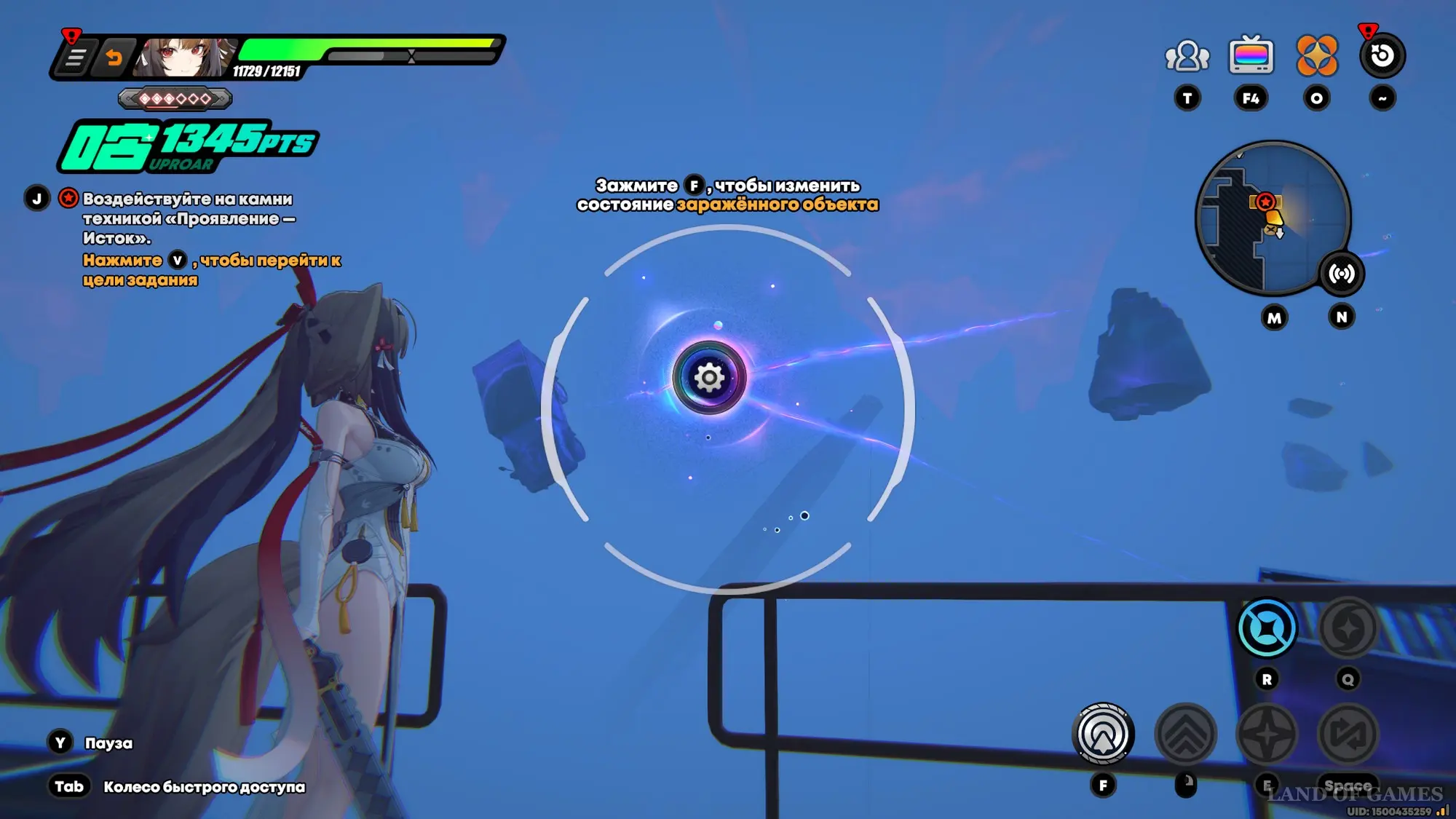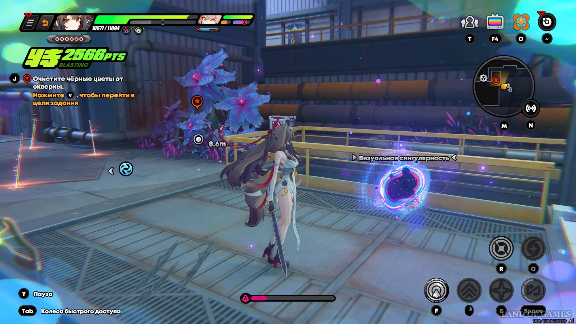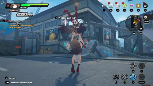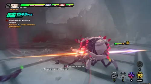 Начните двигаться к квестовому маркеру (кстати, если вы зажмете кнопку уклонения, то сможете летать на ножнах меча), сражаясь по пути с монстрами. Затем догоните загадочного банбу, войдя в здание. Гляньте ролик, а потом воспользуйтесь техникой «Проявление – Исток», нажав сначала клавишу «R», а потом, наведя на круг с шестеренкой и зажав клавишу «F», дабы изменить состояние зараженного объекта. Тем самым вы разблокируете себе путь вперед и сможете догнать банбу.