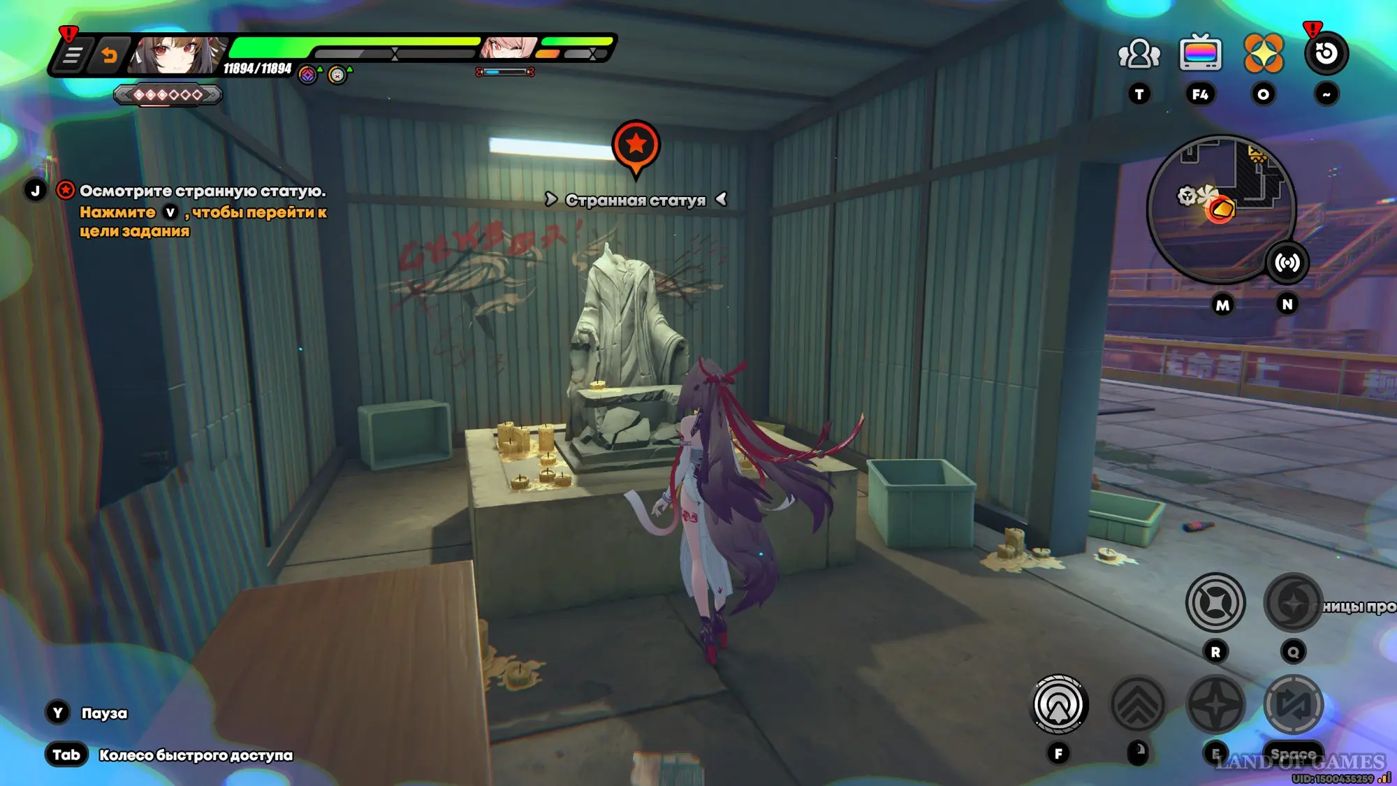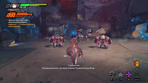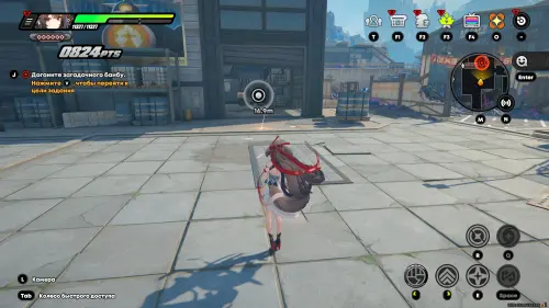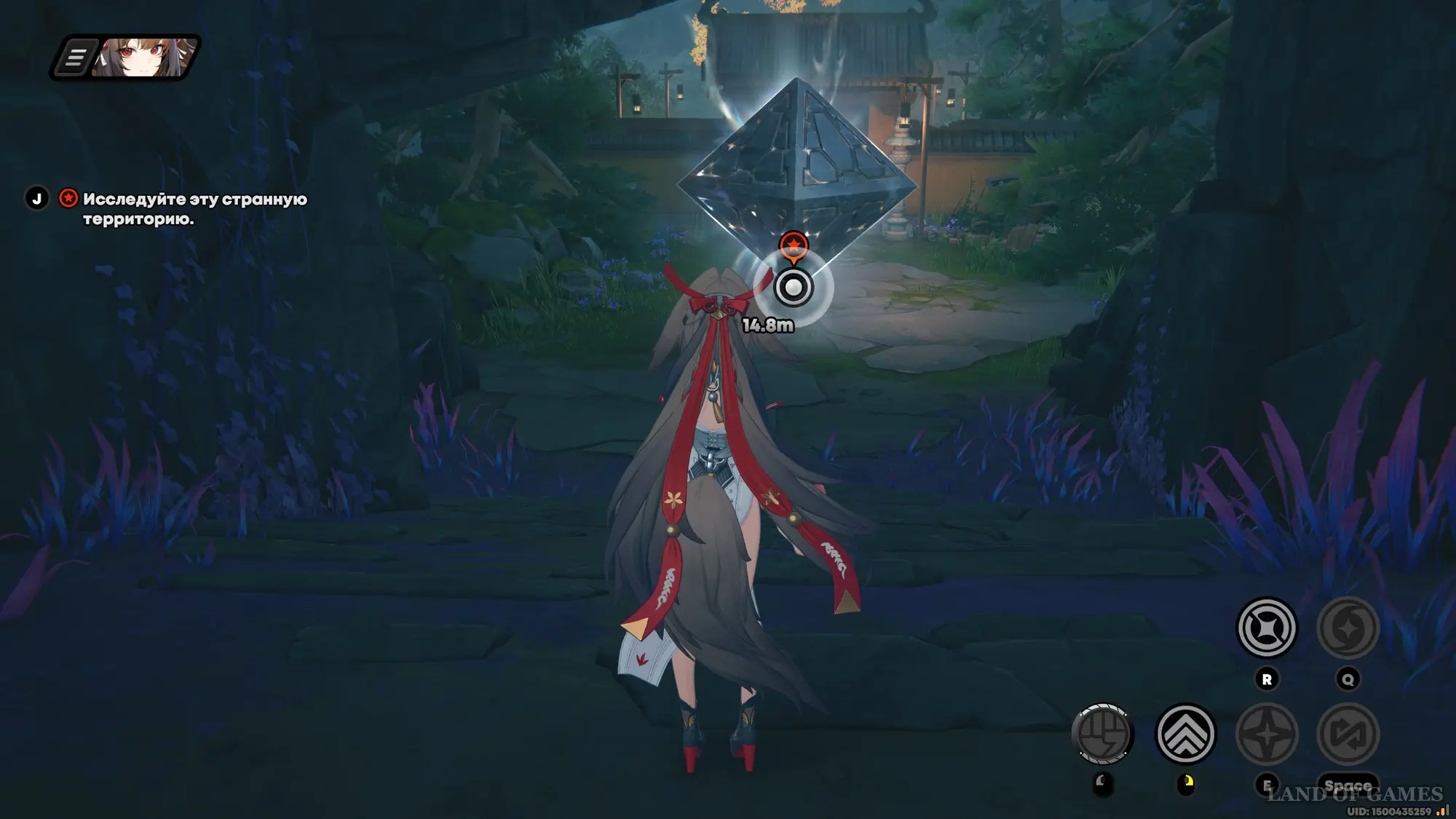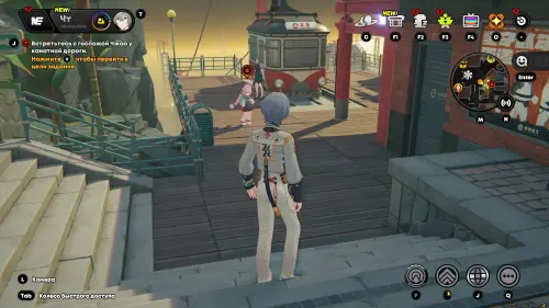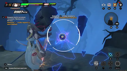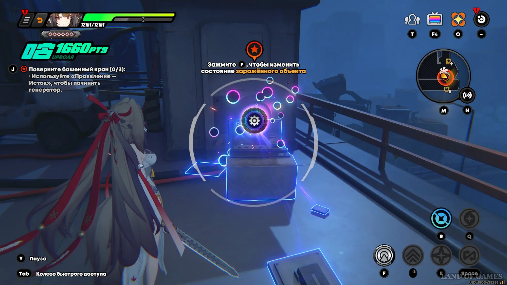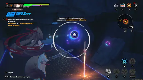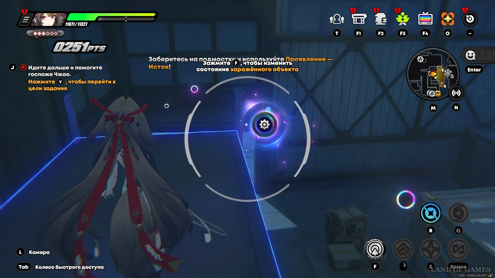 Начните двигаться к квестовому маркеру (кстати, если вы зажмете кнопку уклонения, то сможете летать на ножнах меча), сражаясь по пути с монстрами. Затем догоните загадочного банбу, войдя в здание. Гляньте ролик, а потом воспользуйтесь техникой «Проявление – Исток», нажав сначала клавишу «R», а потом, наведя на круг с шестеренкой и зажав клавишу «F», дабы изменить состояние зараженного объекта. Тем самым вы разблокируете себе путь вперед и сможете догнать банбу.