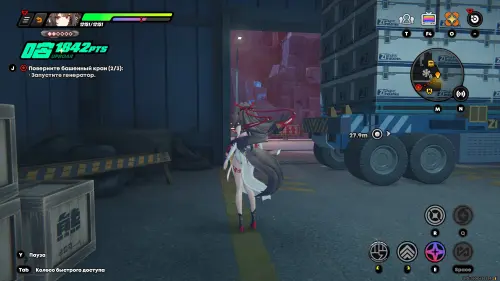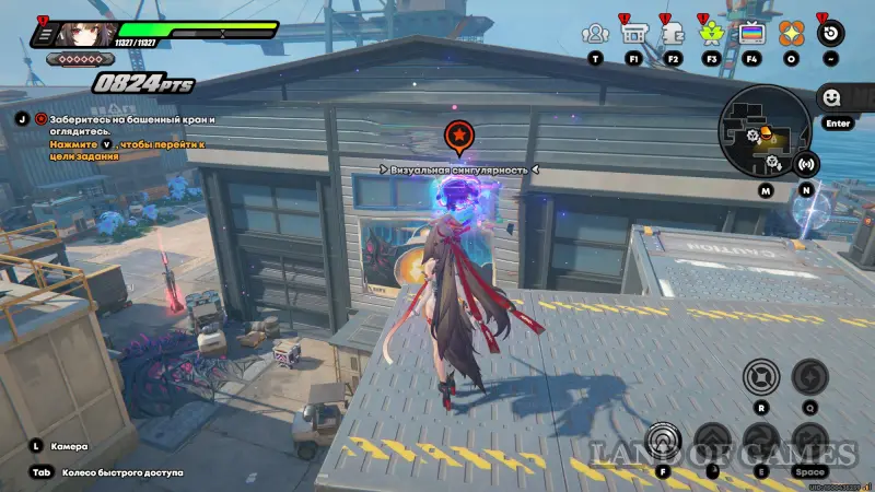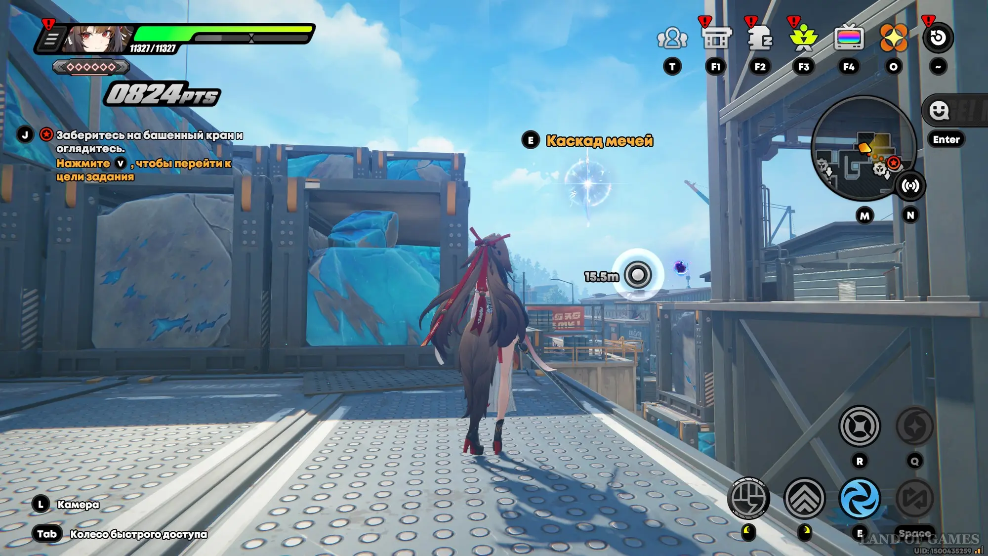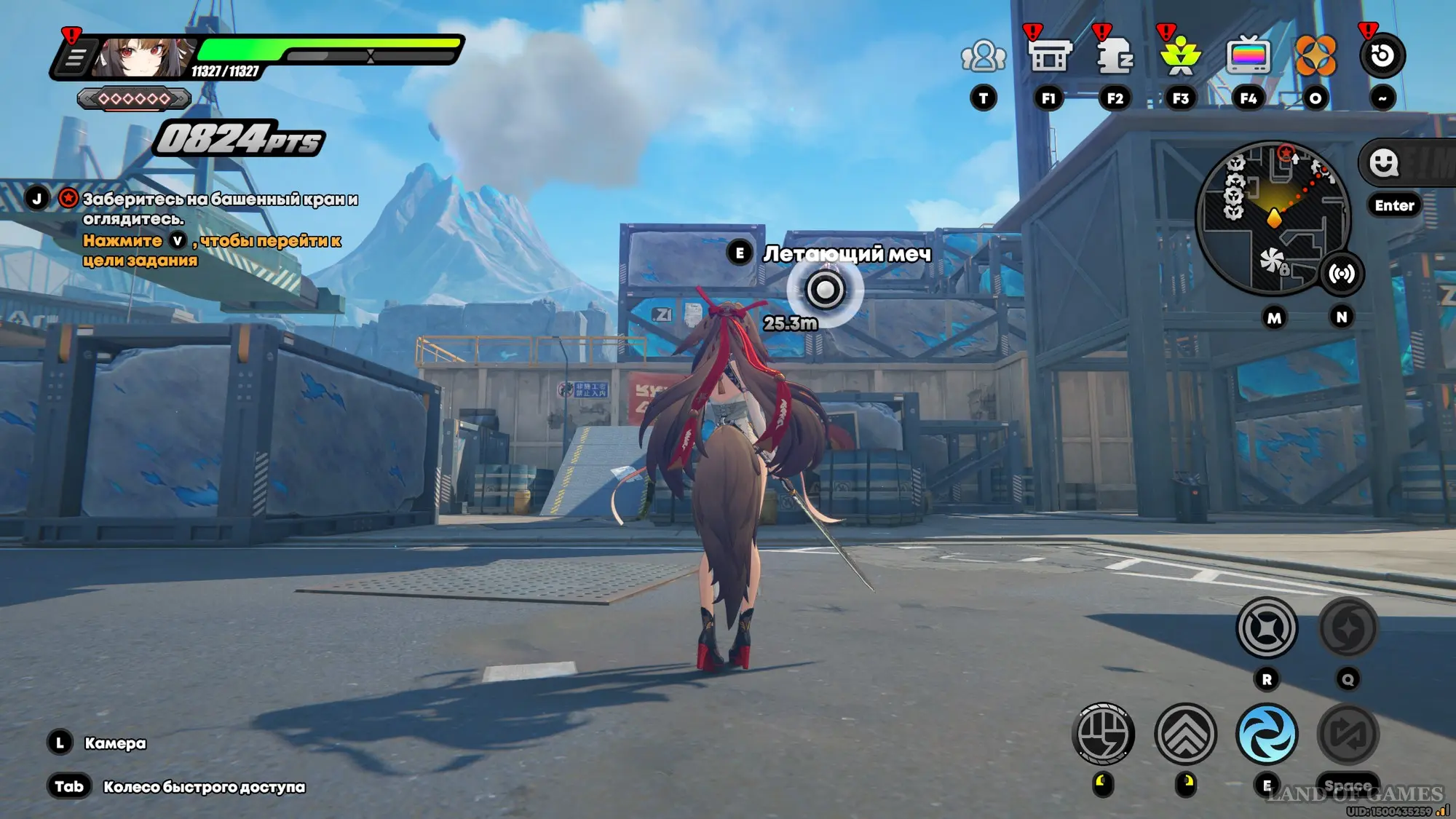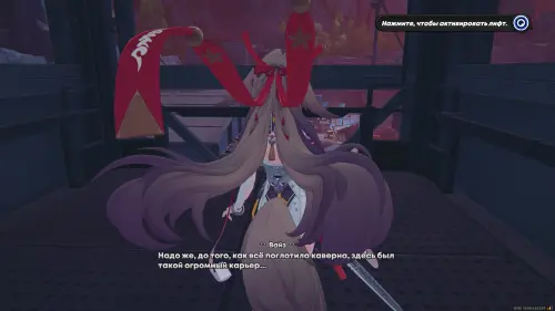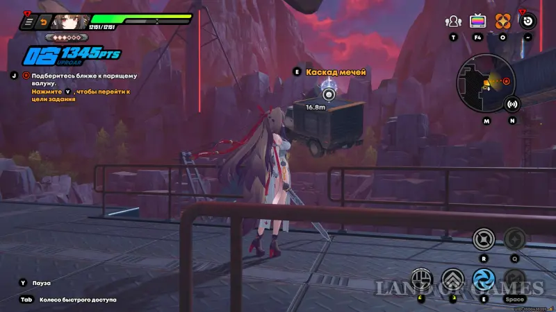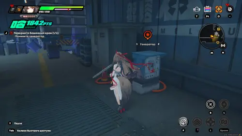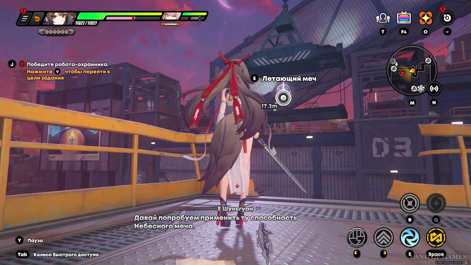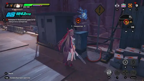 Двигайтесь вперед, а затем пролетайте мимо (зажмите ПКМ) роботов, стреляющих ракетами, правильно подгадав момент. Потом сядьте в подъемник и поднимитесь наверх. Продолжайте пролетать мимо ракет и встаньте на конце металлического помоста с разрушенным ограждением. Используйте «Проявление – Исток» для починки крана. Воспользуйтесь метками меча, чтобы перебраться на другую сторону.