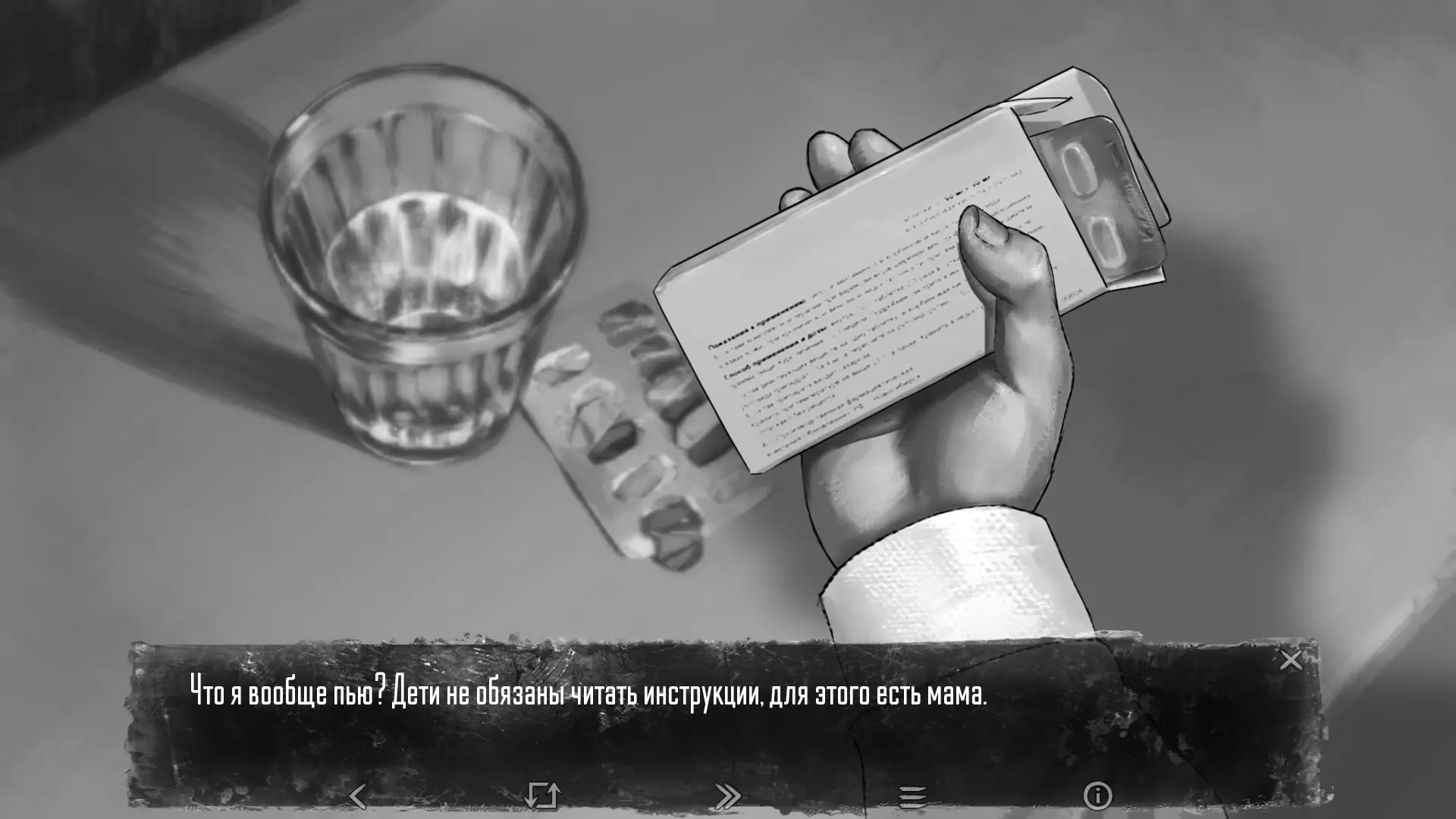В этот момент Антон обращает внимание на таблетки, которые он принимает. Он читает описание: препарат снижает агрессию, тревогу и мании, но вызывает зависимость и при неправильной дозировке может привести к летальному исходу. Несмотря на это, нам предлагается принять таблетки и отказаться от этого выбора невозможно.