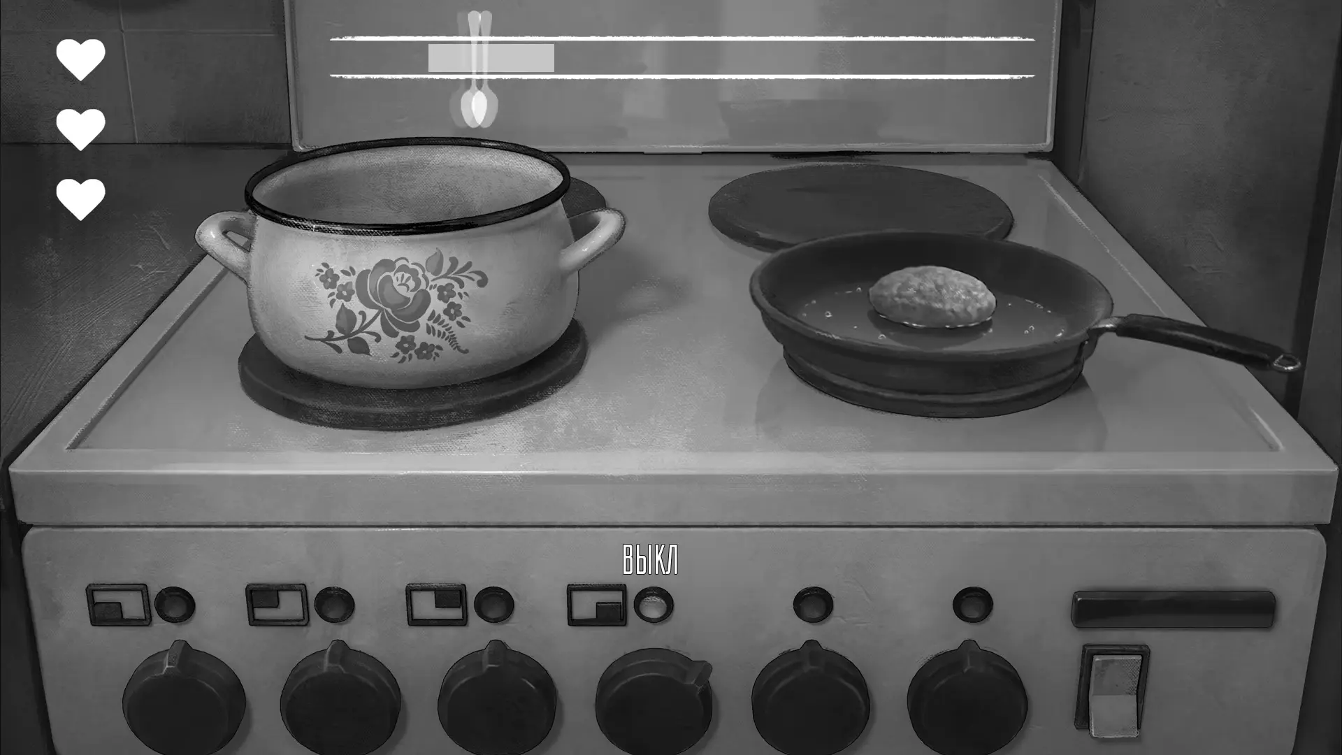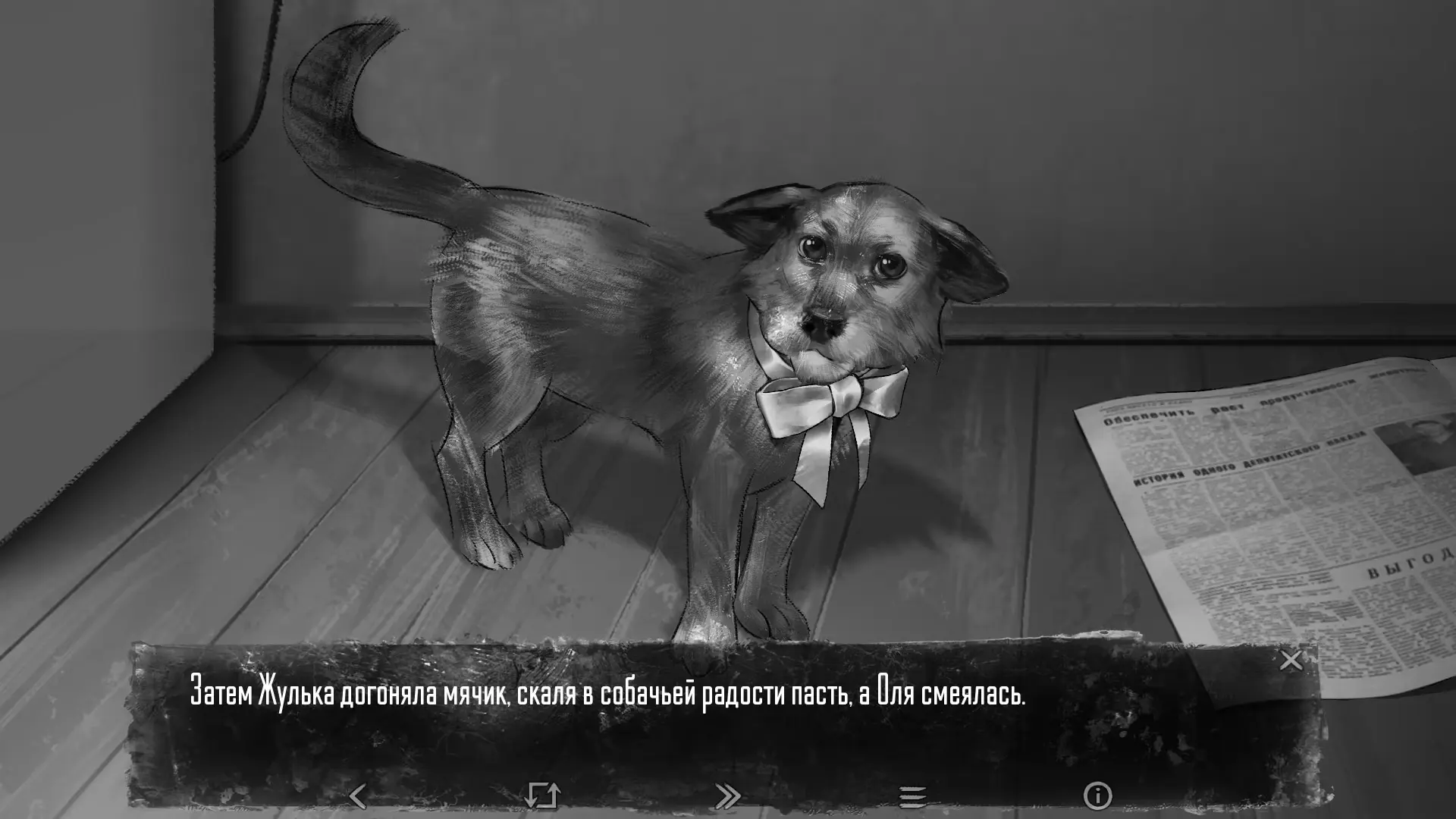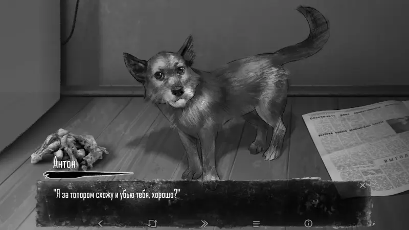 Далее нам дают возможность открыть морозильник, достать суповые кости, постелить газету на полу и подготовить кухню. В кладовке под лестницей Антон находит топор. Уже на этом этапе в его мыслях появляется страшная идея: возможно, мясо собаки сможет утолить голод стаи и спасти его с сестрой от страшной участи.
