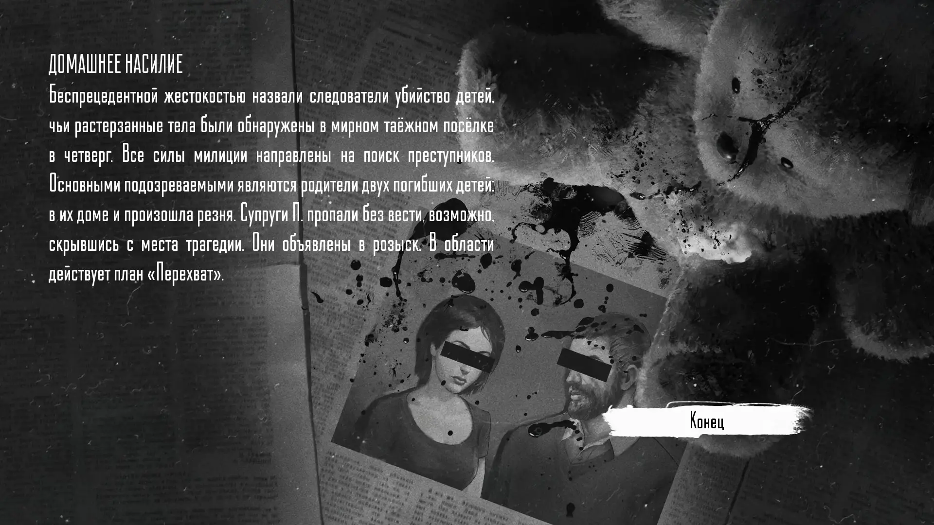 В ветке Зайчика-одиночки Антон возвращается домой, вновь оказывается с больной Олей и Жулькой, и история практически замыкается. Он щадит собаку, принимает таблетки, заколачивает окна и впускает мать. Та оказывается Зайчихой, и вместе с Хозяином Леса звери уничтожают семью. Газеты называют это случаем жестокого семейного убийства. Это концовка «Домашнее насилие».