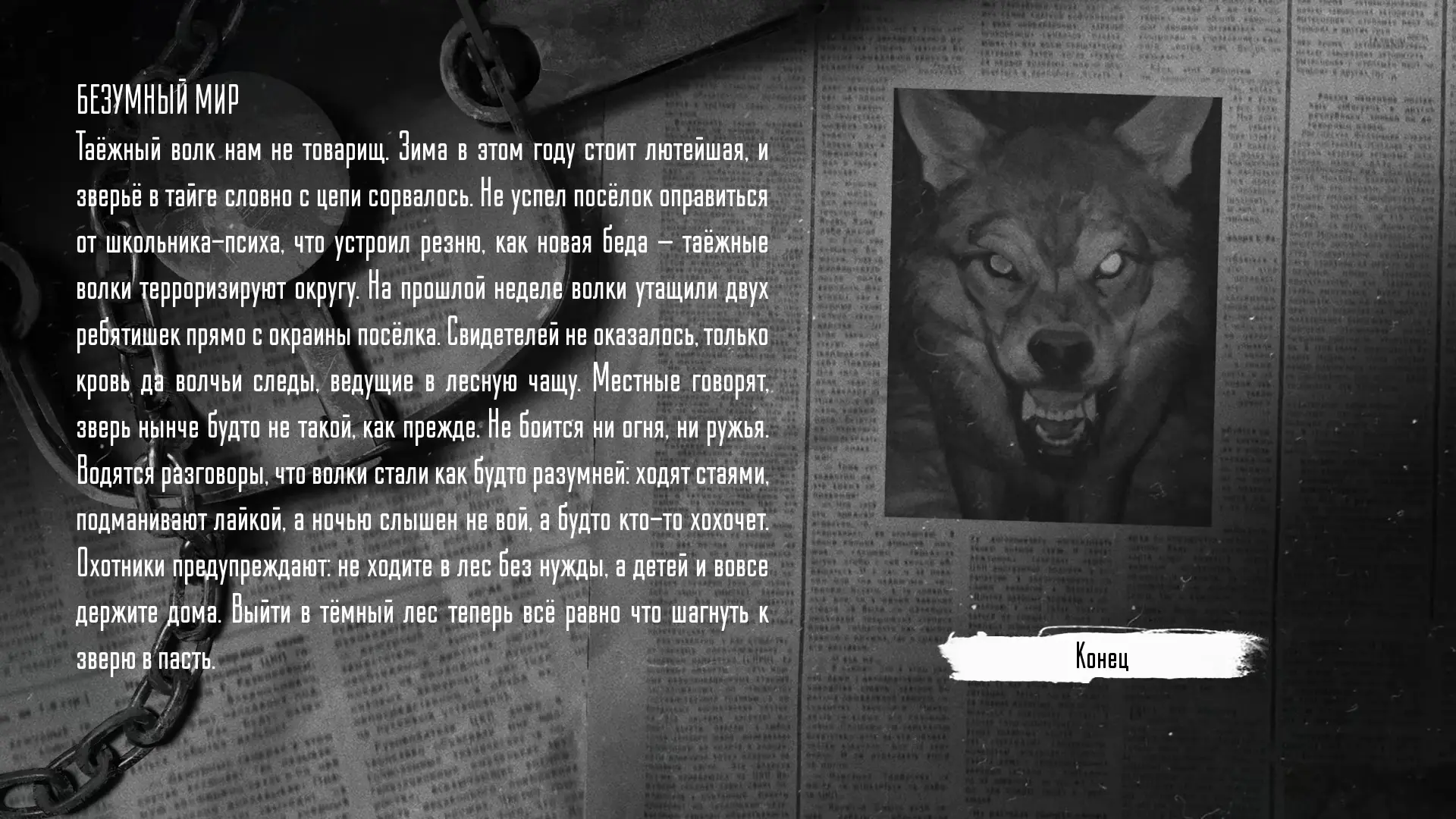 Там Тихонов объясняет Антону, что звери – плод его болезни. Он приводит примеры реальных маньяков, действовавших из-за психозов, и постепенно вскрывает правду: Антон убивал детей, оправдывая свои действия голосами зверей. Семен, Катя, Вова и другие жертвы всплывают в его памяти. В итоге Антона отправляют в психиатрическую больницу, где он доживает свои дни, продолжая верить в зверей и ждать весны. Это концовка «Безумный мир».
