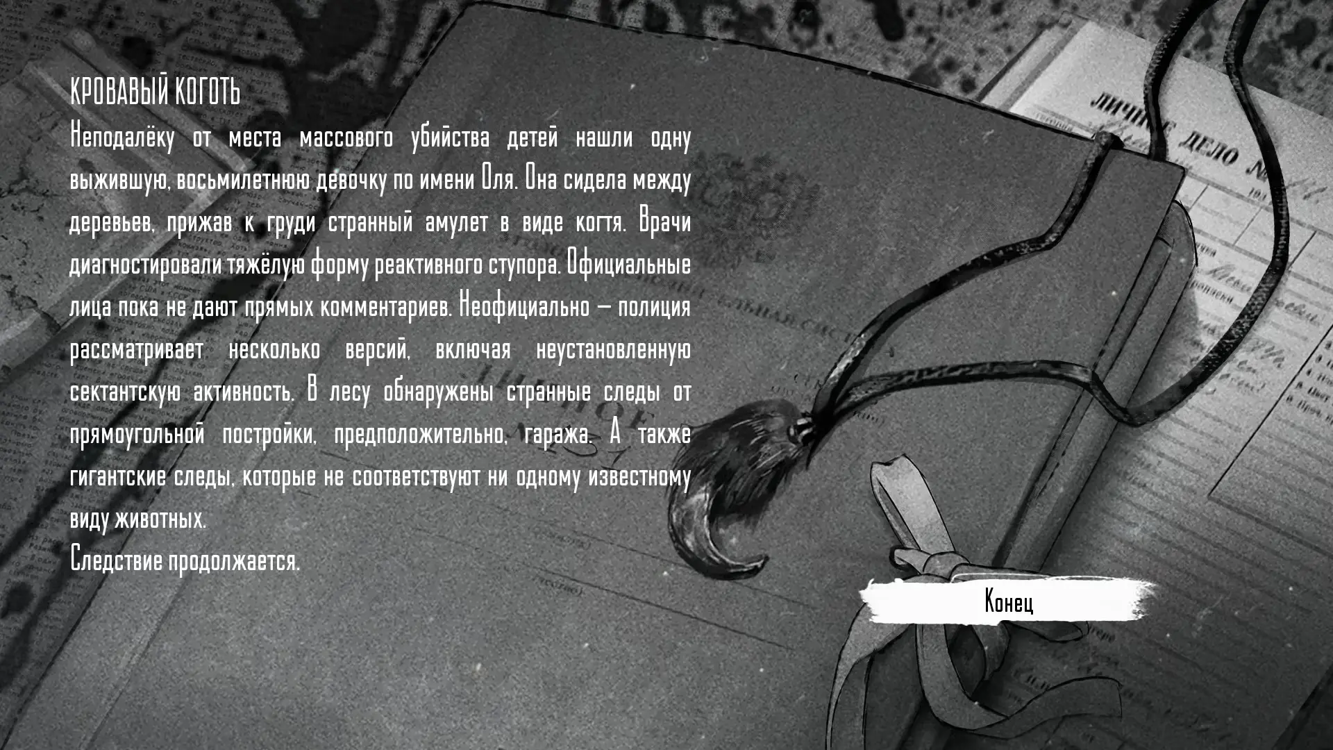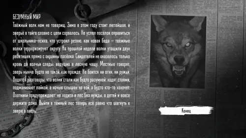 Если выбрать амулет, отдать собачатину, а затем отдать амулет Оле, звери обвиняют Антона в предательстве. Волчик защищает его, но из его плоти появляется Рома, который убивает Волка. Хозяин Леса превращает Рому в нового Волка. В итоге Антона убивают, а все звери превращаются в обычных животных. Оля выживает, прижимая к груди амулет. Газеты пишут о странных следах и признаках сектантской активности.