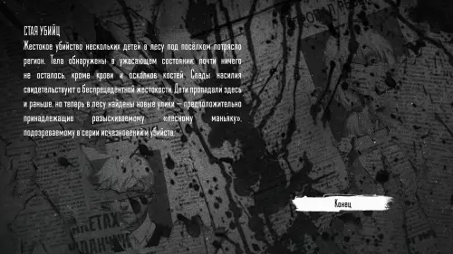 Антон спасает Олю, Рома подхватывает Полину. Однако вскоре Сова вырывает Олю из рук Антона, Полина исчезает, а Рома остается без головы. Звери убивают всех, и газеты сообщают о найденных в лесу костях детей. Это концовка «Стая убийц».