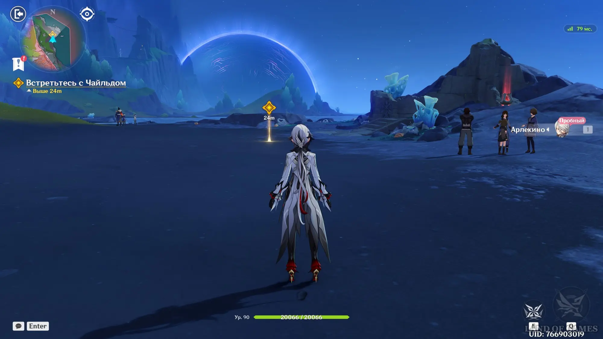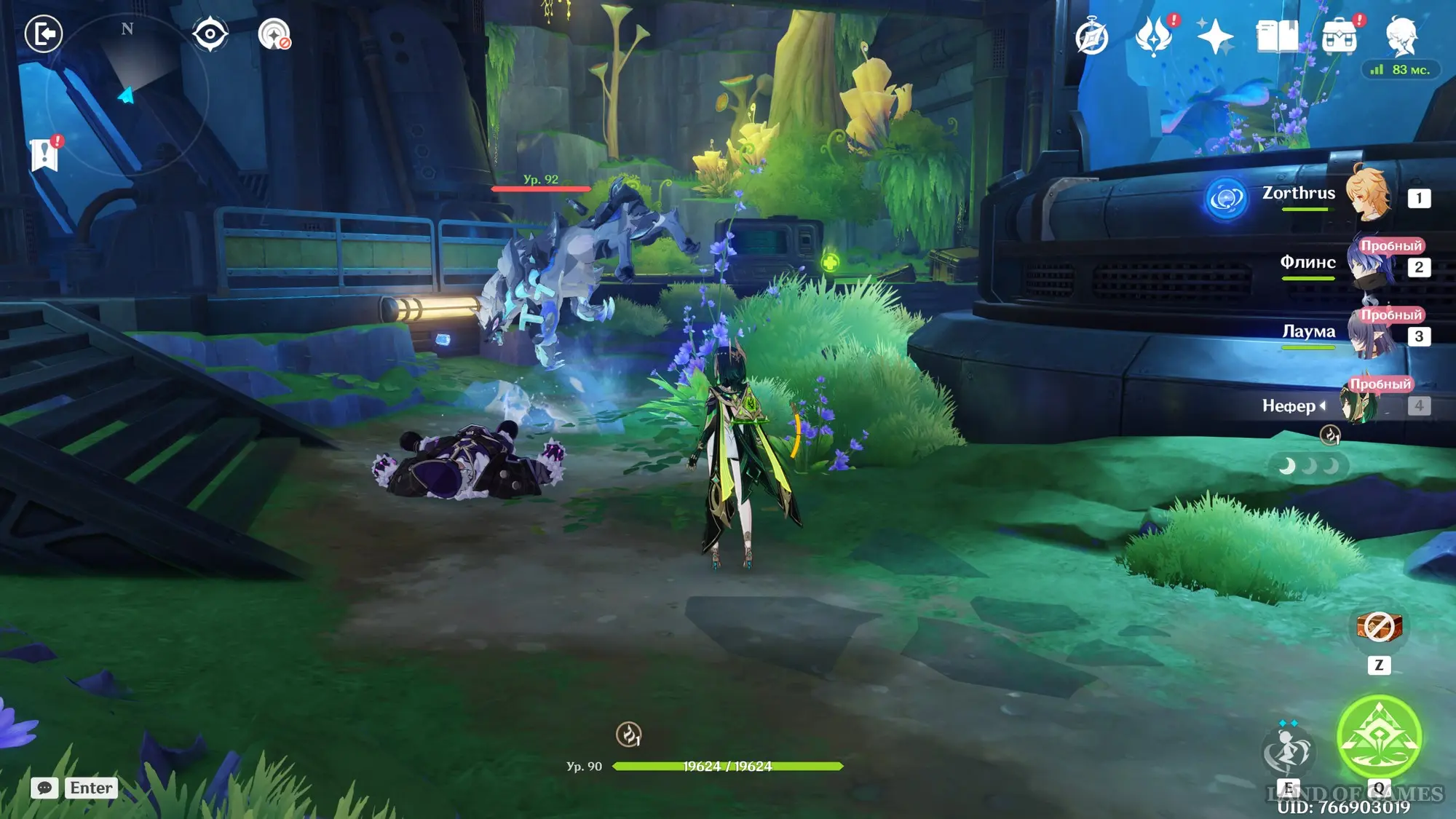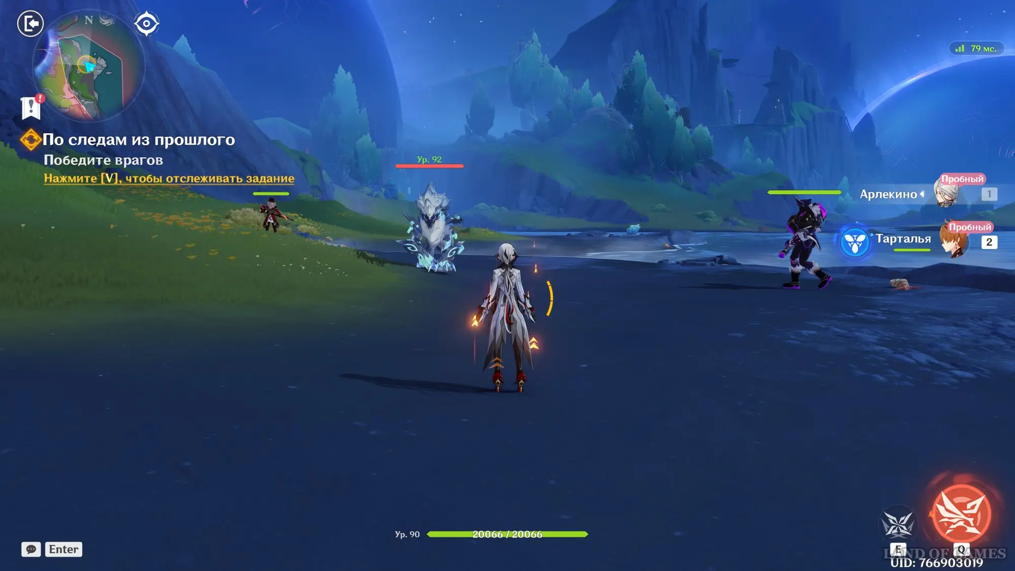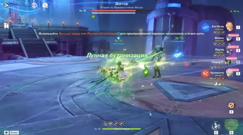 Сняв у врага примерно 15% здоровья, к вам присоединиться Арлекино, которой вы тоже сможете управлять – используйте ее Е-шку, а потом наносите Пиро урон обычными и заряженными атаками. Вскоре Доктор создаст себе щит, для уничтожения которого необходимо воздействовать Лунным зарядом (Электро + Гидро) или Лунной бутонизацией (Дендро + Гидро) на механизмы в форме дротиков неподалеку.