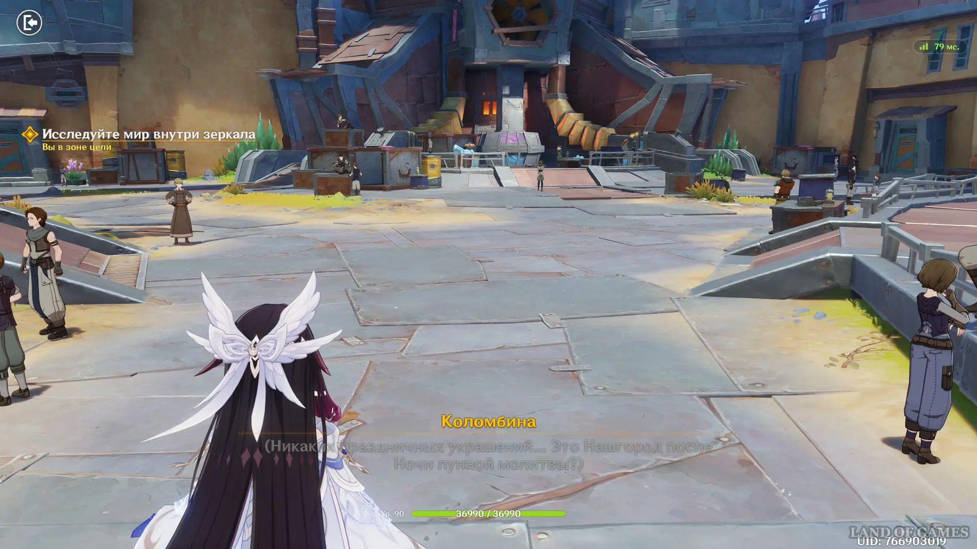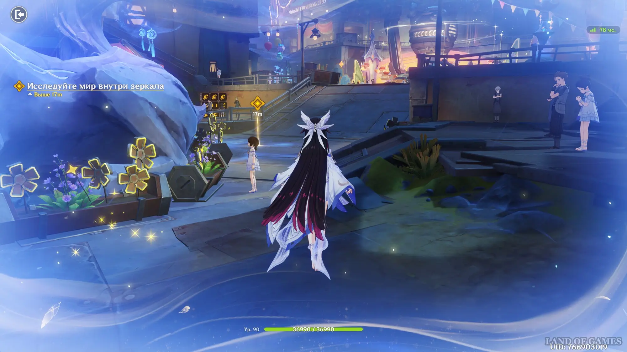 Взяв под управление Коломбину, двигайтесь вперед к квестовому маркеру и используйте заряженную атаку (долгое нажатие ЛКМ) на белом вихре впереди, а затем начните следовать за золотыми линиями и войдите в мир внутри зеркала. Начните его исследование – просто следуйте за указателями, придя в конце к киоску ведьм и послушав Барбелот.