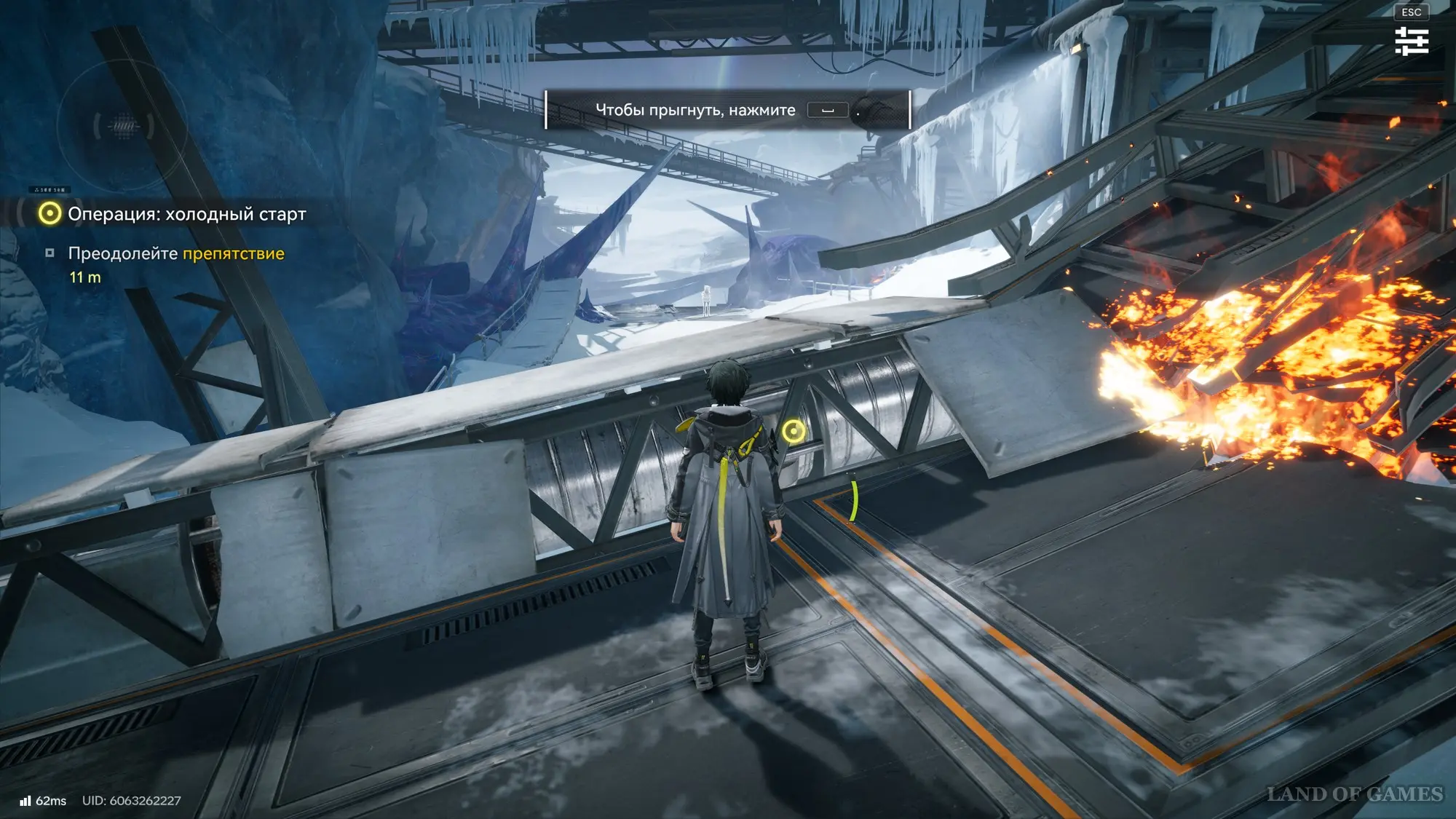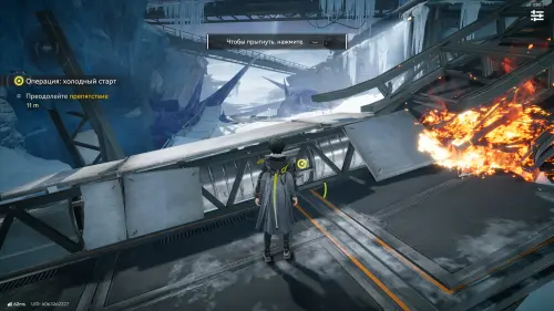 После высадки сразитесь с группой противников, изучив новые элементы боевой системы, например, использование навыков союзников. Продолжайте бежать к базе Центра, сражаясь с различными врагами и изучая новые приемы. Затем вам нужно будет найти способ попасть на базу. Для этого пройдите направо и взаимодействуйте с тросом, чтобы подняться наверх.
