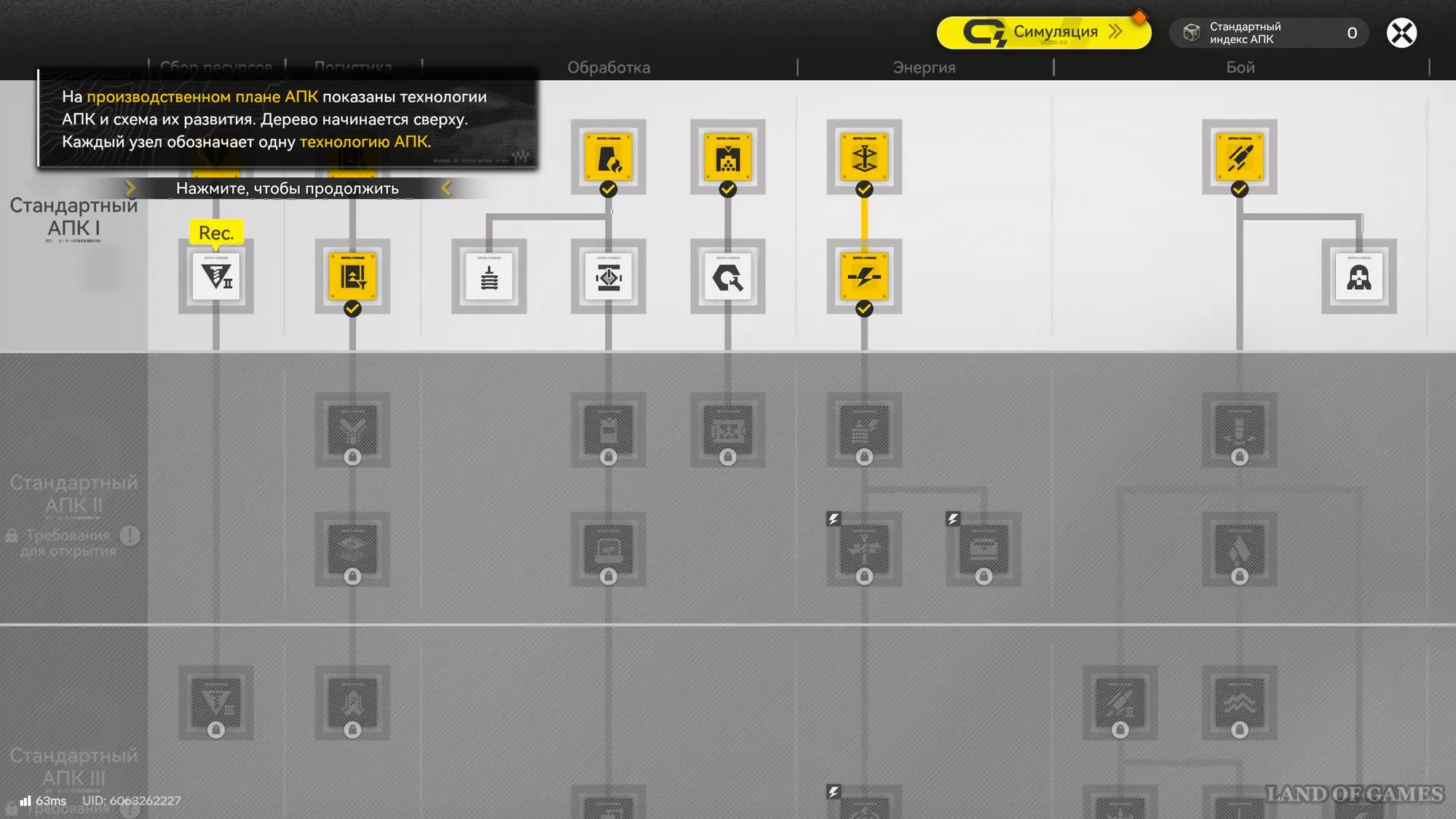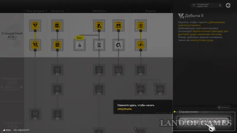 Изучив новое меню, закройте его, а потом подбегите к протокольному регистратору и поболтайте с Покус. Затем взаимодействуйте с регистратором для сбора очков индекса АПК. Снова откройте производственный план и изучите «Добыча II», чтобы получить доступ к добывающим электроустановкам. Потом в справочнике запустите симуляцию.